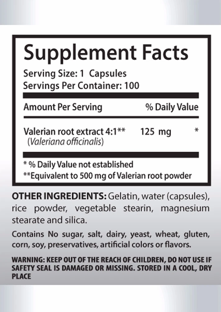 125MG VALERIAN ROOT EXTRACT 4:1 nervous system support control good night’s sleep relax muscles improve digestion blood pressure control 2 BOTTLES WITH 200 CAPSULES What Is Valerian Root? Valerian native to Europe grows wild in grasslands and it is used as a decoration of garden. The Valerian root is pressed into a juice and made into a fine powder and used for health purposes. This extract is readily available in the forms including tablets, tea, and capsules. It has many health benefits such as helping sleep and promoting a feeling of Calm. What Are The Valerian Root Benefits & Uses On Health? Valerian is famous for its numerous health properties. It is used in the natural supplement of , sleep problems, blood pressure, and joint pains. This herb has been used to cope with fatigue, stomach upset, and other conditions. It’s very common for Valerian root to be included in sleep-promoting tea blends, but it doesn’t just offer a solid night’s sleep — it’s also amazing at naturally Calming and can even lower blood pressure, among other tremendous benefits. Valerian Root Benefits – Heart Health Valerian may help in maintaining your heart health. It can strengthen your blood vessels and improve its elasticity. Valerian can also help to normalize the blood pressure. This herb can be a popular choice for many people as it may improve cardiovascular health. As lack of sleep puts you at a far greater risk of several problems such as heart issues, high blood pressure, and many others, this herbal valerian root supplement may be useful in supporting the body function and well-being in general. . Calms This herb has sleep effects, so it is called a help in dealing with sleeplessness. However, its works are a little different from some other types of herbs. Valerian root is used as the natural supplement, not tea. Thus, you ought to use it before bedtime to obtain the highest level of its nature to make sure that you have a sound sleep instead of using this herb before going out. Valerian root increases the amount of a compounds called gamma aminobutyric acid (GABA) in the brain. GABA helps regulate nerve cells and Calms . Lowers Blood Pressure Now that you know that valerian root can be so Calming to the mind and body, it’s probably not surprising to hear it can also help lower blood pressure, improving heart health. The same active components that make valerian root so effective for stress and management can also help the body properly regulate its blood pressure. High blood pressure is something you definitely want to avoid since it increases the chance of heart related problems. Valerian root supplement can help naturally reduce blood pressure and keep it at a healthy level, which has a direct positive impact on your heart health. Great For Digestive Problems Using valerian root may be impressive for digestive problems, it has been traditionally used to improve many stomach issues. This herb may be used for supporting the digestive health of the body. Valerian root is a natural supplement that may relief stress and acts as a muscle relaxant. So it is effective against muscle spasms and problems. It even relaxes the digestive tract’s muscles. Naturally Helps Sleep Valerian root supplement may reduce the time it takes to fall asleep and improves the quality of sleep, so if you can’t sleep, it may be just what you’re looking for. The effects of valerian on poor sleep are significant. Taking this herbal supplement regularly may improve sleep when taking valerian root. Valerian can improve your GABA levels and promote a great night’s rest. Improves Stress Management By reducing and improving the length and quality of sleep, valerian root can significantly help with daily stress management. Stress can make you feel anxious, but can also make you feel more stressed out. By improving GABA levels, valerian makes it easier for both the mind and body to relax. Valerian root is an excellent natural way to help keep your stress down and your quality of life up. Valerian Tea - Valerian Root Extract 4:1 125mg Supplement Facts: Valerian root extract 4:1 (Valeriana officinalis) 125 mg Equivalent to 500 mg of Valerian root powder Other Ingredients: Gelatin, water (capsules), rice powder, vegetable stearin, magnesium stearate and silica. Contains No sugar, salt, dairy, yeast, wheat, gluten, corn, soy, preservatives, artificial colors or flavors. Serving Size: 1 Capsules, Servings Per Container: 100 SUGGESTED USE: As a dietary supplement, adults take one (1) capsule, two (2) to six (6) times daily with meals, or as directed by a health care professional CAUTION: Do not exceed recommended dose. Pregnant or nursing mothers, children under the age of 18, and individuals with a known medical condition should consult a physician before using this or any dietary supplement. WARNING: KEEP OUT OF THE REACH OF CHILDREN, DO NOT USE IF SAFETY SEAL IS DAMAGED OR MISSING. STORED IN A COOL, DRY PLACE. *These statements have not been evaluated by the Food and Drug Administration. This product is not intended to diagnose, treat, cure or prevent any disease. GREAT QUALITY SUPPLEMENTS