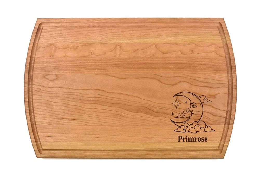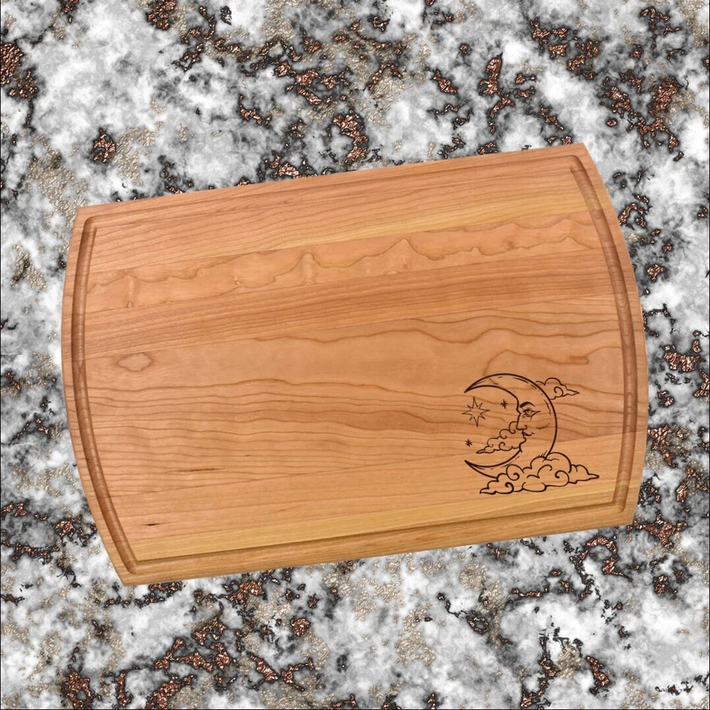 Design: Personalized Moon Clouds Stars Cutting Board or Charcuterie Serving Tray All items ship via USPS - please make sure your address is correct :-) Whether used as a charcuterie serving tray for snacks or cutting board, our bamboo, walnut and cherry custom boards are the perfect addition for the home and make the perfect gift for your loved one celebrating a birthday, anniversary, new home, wedding, etc! *** FEATURES *** • SIZES: We have multiple styles and sizes available. To see our current sizes available, click the drop-down menu. The photo slide contains a photo showing each side by side. Please note, the board with the juice groove only has the groove on the front side of the board. • THICKNESS: Bamboo Boards - Approximately 1/2" Thick; Walnut & Cherry Boards - Approximately 3/4” Thick • UNIQUE: Every board is unique with the grain and coloring varying throughout - no board is the same! • CARE INSTRUCTIONS: Hand wash only with warm water. Do not soak. Please apply mineral oil throughout the board’s life. • PERSONALIZATION/CUSTIMIZATION: Do you want the text placed differently on the board? Please don’t hesitate to contact us. All personalization notes can be entered in the personalization box when checking out. • SHIPPING: All cutting boards ship within 2 to 5 business days. • WHOLESALE ORDERS: Please don’t hesitate to contact us for information about wholesale orders. Processing times for larger orders may change. • NOTE: Colors can vary a bit on different monitors and screens. Any props included in photos are not included. Please be sure to double-check your address to make sure it is accurate for USPS delivery. If a package is returned to us due to an invalid address, the buyer is responsible for all additional shipping charges. We appreciate you supporting small business – best wishes! For items ordered with simple edits, we do not send proofs since the layout doesn't change from the example(s). However, in the event there are requests that change the layout from the example(s), we do send proofs for approval before making the product. If you'd like a proof before we make the product, please note so in the personalization box.