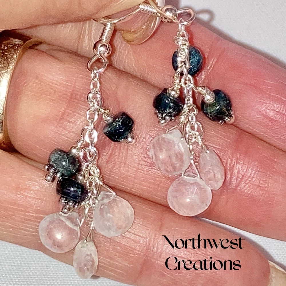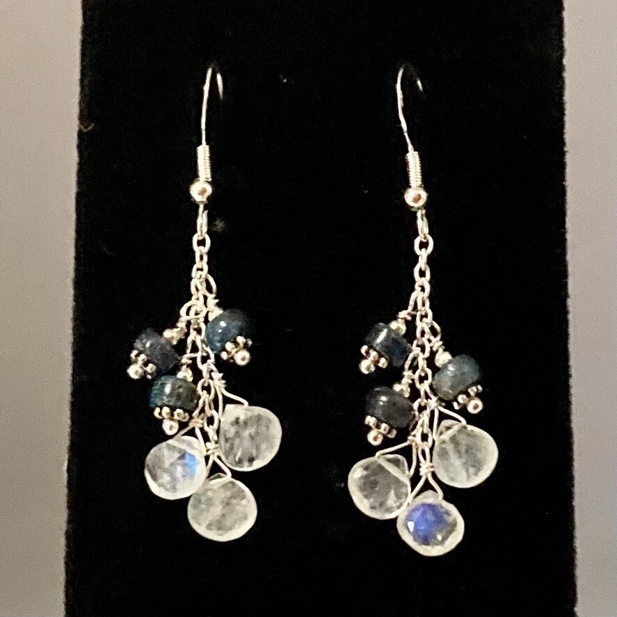 Add a touch of elegance to your outfit with these stunning artisan cluster earrings. The earrings feature a beautiful cluster of moonstone teardrop gemstones, and are accented with shimmering blue kyanite gemstones . The earrings are made of .925 silver and have a French wire closure for easy wear. These earrings are perfect for any occasion, whether it's a casual day out or a special occasion like an anniversary or birthday. They are handcrafted with natural gemstones making them a one of a kind piece. The earrings are designed in a cluster/waterfall design and wire-wrapped for a secure and comfortable fit. Get these beautiful earrings today and add a touch of sophistication to your jewelry collection.