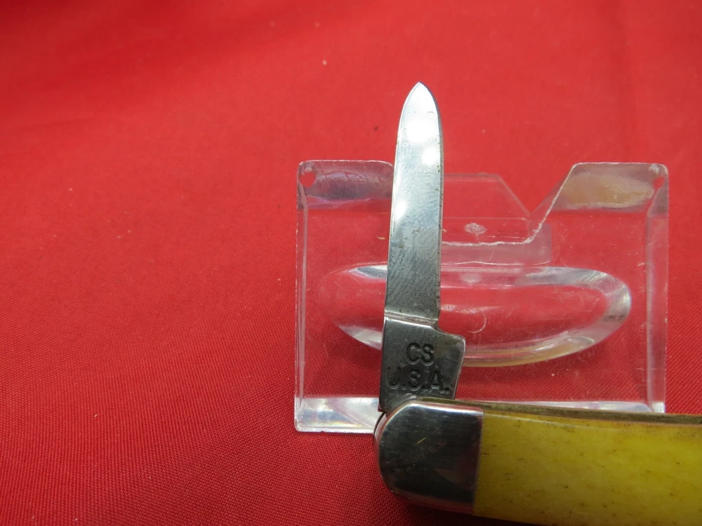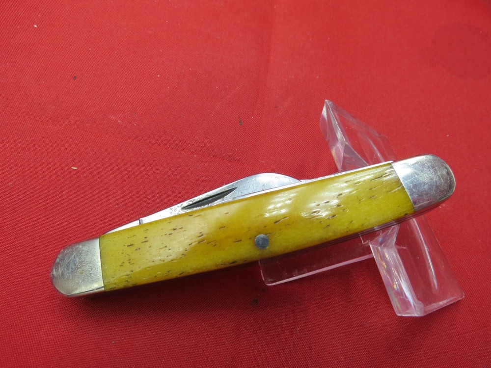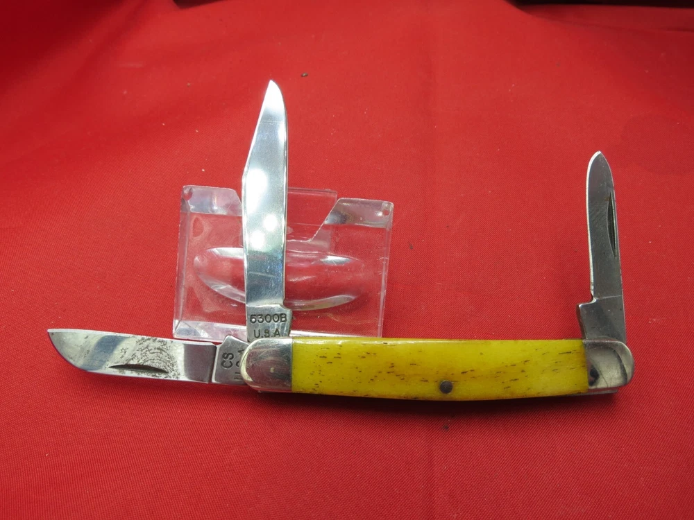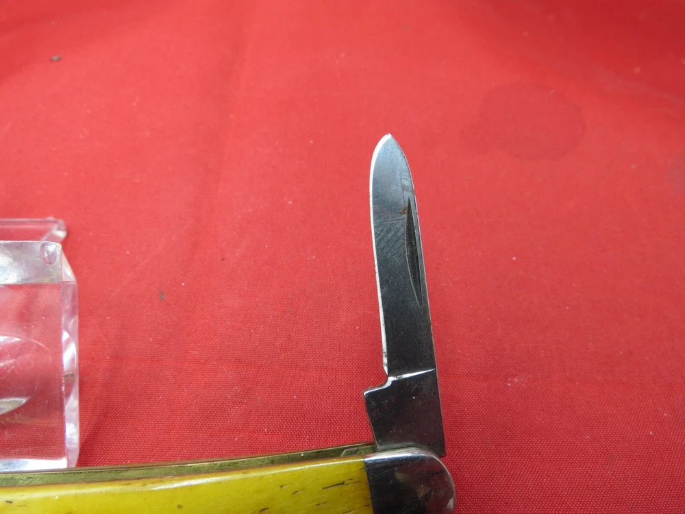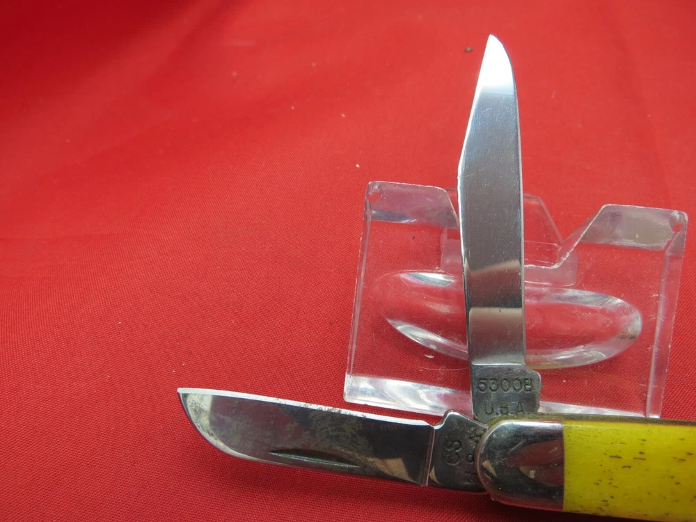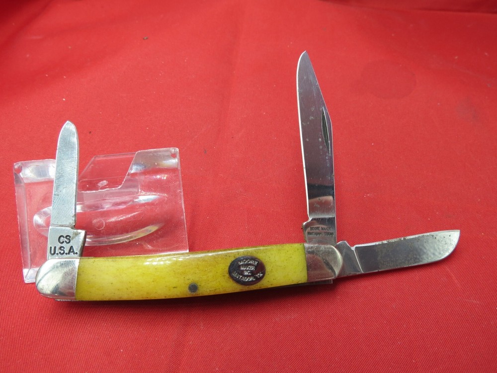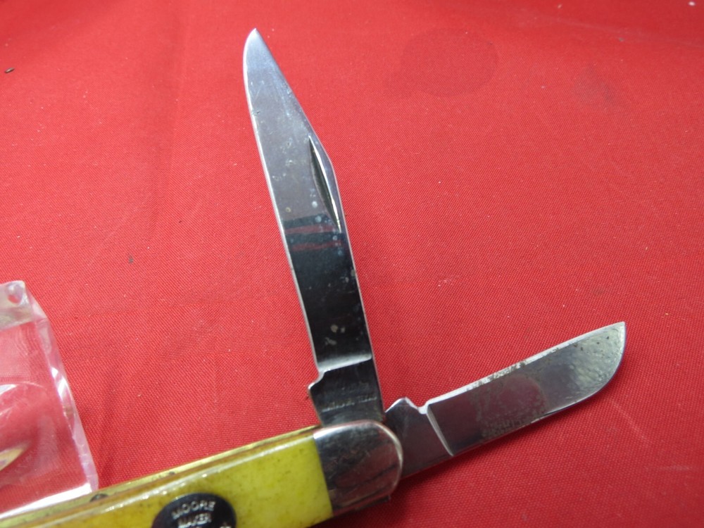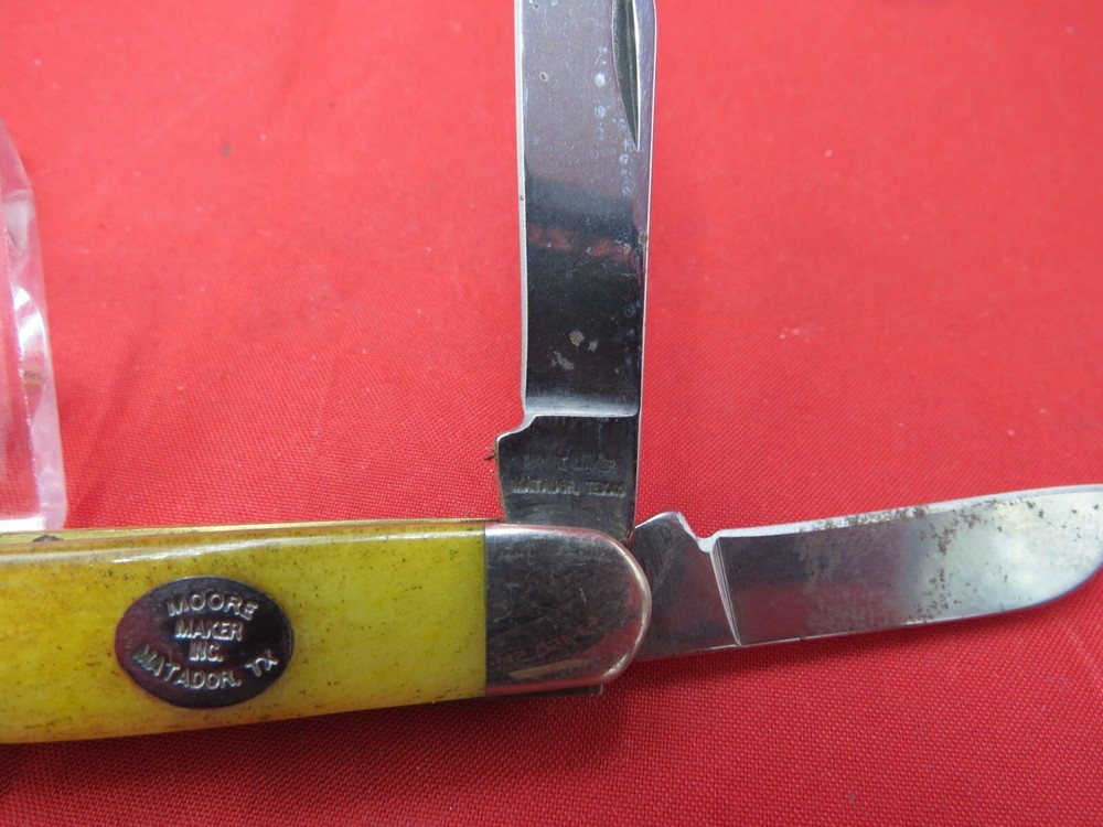 The Moore Maker Matador Texas USA 5300B is a classic pocketknife with a slipjoint lock mechanism. It features a clip point blade type and a striking yellow bone handle, giving it a traditional and collectible look. This stockman style knife has three blades, making it versatile for various cutting tasks. As a modern folding knife, it embodies quality craftsmanship and functionality, ideal for both everyday use and knife collectors. MULTIPLY LISTING MAY VARY SLIGHTLY....CARBON STEEL BLADES MAY HAVE SPOTS.. WE KNOW YOU HAVE A CHOICE WHERE YOU SHOP… THANKS FOR SHOPPING WITH US AT NO PRESSURE SALES,LLC PLEASE BE SURE AND VISIT OUR OTHER ITEMS Thanks for looking YOU WILL RECEIVE THE ITEM PICTURED UNLESS IT IS A MULTIPLE LISTING OR OTHERWISE STATED.ALL BONE KNIVES COME FROM BOVINE (COW) BONE UNLESS OTHERWISE STATED !!