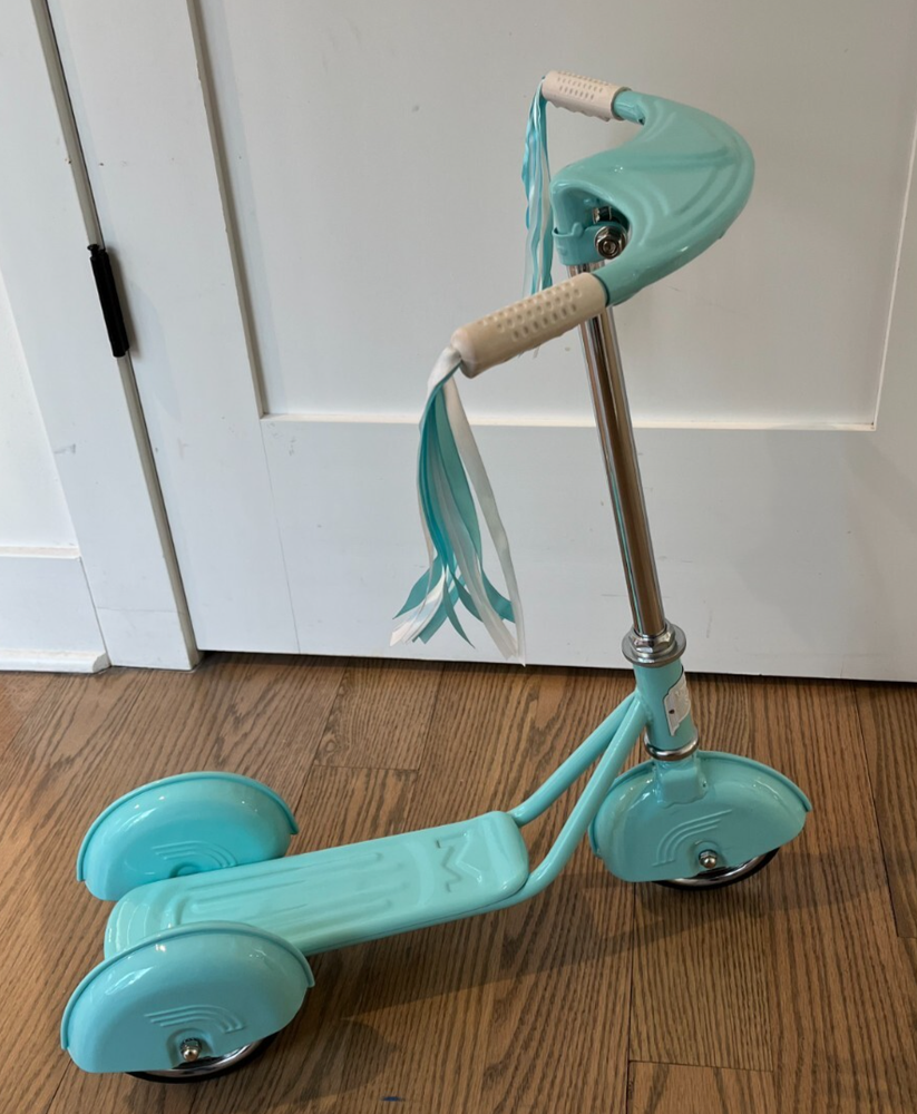 Selling this new in the box Blue/Teal Morgan Cycle 3 Wheel kids scooter. These are brand new. Excellent Construction. The one in the picture is the one I gave to my daughter. Excellent birthday gift! Durable all-steel retro construction Duo rear wheels for upright stability Chromed steel wheels with solid rubber tires Adjustable handlebar height Quick and easy 5 minute assembly From the Manufacturer Morgan Retro Scooter in Red follows the sleek stying of 1930’s retro scooter. Designed for safety and durability, this scooter stands up-right on 3 wheels. Adjustable handlebar height. Features old fashioned pressed-steel construction, with chrome wheels and solid rubber tires. Adult supervision required. A retro favorite, this sleek scooter is designed for safety and durability, and stands up-right on three wheels. It has an adjustable handlebar height. Features old fashioned pressed-steel construction, with chrome wheels and solid rubber tires. Adult supervision required. Holds up to 75 pounds. Measures 23"H x 9"W x 25"D. Features: Durable all-steel retro construction Duo rear wheels for upright stability Chromed steel wheels with solid rubber tires Adjustable handlebar height Quick and easy 5 minute assembly Product Details: Brand: Morgan Cycle Color: Red, Gold Age Range (Description): Adult Weight Limit: 75 Pounds Number of Wheels: 3 Wheel Material: Rubber Frame Material: Alloy Steel Handlebar Type: Adjustable Wheel Type: Solid Manufacturer: Morgan Cycle Brand: Morgan Cycle Color: Red, Gold Age Range (Description): Adult Weight Limit: 75 Pounds Number of Wheels: 3 Wheel Material: Rubber Frame Material: Alloy Steel Handlebar Type: Adjustable Wheel Type: Solid Manufacturer: Morgan Cycle UPC: 838897000151 Brand Name: Morgan Cycle Material: Alloy Steel Part Number: 31216RG Date First Available: April 5, 2011