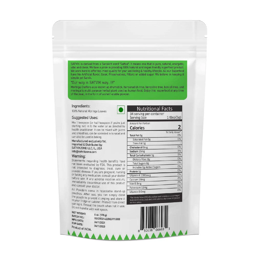 Enjoy this superfood at any time of the year, in the form of shelf stable powder. 100% Natural Vegan Gluten-free Non-GMO Halal Allergen Free No Artificial flavor, color or preservatives added No added Sugar Ingredients: 100% Natural Moringa Powder Suggested Use: Mix 1 teaspoon (or half tea spoon if you're just starting out) into the water or as directed by health practitioner. It can be mixed with juices and smoothies, can be sprinkled in to salad and can also be used in baking. Net Wt.: 6 oz. It comes in resealable stand-up pouch. After use you can simply close the pouch to prevent clumping and store it in your fridge or cabinet. Protect from direct sun light and do not handle with wet spoon. Moringa Powder, 100% Natural, 6 oz, No Added Sugar-SATVIKZONE Enjoy this superfood at any time of the year, in the form of shelf stable powder.100% NaturalVeganGluten-freeNon-GMOHalalAllergen FreeNo Artificial flavor, color or preservatives addedNo added SugarIngredients: 100% Natural Moringa PowderSuggested Use: Mix 1 teaspoon (or half tea spoon if you're just starting out) into the water or as directed by health practitioner. It can be mixed with juices and smoothies, can be sprinkled in to salad and can also be used in baking.Net Wt.: 6 oz.It comes in resealable stand-up pouch. After use you can simply close the pouch to prevent clumping and store it in your fridge or cabinet. Protect from direct sun light and do not handle with wet spoon. Moringa Powder, 100% Natural, 6 oz, No Added Sugar-SATVIKZONE Enjoy this superfood at any time of the year, in the form of shelf stable powder. 100% Natural Vegan Gluten-free Non-GMO Halal Allergen Free No Artificial flavor, color or preservatives added No added Sugar Ingredients: 100% Natural Moringa Powder Suggested Use: Mix 1 teaspoon (or half tea spoon if you're just starting out) into the water or as directed by health practitioner. It can be mixed with juices and smoothies, can be sprinkled in to salad and can also be uséd in baking. Net Wt.: 6 oz. It comes in resealable stand-up pouch. After use you can simply close the pouch to prevent clumping and store it in your fridge or cabinet. Protect from direct sun light and do not handle with wet spoon. × × × × × × × × × Buy now and save! Shipping info Click the Shipping & Payments tab above the listing description for more info Click the Shipping & Payments tab above the listing description for more info! Additional delivery notes PICK UP OPTION Sorry, our items are NOT available for pick-up. PAYMENT Immediate payment is required upon selecting "Buy It Now" or upon checking out through the cart. We accept payment via U.S. PayPal accounts and all Major Credit Cards, Debit Cards & Google Pay. We are legally required to collect sales tax in those states and localities where we maintain a physical presence (nexus). The applicable amount of sales tax charged to an order will be calculated based on the shipment destination's state and local sales tax laws. Thank you for shopping with us on eBay! Additional Information No additional information at this time Ask seller a question You might also like Pineapple Fruit Powder, 100% Natural, 6 oz, No Added Sugar-SATVIKZONE Java Plum Jamun Fruit Powder, 100% Natural, 6 oz, No Added Sugar-SATVIKZONE Mango Fruit Powder, 100% Natural, 6 oz, No Added Sugar-SATVIKZONE Sugarcane Premix Fruit Powder, 100% Natural, 6 oz, No Added Sugar-SATVIKZONE Contact To contact our Customer Service Team, simply click the button here and our Customer Service team will be happy to assist. Ask seller a question © Satvikzone Shipping & Payments Click the Shipping & Payments tab above the listing description for more info Payment Accepted Payment Methods Immediate payment is required upon selecting "Buy It Now" or upon checking out through the cart. We accept payment via U.S. PayPal accounts and all Major Credit Cards, Debit Cards & Google Pay. We are legally required to collect sales tax in those states and localities where we maintain a physical presence (nexus). The applicable amount of sales tax charged to an order will be calculated based on the shipment destination's state and local sales tax laws. Thank you for shopping with us on eBay! Returns Returns are accepted Items must be returned within 30 days of the auction ending Buyer will pay for return shipping. eBay integration by