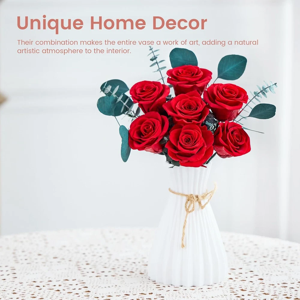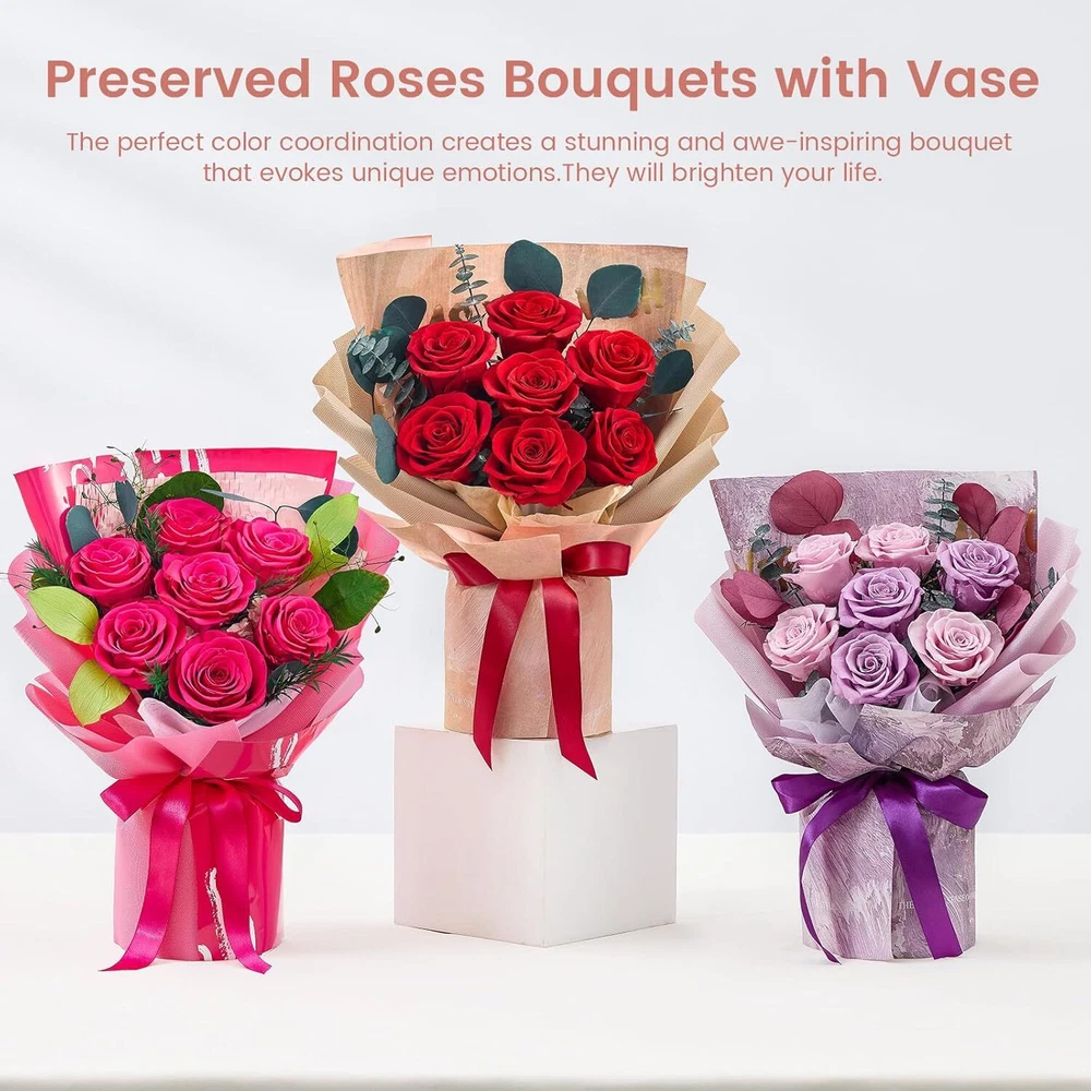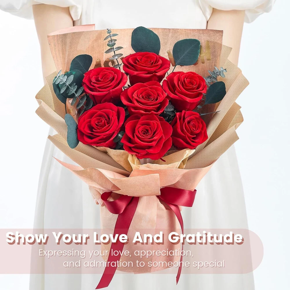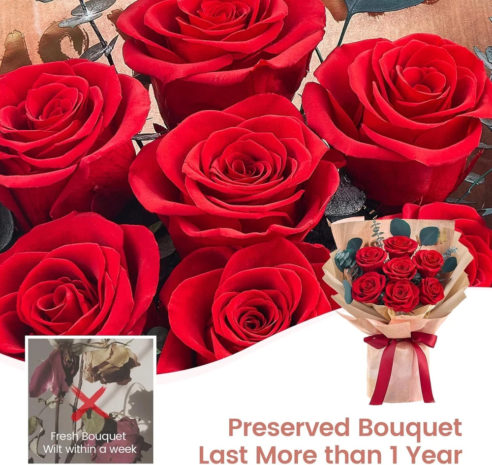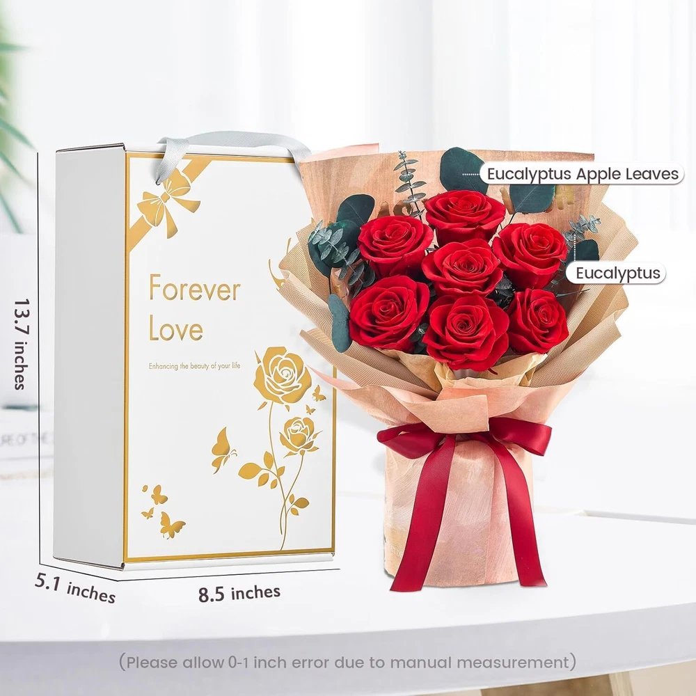 Mosstory Roses Bouquet 7-Piece Forever Flowers Fresh Red Product Details Brand: Mosstory Plant or Animal Product Type: Rose Color: Red Number of Items: 1 Item dimensions L x W x H: 8.5 x 5 x 13.5 inches 100% Real Roses: The 7 piece preserved roses bouquet have long lasting beauty that will sustain their shape and color for over a year. The flower preservation process has been perfected so the preserved roses will look as natural roses as fresh as the day they were picked. Pick a bouquet for her to show your feelings. Handmade Bouquets: The beautiful forever bouquets are designed and handmade by skilled florists, which is elegant and charming. They are handcrafted from real Roses, hydrangea, and eucalyptus apple leaves,etc. Romantic Gifts for Women: The flowers bouquet is a unique and romantic gift to impress others in any occasions, such as Valentines Day, Anniversary, Birthday, Mothers Day, Thanksgiving Day, Christmas Day, Weddings and Graduation. Exquisite Packaging: Packaged in our carefully designed gift box, no need to repackage. The roses bouquets are secured in the box to ensure the bouquets are not damaged during transportation. No Maintanenc:No water or sunlight needed for this rose bouquet. Our rose bouquets not only last for more than a year, but they don't require any work or maintenance from you, you just need to store them in a normal environment (avoid humidity and direct sunlight).