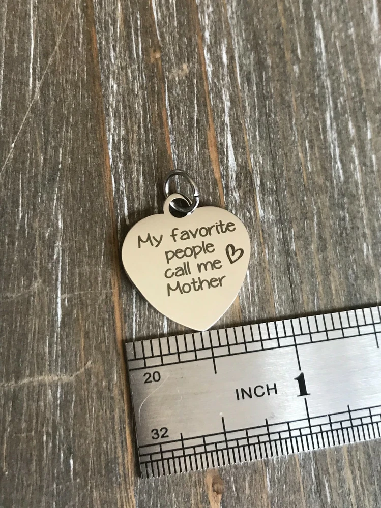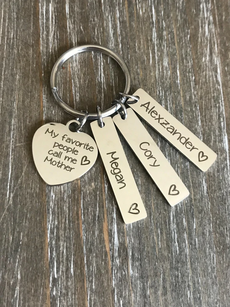Listing is for Completed custom Name Keychain, Keychain includes custom Heart charm with your chose of wording ( up to 34 characters ) and your choice of name bars ( up to 11 characters each, capital letters are 2 characters each ) Each bar will have a heart engraved at end. Key ring is aprrox.1 inch Stainless Steel Custom bar charms are 1 1/4" Stainless Steel Heart charm is 3/4"Stainless Steel Keychain will come in Gift box ready to Gift :) *IMPORTANT* Please be sure to include Names ( up to 11 characters each ) in notes to seller during check out or in messages :) Please be advise capital letters count as 2 characters each. If requests for heart are not left this will come as My favorite people call me Mother Stainless Steel doesn't need polished, will not tarnish and doesn't stain the surrounding skin. It's properties are hypoallergenic for those with metal allergies.
