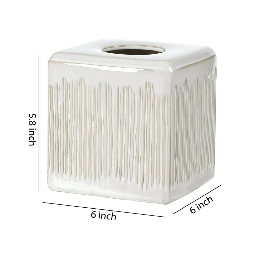 Designed for Style, Function and Efficiency 【Stylish Home Decor】Decorative paper holder and napkin dispenser with featured glossy finish with white body and organic lines makes a luxurious and old-fashioned home décor. Rounded finish offers a smooth and delightful feel to the touch. 【Efficient & Functional】Easy refill and replacement of empty tissue boxes with the open bottom. Perfect weight for effortless pull of tissue papers and firm standing. 【Awesome Gift Idea】Tasteful choice for your friends, family, lover, partner or parents. Gorgeous housewarming, wedding, or holiday gift. 【Built to Last】Gorgeous piece made from high-quality ceramics. Sturdy and durable for everyday use. Extremely enduring for quick and easy cleaning. Rust and mold free. Water-proof and scratch-proof. 【Thoughtfully Sized】Cube tissue box holder fits most standard square tissue boxes. Fit in well in your bathroom, kitchen, bedroom, craft room, on countertop, dresser, bedside table, nightstand, toilet tank. Dimension: 6” Length x 6” width x 6” height.