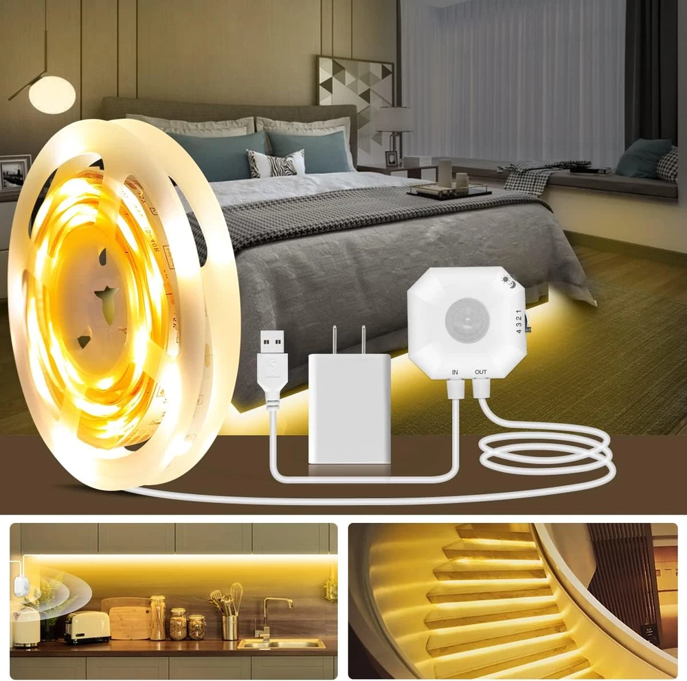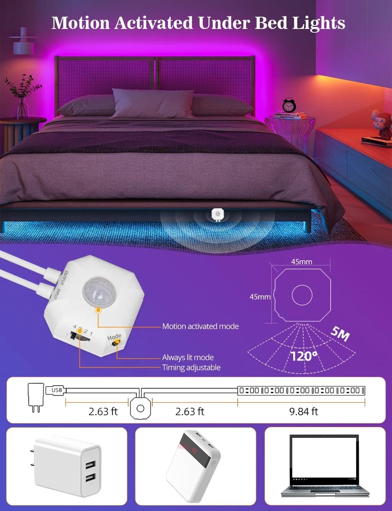 Motion Activated LED Strip Lights, 9.8ft RGB Motion Sensor Under Bed Lights 【Super Brightly LED Lights】9.8ft motion sensor LED light strip, 16.4 ft motion sensor range, Warm and soft motion activated bed light will turn on safely guides you through the room in the dark, allowing your eyes to be more relaxed, softening tones and reducing imperfections, no glare, stable lighting, energy efficient LED lighting that doesn't disturb others, saving you money and the environment. 【Smart Bluetooth APP Control LED Lights】Use your phone to control the wonderful LED lights! Download the free APP "duoCo Strip" in the Apple Store or Google play, then connect the strip lights to power and turn on Bluetooth. The LED lights will automatically connect and display in the device list on the far left of the APP. After successful connection ,Free up your hands to turn on and off the bed light,you can start DIY your unique mood lighting! 【Motion Activated LED Strip Lights】Motion Sensor LED Strip Lights with built-in human passive motion sensor light with auto-off timer, this sensor-based lighting will detects your motion, and it will automatically turn on when human motion is detected within 16.4 feet and turn off after 38/75/150/300 seconds of undetected motion.You can push the 1/2/3/4 mode button on the motion sensor to choose time interval of 38/75/150/300 seconds. 【Widely Used】 Shelf Lights will be a wonderful home decoration for you. for bedroom, living room, home bar, gaming room, bookcase, mirrors, stair. It is also very good to use the led light strips as a Christmas, Halloween, holiday, birthday, home party and wedding atmosphere decoration. Or as a novelty gift for your family, friends, loved ones! 4.4 inches x 4.5 inches x 1.6 inches. Weight: 5.3 oz Light Source Type Motion Sensor LED Strip Lights Style Magic color mode,RGB mode,Color Changing, Motion Sensor Number of Items 1 Power Source Corded Electric Item Dimensions 4.5 x 4.4 x 1.6 inches Number of Light Sources 54 Control Method App, Voice Theme Halloween, Indoor Controller Type App Control Connectivity Protocol Bluetooth Wireless Communication Technology Bluetooth Product Dimensions 4.5 x 4.4 x 1.6 inches; 5.29 ounces Occasion Type Wedding, Christmas, Birthday, Halloween Seasons Christmas, Halloween Additional Features Under Cabinet Lights christmas decorations, Motion Sensor LED Strip Lights Under Bed Lights Indoor/Outdoor Usage Indoor Material Type Polycarbonate Light Color RGB Water Resistance Level Not Water Resistant Connectivity Technology Bluetooth Occasion Wedding, Christmas, Birthday, Halloween Special Feature Under Cabinet Lights christmas decorations, Motion Sensor LED Strip Lights Under Bed Lights Color Multicolor Wattage 5 watts Indoor Outdoor Usage Indoor Voltage 5 Volts Included Components Controller box, Adapter Style Name Magic color mode,RGB mode,Color Changing, Motion Sensor Size 9.8ft