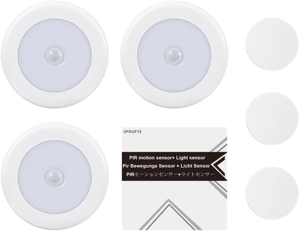 Motion Sensor Light, Cordless Battery-Powered LED Night Light, Stick-Anywhere Design Upgrade - The AMIR Upgraded Motion Sensor Light features a 15% larger design and a remarkable 30% increase in brightness. This ensures you never stumble in the dark, providing clear and bright illumination wherever needed. PIR Motion & Light Sensor - Auto-on within 10 feet, auto-off after 15 seconds of no motion detected helps prolong battery life. It will turn on only when it is dark and when motion is detected Easy Installation - Simple to install, no hard-wiring. With double-sided adhesive pads and built-in magnet, you can stick on anywhere you like Battery Operated - Powered by 3PCS AAA batteries (not included) for coreless installation. To provide you with illumination in areas that have limited or no access to electricity Note: This light can only be turned on in darkness environment. It won't turn on if the light sensor has been detected by the enough light. And Please DO NOT install this light in high temperature place, otherwise, high temperatures will affect the adhesive strip, and then the light will slide easily!! Product Description Battery Operated - Need 3 AAA Batteries. - Tip: Twist to remove the cover. Range of Detecting - Detecting distance :10ft - Detecting angle:120 degrees Enough Light - Provide enough light to make sure you never stumble in the dark. Automatic Sensor - Only turn on in the dark and when motion is detected. - Auto-on within 10 feet, auto-off after about 15 seconds of no motion detected. Specifications: Voltage&Wattage 1.5v, 0.3w Operating temp -20°C-40°C LED Qty 6 LED Light colo Warm White LED life 50,000 hours or more Color temperature 2900K-3300K Note: 1. Please kindly check whether the batteries have been installed in the correct direction. 2. This light can only be turned on in darkness environment. The light won't turn on if the light sensor has been detected by the enough light. 3. If you use Alkaline battery first and then change to zinc-manganese dry battery, the lights might not work as the zinc-manganese dry battery is shorter than the Alkaline battery. 4. The sensor light might not work if you use the infrared heater in winter. The infrared will cause failure of the sensor. However, the light will get back to work in 30 minutes after turning off the heater. 5. Please clean the wall surface to keep it dry and clean, so that the double-sided adhesive pads can be pasted tightly. 4.0 "h x 3.5 "h x 3.5 "h. Weight: 0.14 kg Light Source Type LED Item model number US-UF5Y_3PCS Style Modern Number of Items 3 Power Source Battery Powered Number of Light Sources 6 Control Method Remote Switch Type Push Button Lighting Method Up/Down Light Lamp Type Motion Sensor Light Number of Pieces 3 Room Type Entryway, Bathroom, Kitchen, Bedroom Assembly required Yes Bulb Shape Size S8 Installation Type Countertop,Tabletop Batteries required Yes Product Dimensions 3.5"D x 4"W x 3.5"H Material Plastic Efficiency Highly Efficient Controller Type Remote Control Finish Type Painted Specific Uses For Product Home Included Components Motion Sensor Light Indoor/Outdoor Usage Indoor Brightness 45 Lumen Water Resistance Level Not Water Resistant Item Weight 0.14 Kilograms Connectivity Technology IR Special Feature Motion-Sensor Shade Height 3.5 Inches Bulb Base E26 Medium Shade Color White Mounting Type Ceiling Mount Color Warm White Is Discontinued By Manufacturer No Is Cordless? Yes Base Material Metal Is Waterproof false Shape Round Voltage 0.5 Volts Recommended Uses For Product Decoration Shade Material Metal Finish types Painted Size 3-Pack