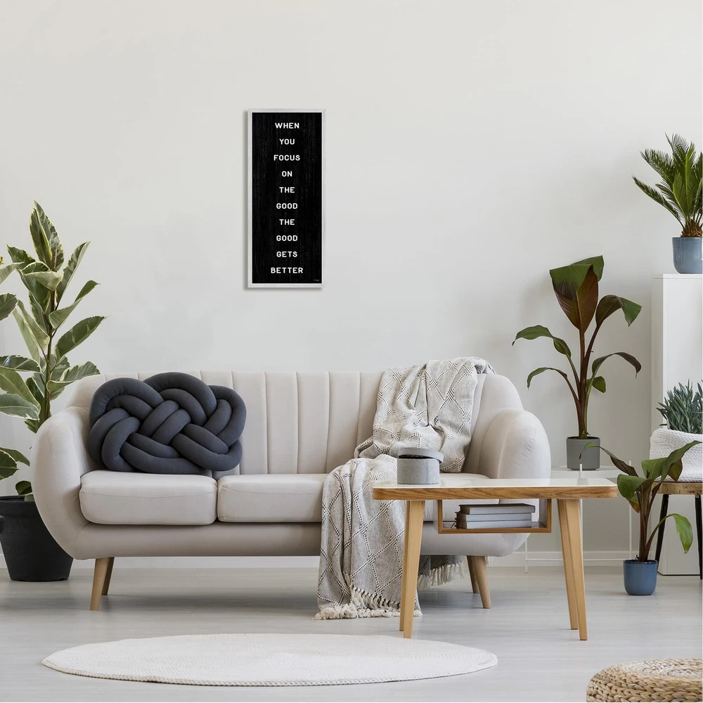 Framed Giclee Sizes Include Standard: 10 x 1.5 x 24 Large: 13 x 1.5 x 30 Wall Art is Ready to Hang with Hardware Free Hanging. No installation required. For Easy Set Up Lean or Layer Artwork on Shelf or Against Wall. Our giclée prints are carefully mounted on a durable MDF backing, and then perfectly finished in a 1.5 inch thick woodgrain frame. Mounted frame colors include black, gray farmhouse and white. Made In USA. Artwork Relates To: Phrase, Black, Rustic, When You Focus On The Good The Good Gets Better Design by Jaxn Blvd.