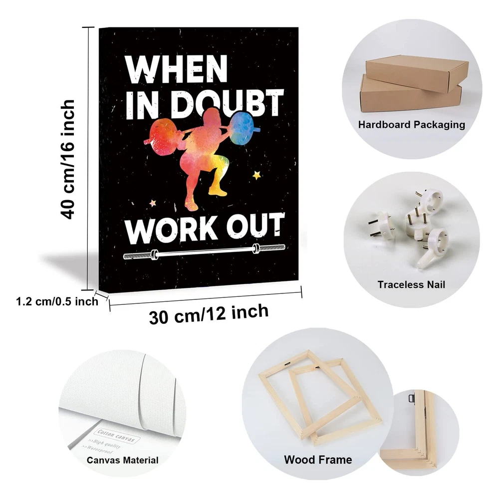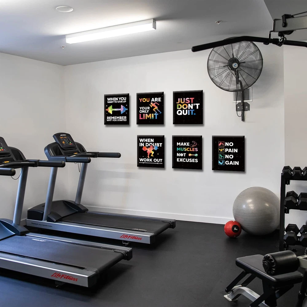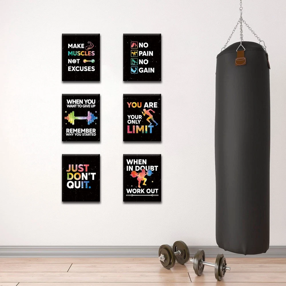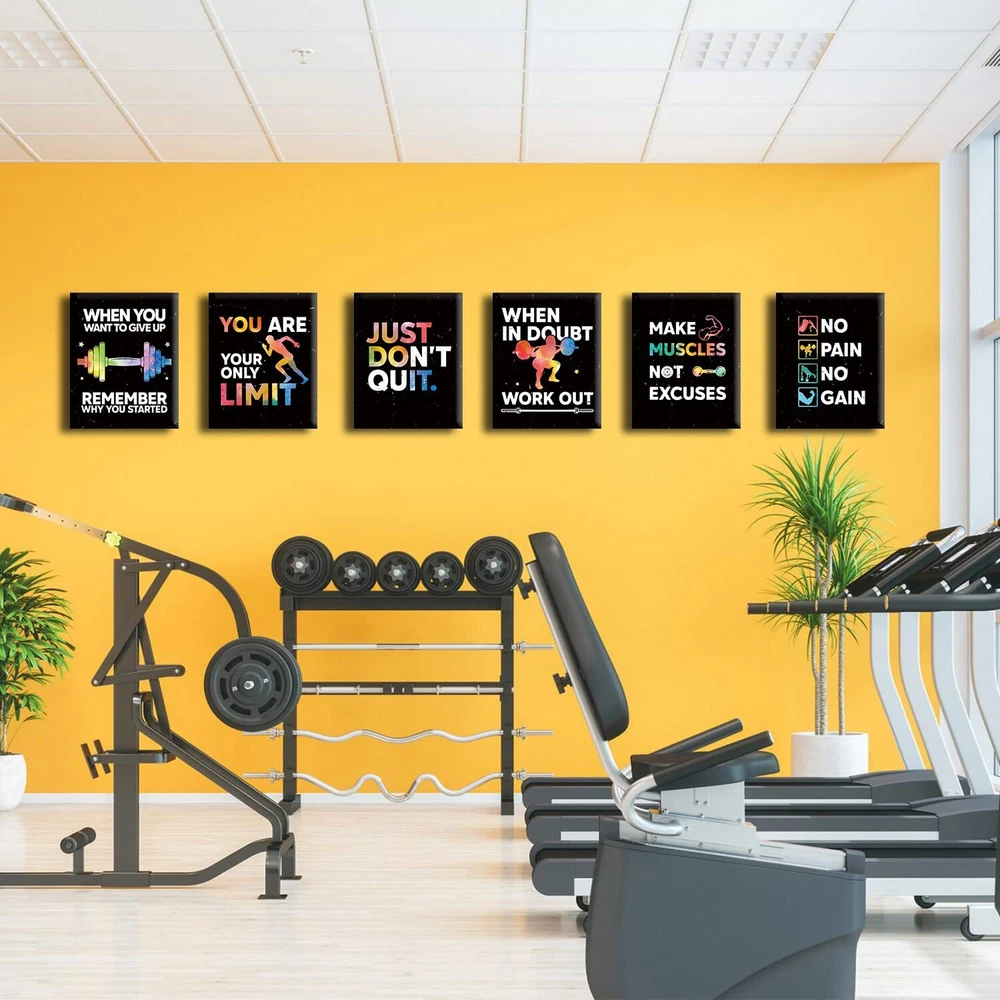 【Motivational Wall Art】 Are you looking for a decoration to create an inspiring atmosphere? Our positive quotes art print can create an inspirational atmosphere and catch eyes with its highlight design. 【Ready to Hang】Each wall art is stretched tightly over a solid wood frame, and our package includes traceless nail accessories so it’s easy to hang our wall decor when you get the product. With the set of 6 (12 x 16 inch/30 x 40cm) It’s a perfect decor set for your gym room. 【Durable Waterproof Material】Our gym wall decor is made of high-quality canvas and ink, the canvas material can prevent the art from damage of water and is not easy to break, wrinkle or fade, can be applied for a long time. 【Hardboard Packaging】We use hardboard box to package our product, keeping your product safe in the delivery. 【Perfect Customer Service】Each of our gym wall art will be carefully checked before delivery to make sure you receive a flawless wall art. If you have any questions after receiving the goods, please contact us, we will provide you with a perfect solution. Make sure you have a great shopping experience.