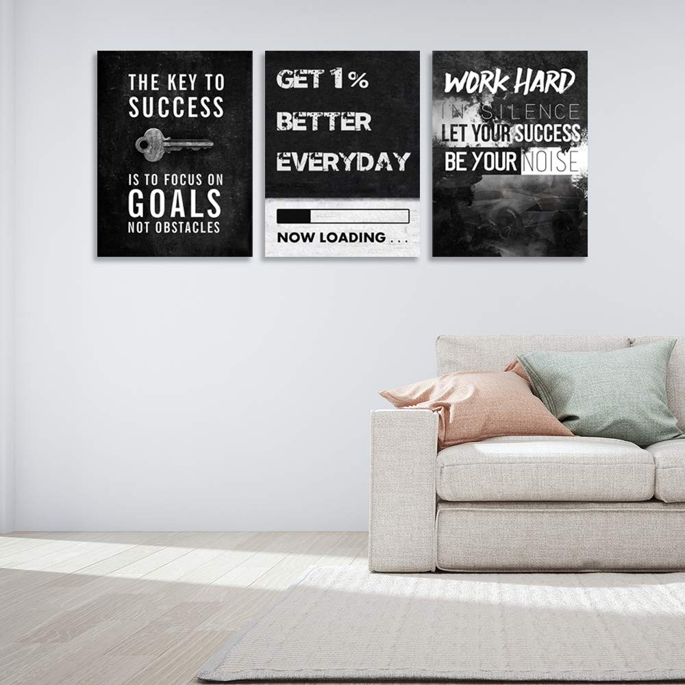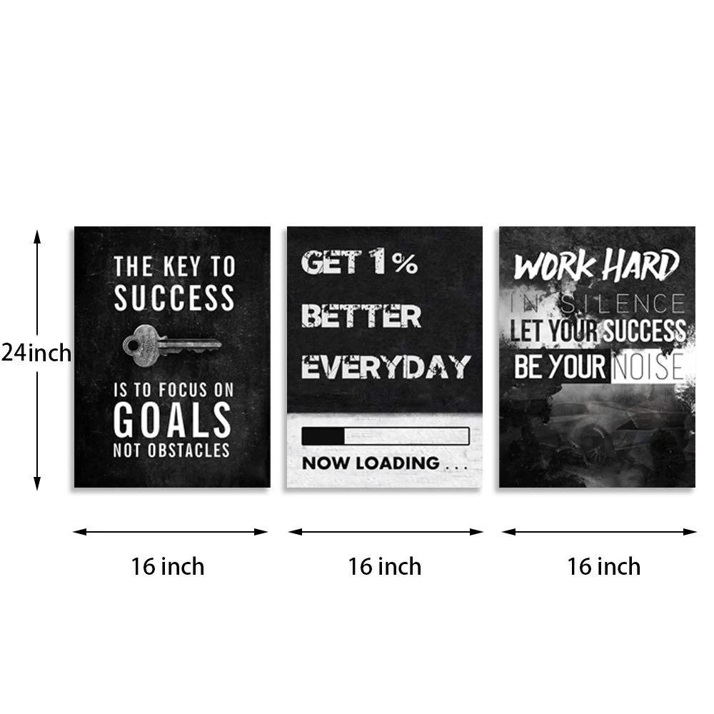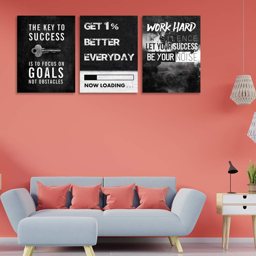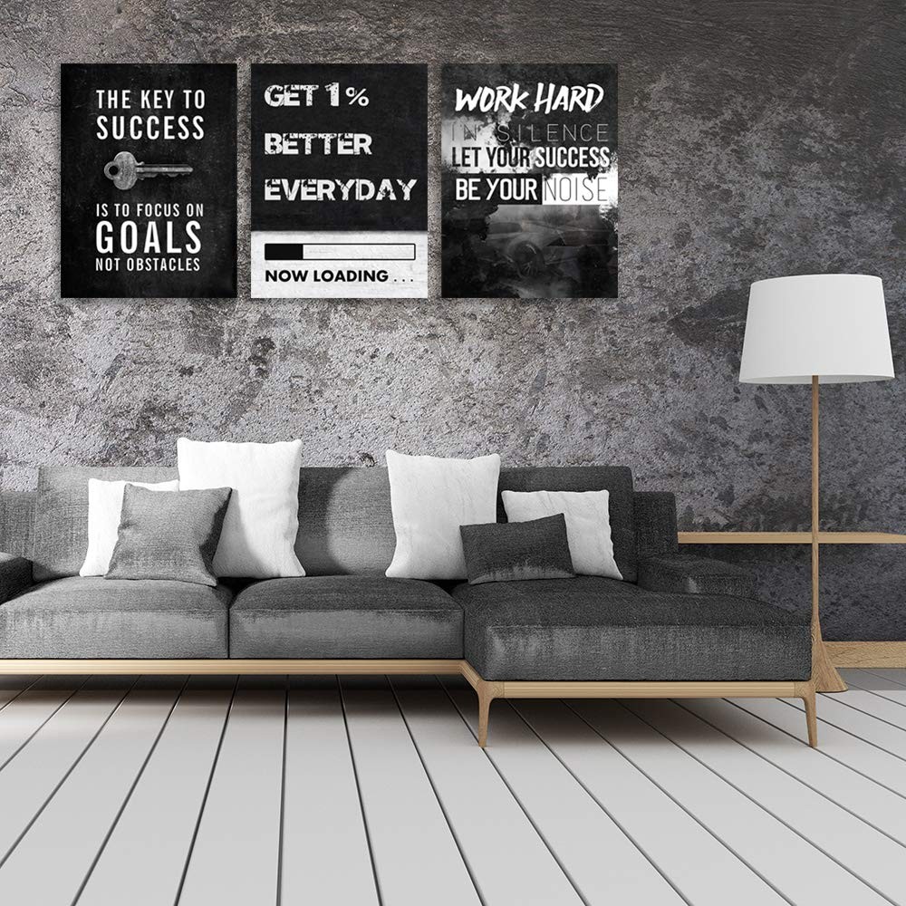 Motivational wall decor inspirational wall decor for office canvas wall art decor poster prints wall art wall decor perfect art for your home, kitchen, living room, bedroom or office. Motivational Wall Decor Inspirational Canvas Wall Art Size: 16 inch x24 inch x 3 peices. A set of three, each inspirational posters is 16 inch x 24 inch. Motivational Posters Inspirational Canvas Picture Paintings Wall Art Material:Canvas wall art are printed on exquisitely textured canvas. The color is vivid and shiny Stand Out Design: Hang motivational posters in your office or bedroom, inspirational posters will wake you up and continue to inspire you to pursue your dreams and goals. Give you positive courage and a good attitude Ready to Hang: Inspirational poster motivational wall decor print artwork has been stretched and framed in a wooden frame and can be hung directly. Each panel has a black hook already mounted on the wooden bar for easy hanging Wide Range Of Uses: Wall Art Decoration for Home Bedroom, Living Room, Office, Kitchen, Gym, Dorm etc.It is a choice for Christmas or birthdays. Motivational wall decor can decorate your space well and add luster to your wall decor