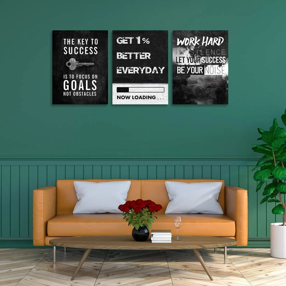Motivational Wall Decor Inspirational Canvas Wall Art Size : 12 inch x 16inch x 3 peices. A set of three, each inspirational posters is 12 inch x 16 inch. Motivational Posters Inspirational Canvas Picture Paintings Wall Art Material:Canvas wall art are printed on exquisitely textured canvas. The color is vivid and shiny Stand Out Design: Hang motivational posters in your office or bedroom, inspirational posters will wake you up and continue to inspire you to pursue your dreams and goals. Give you positive courage and a good attitude Ready to Hang: Inspirational poster motivational wall decor print artwork has been stretched and framed in a wooden frame and can be hung directly. Each panel has a black hook already mounted on the wooden bar for easy hanging Wide Range Of Uses: Wall Art Decoration for Home Bedroom, Living Room, Office, Kitchen, Gym, Dorm etc.It is a choice for Christmas or birthdays. Motivational wall decor can decorate your space well and add luster to your wall decor