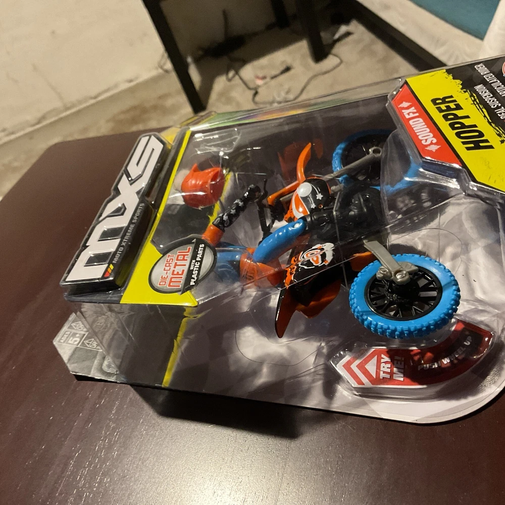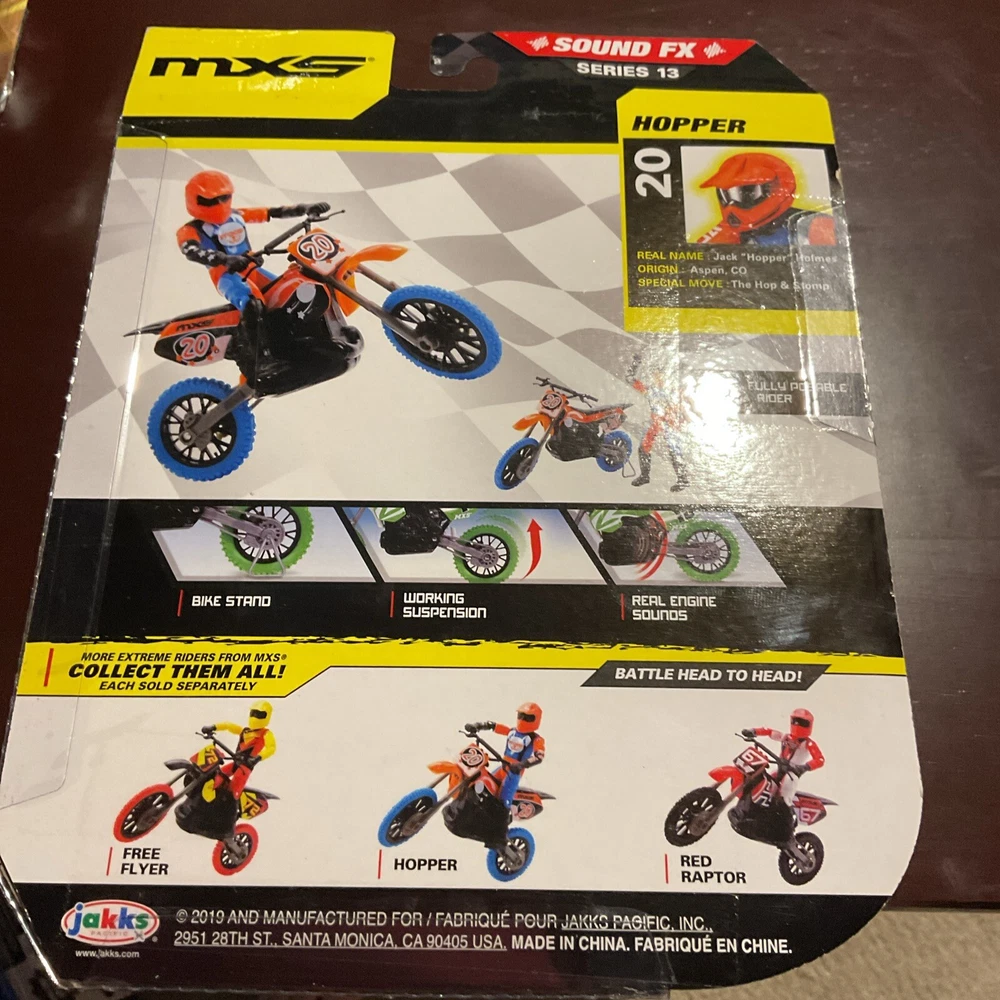 Get ready for some extreme sports action with the Moto Xtreme Sports Sound FX Hopper Fully Poseable Figure by Jakks. This 2019 series 13 action figure features #20 Jack "Hopper" Holmes, a die-cast metal rider with plastic parts, riding a motorbike with a realistic suspension and articulated rider. The figure comes with a bike stand, helmet, and other items, making it a perfect addition to any motocross enthusiast's collection. The figure is lightweight, weighing only 5.3 ounces, and is made in China. It is part of the Moto Extreme Sports franchise and series 13, and is an ideal gift for anyone who loves action figures or motocross.