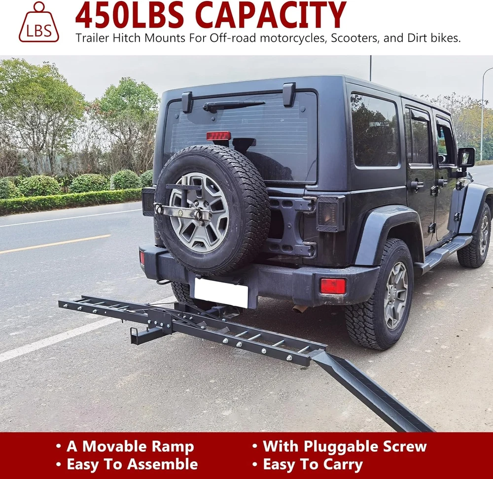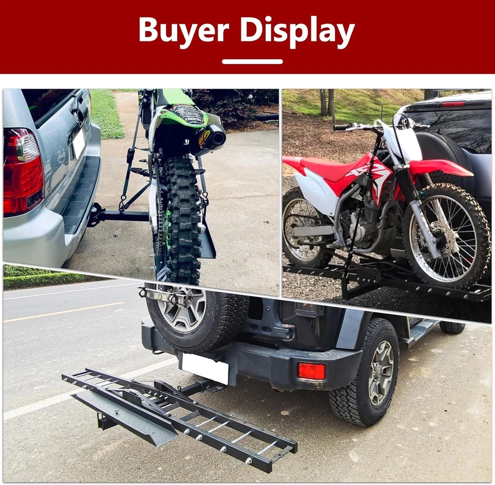 Store New Arrivals Add to Favorite View Feedback Contact Motorcycle Hitch Carrier, 500LBS Heavy Duty Steel Dirt Bike Carrier with Loading Ramp, Anti-Tilt Locking Device, Motorcycle Rack for Dirt Bike Hitch Hauler Description Item dimensions L x W x H 38.4 x 8.5 x 11.8 inches Vehicle Service Type Motorcycle, Scooter, Bicycle, Trailer Material Alloy Steel Mounting Type Hitch Mount Item Dimensions 38.4 x 8.5 x 11.8 inches Color Black Material Type Alloy Steel Load Capacity 500 Pounds Compatible with Vehicle Type Motorcycle, Scooter, Bicycle, Trailer Is Foldable No Versatile Transportation Tool: 500 lbs. maximum weight capacity. Ideal for mounting on car trailers, transporting dirt bikes, scooters, bicycles, buggies, light motorcycles and more. Comes with a self-storing ramp that can be secured to the transport vehicle during transportation. High Quality Material: Our motorcycle hitch carrier adopts heavy steel structure, high strength, more durable. Surface black coating, not easy to rust. The overall dimensions of the carrier are 75.2"x 7.7", with the loading ramp measuring 37"x 4.72". This carrier is designed for use with 2" square receivers. Safe and Stability: Removable loading ramp design, allows you to load and unload motorcycles from both sides. In addition, motorcycle trailers are equipped with anti-tilt locking devices. Even on bumpy roads, it can prevent the motorcycle behind from shaking. The ramp can be temporarily stored while driving and is equipped with pluggable screw. Quick assembly: Our buggy hitch rack comes with a full range of accessories and all mounting holes match perfectly. The instructions are clear and concise, quick and easy to install and operate. NOTE: Before loading your motorcycle, remember to do a final check of all bolts and fixtures to ensure safety. Product Description Vehicle Service Type: Motorcycle, Scooter, Bicycle. Note: 1. Remember to finish final inspection of all bolts and mounts before the loading of motorcycle to ensure safety. 2. If you have any concerns or questions, please feel free to contact. ABOUT US We offer the best prices around on high quality products. Our E-store includes media such as books, movies, music and games while offering electronics, toys, sporting apparel, clothing, tools, general home, garden items and more. SHIPPING We are always working hard to ensure your package arrives as soon as possible. Please understand that some factors like weather, high postal traffic, and the performance of shipping companies are outside of our control. We offer free shipping to the lower 48 states and ship within 2 business days of payment, usually sooner. We do not accept P.O. Boxes. Please provide a physical address. For shipping outside of the continental USA, we only use eBay's Global Shipping Program.The item is shipped to KY and then sent to the rest of the world. International customers are responsible for all duties and taxes. Continue to check out in order to calculate costs for shipping the item to your country. Messages regarding eBay's Global Shipping Program MUST be directed at eBay EXCLUSIVELY. RETURNS We offer a 30-Day Return Policy on items which you are not completely satisfied with. You have the option for a full-refund or an exchange of the item. No returns are available on items shipped outside of the USA. PAYMENT We accept PayPal. CONTACT US This page content is yet to come Please ad us to your favorite seller and visit again later Thank You CUSTOMER SATISFACTION We try our very best to make sure every customer is completely satisfied. If there's a problem, message us! We're happy to help. WE ACCEPT Copyright © 2021 AutoDS. | All Rights Reserved