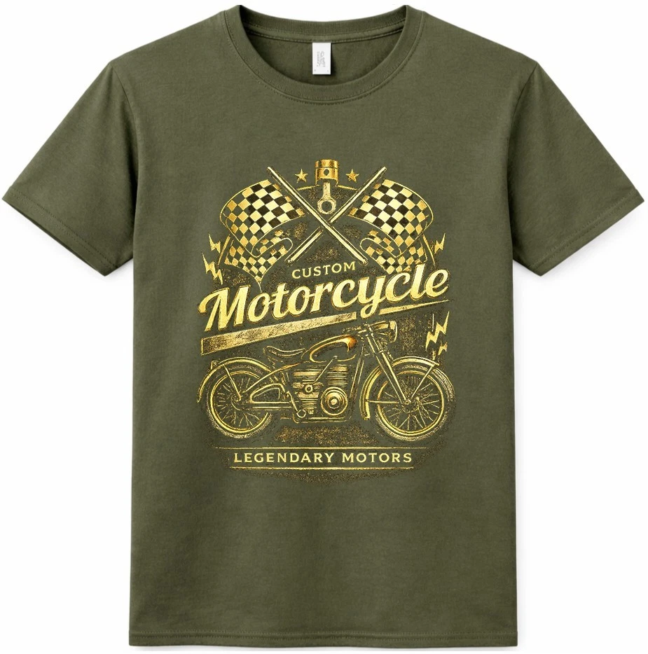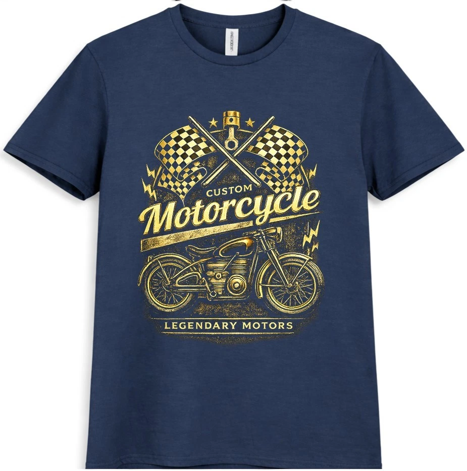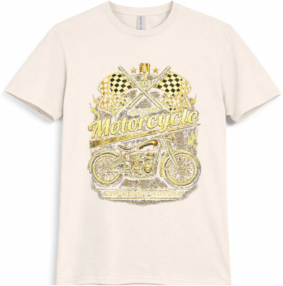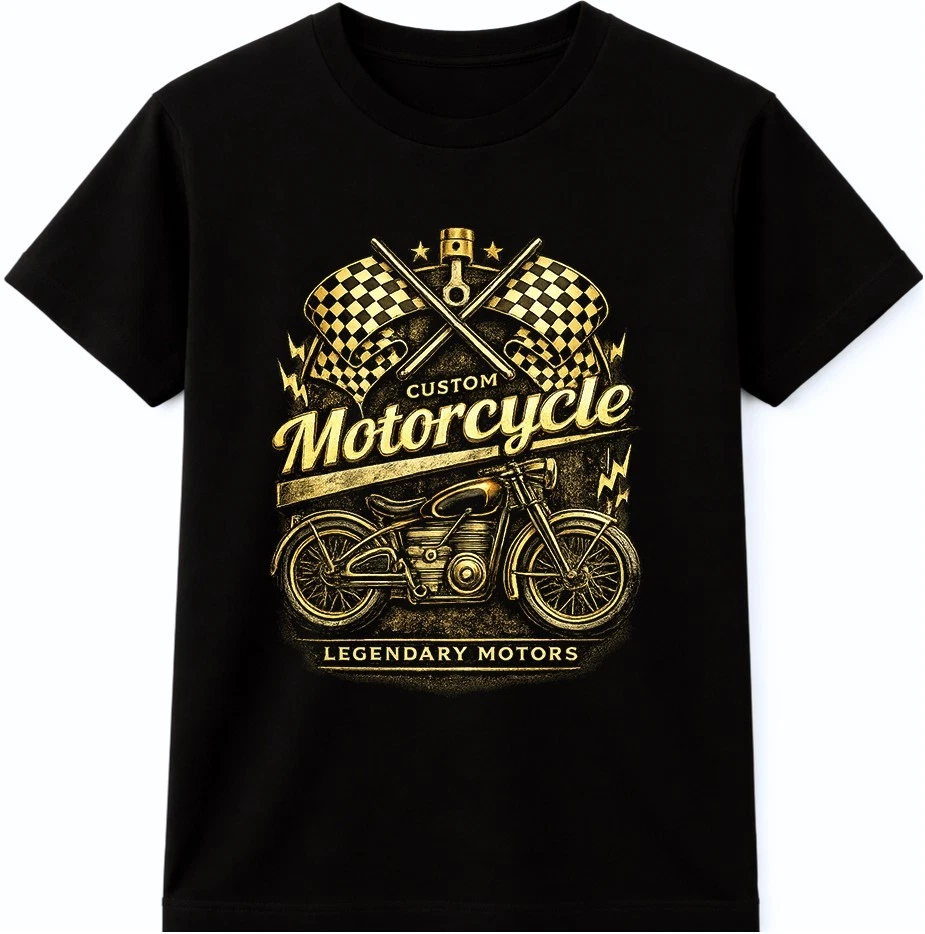 Turn heads with this black custom motorcycle graphic t-shirt designed for true biker style. Featuring a bold gold vintage motorcycle print with racing flags, this tee delivers a classic retro motors look that never goes out of fashion. Made for comfort and everyday wear, it’s perfect for riders, motorcycle lovers, and anyone who loves bold streetwear. Easy to pair with jeans or jackets, this motorcycle t-shirt is ideal for casual wear, bike meets, and gifting. This custom motorcycle graphic t-shirt is designed for those who live and breathe biker culture. Crafted in a classic black color, it features a striking gold vintage motorcycle design accented with racing flags for a bold retro motors aesthetic. The detailed artwork gives the shirt a rugged, timeless look that appeals to motorcycle enthusiasts, riders, and fans of classic motorbike style. Made for comfort and durability, this motorcycle t-shirt is suitable for daily wear, casual outings, bike events, or weekend rides. The versatile design pairs effortlessly with denim, leather jackets, or streetwear outfits, making it a must-have addition to any biker wardrobe. Whether you’re buying it for yourself or as a gift, this vintage biker graphic tee delivers standout style and lasting appeal.