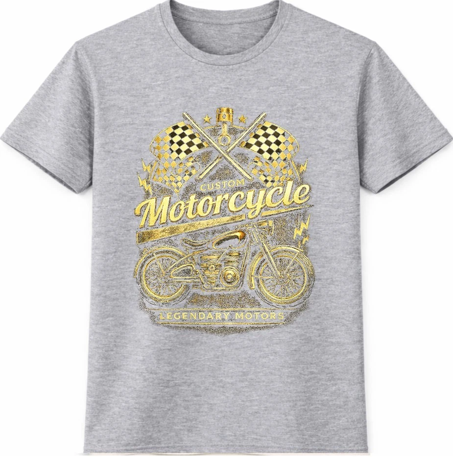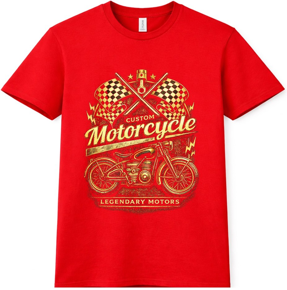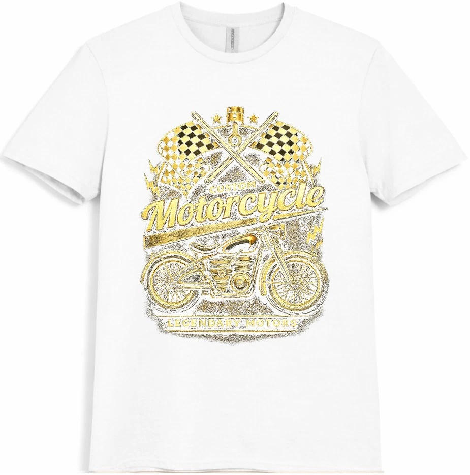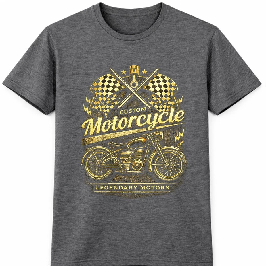 Turn heads with this black custom motorcycle graphic t-shirt designed for true biker style. Featuring a bold gold vintage motorcycle print with racing flags, this tee delivers a classic retro motors look that never goes out of fashion. Made for comfort and everyday wear, it’s perfect for riders, motorcycle lovers, and anyone who loves bold streetwear. Easy to pair with jeans or jackets, this motorcycle t-shirt is ideal for casual wear, bike meets, and gifting. This custom motorcycle graphic t-shirt is designed for those who live and breathe biker culture. Crafted in a classic black color, it features a striking gold vintage motorcycle design accented with racing flags for a bold retro motors aesthetic. The detailed artwork gives the shirt a rugged, timeless look that appeals to motorcycle enthusiasts, riders, and fans of classic motorbike style. Made for comfort and durability, this motorcycle t-shirt is suitable for daily wear, casual outings, bike events, or weekend rides. The versatile design pairs effortlessly with denim, leather jackets, or streetwear outfits, making it a must-have addition to any biker wardrobe. Whether you’re buying it for yourself or as a gift, this vintage biker graphic tee delivers standout style and lasting appeal.