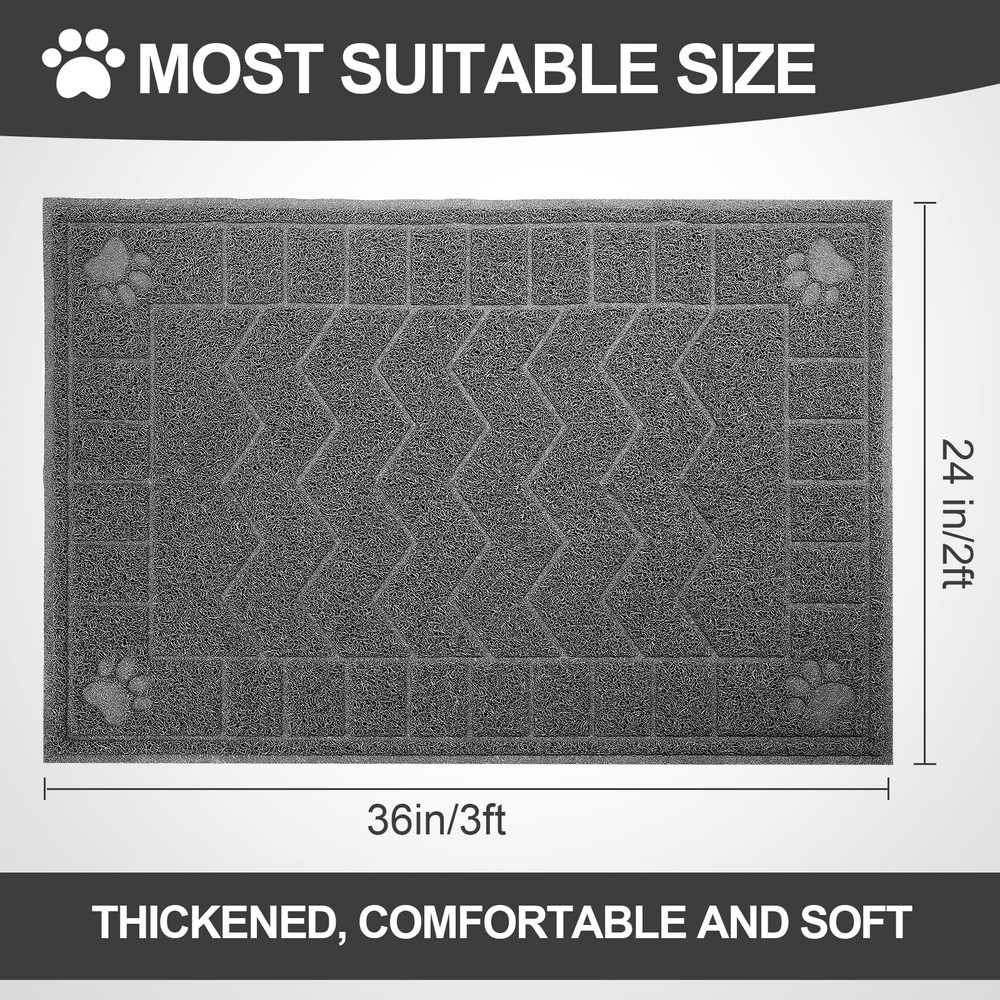 Motsamla Cat Litter Box Mat, 35" x 24" Large Kitty 1 Count (Pack of 1), Grey Product Details Premium Large PVC Cat Litter Mat: Generous 35" x 23" floor mat made of environmental PVC materials. Our large and generous size means more scatter control around the cat litter box, reducing your cleaning. New Design - Litter Trapper: The cat pad is made of durable material; the top has thick mesh coils to effectively grab litter, we have improved our design based on repeated testing, using a combination of indentation and high-quality mesh to catch litter, most of which is left on the mat, not the floor, effectively solving your cleaning problem. Gentle and Safe on Paws: The mat is made of super soft material, super soft on sensitive paws, your cat is comfortable walking on it and even a good place to rest; the mat does not contain any harmful substances (BPA Free), Measures 23" x 35" Multi-Purpose Mat: Simple and stylish mat can also be used as indoor and outdoor door mat, welcome mat, front door mat, cat litter mat, pet feeding mat. Anti-slip and waterproof function can be used for indoor and outdoor welcome mat , kitchen, toilet, bedroom, back door, laundry room, living room, etc. Easy to Clean: Simply shake off, vacuum, or soap up and rinse down. Your cat mat will be as good as new. Plus, this deluxe litter trapper comes with peace of mind. If not satisfied, please contact us, we will deal with after-sales problems for you.
