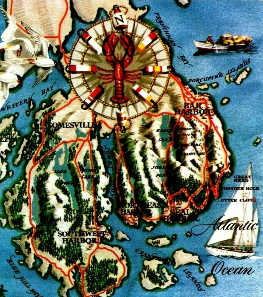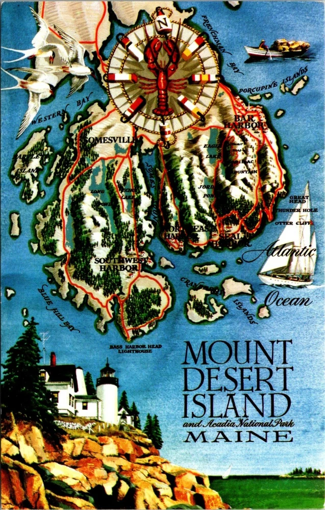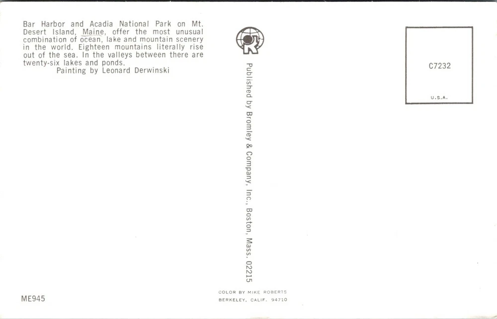 UNUSED: Mount Desert Island and Acadia National Park Maine CAPTION : Bar Harbor and Acadia National Park on Mt. Desert Island, Maine, offer the most unusual combination of ocean, lake and mountain scenery in the world. Eighteen mountains literally rise out of the sea. In the valleys between there are twenty-six lakes and ponds. Painting by Leonard Derwinski PUBLISHER : Bromley and Company, Inc, Boston, Mass Color by Mike Roberts POSTCARD ID #: C7232 & ME945 POSTMARK: NONE - Not Used Postally POSTCARD SIZE : Standard Please view the images, as they are part of the description. "Postcard is from a previous collection, and shows normal wear and tear for its age; as such, it may contain peeling, corner bumps, creases and writing/marks. We try to highlight any obvious flaws; please view the photos, including the zoom feature, to gauge the condition of the card, as these images are part of the description" Each postcard is sleeved in a clear 2mil sleeve made out of polyethylene, polypropylene and polyester. All of these materials have passed the Photo Activity Test (P.A.T.) certifying that they are safe for long-term storage. Thank you for looking! Good luck on your bidding.