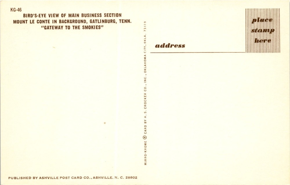MAKE AN OFFER. THE MORE YOU BUY THE BETTER DEAL I WILL ACCEPT This postcard features a bird's-eye view of the main business section of Gatlinburg, Tennessee, with Mount Le Conte in the background. Gatlinburg is known as the Gateway to the Smokies due to its location at the entrance of the Great Smoky Mountains National Park.