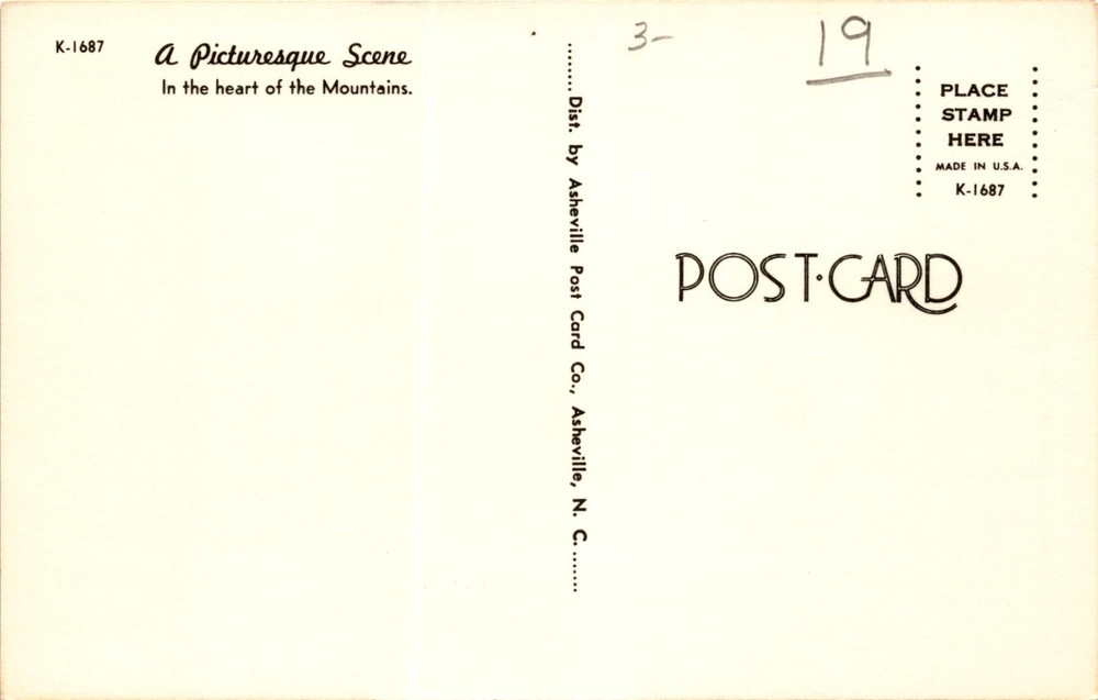 The postcard features a picturesque scene in the heart of the mountains, likely depicting a beautiful landscape or natural setting. It is distributed by the Asheville Post Card Co. in Asheville, North Carolina, and is made in the USA. The postcard is labeled with the code K-1687, possibly indicating a specific series or collection of postcards.