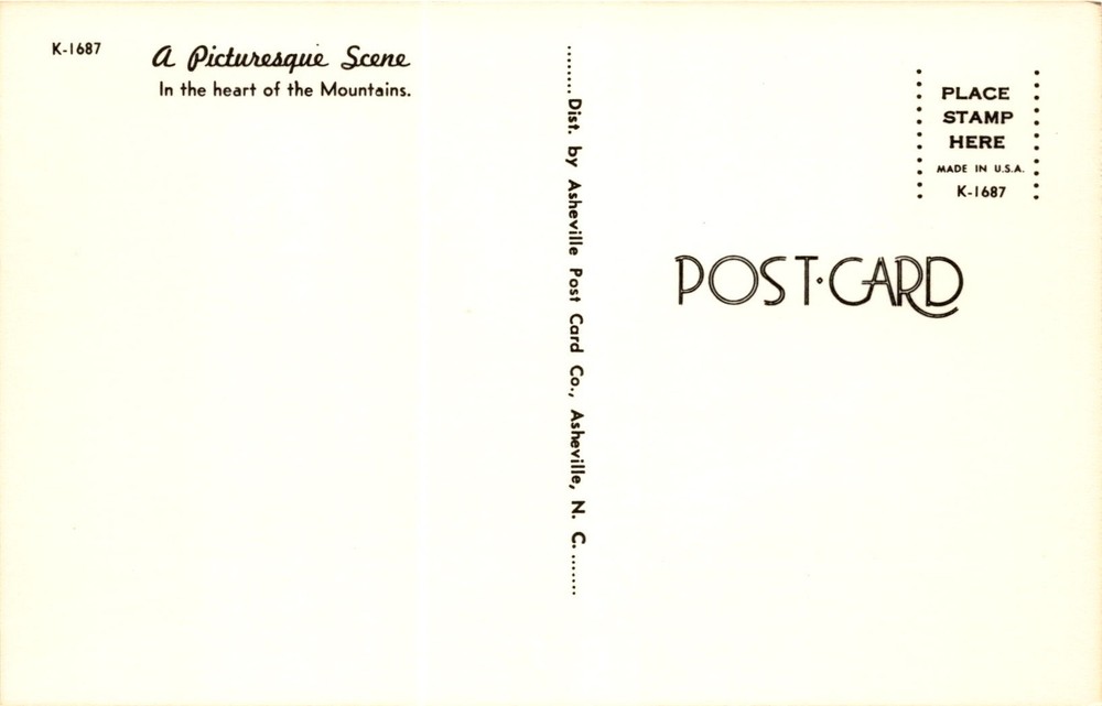 MAKE AN OFFER. THE MORE YOU BUY THE BETTER DEAL I WILL ACCEPT The postcard features a picturesque scene in the heart of the mountains. It was distributed by the Asheville Post Card Co. in Asheville, North Carolina. The postcard is made in the USA and has a designated spot for a stamp. The scene depicted on the postcard is likely a beautiful and scenic view from the mountains, showcasing the natural beauty of the area.