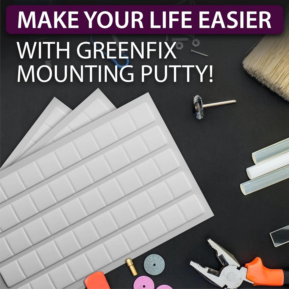 Mounting Putty 250PCs - Poster for Walls Removable Non Marking - White Product Details Package Dimensions : 17.48 x 6.73 x 3.27 inches; 3.57 Pounds Item model number : MP250W Manufacturer : GreenFix Country of Origin : China Material: Putty Brand: GreenFix Color: White Installation Type: Self-Adhesive Unit Count: 250 Count ✅ BEST QUALITY & DIMENSIONS: GreenFix poster putty set is made of premium quality non-toxic materials. Putty set includes 250pcs white sticky tack, 0.4” x 0.4” (1cm x 1cm) each mounting putty squares. ✅ REUSABLE & REMOVABLE: wall putty can be removed leaving no marks or residue. After removal, you can give adhesive putty a second chance to live and reuse it. GreenFix tacky putty does not lose stickiness that easily! ❇️ GREAT FOR ANY TASK: use sticky putty for wall hanging, crafting, artwork, photos, attach tissue box, car accessories, house plants, small vase, trinkets, keep valuables in place. Poster tack is a perfect alternative to picture hanging strips, double sided tape, nails or hooks! ❇️ SUITABLE SURFACES: sticky tack putty is applicable to most smooth surfaces as metal, plastic, glass, wood, tile, etc. For the best result make sure the surface is clean and do not paste on wet, greasy, patchy surfaces, freshly painted walls or wallpaper. FREE BONUS included in the adhesive mounting putty set for convenient use! Find the cutting tool in the box to help you remove the right amount of sticky tac for your purpose.