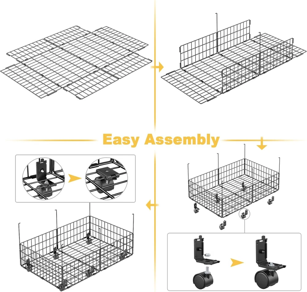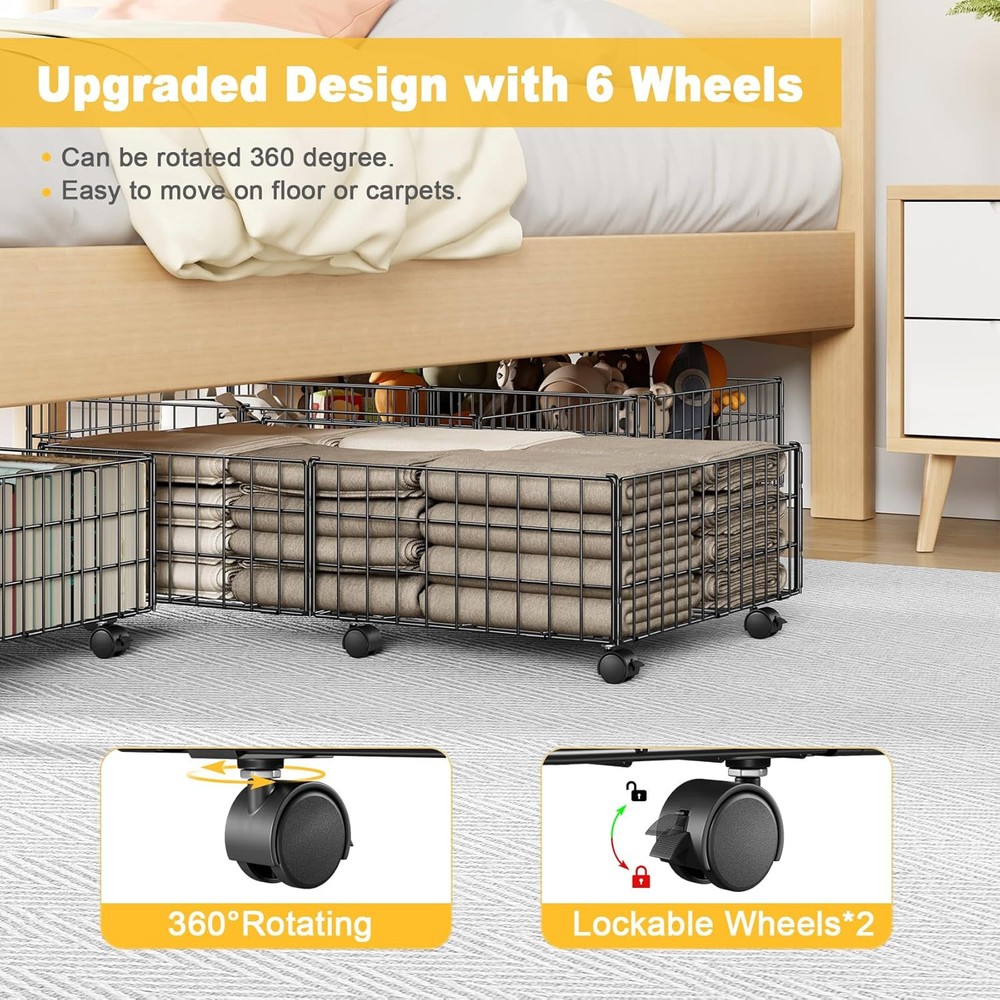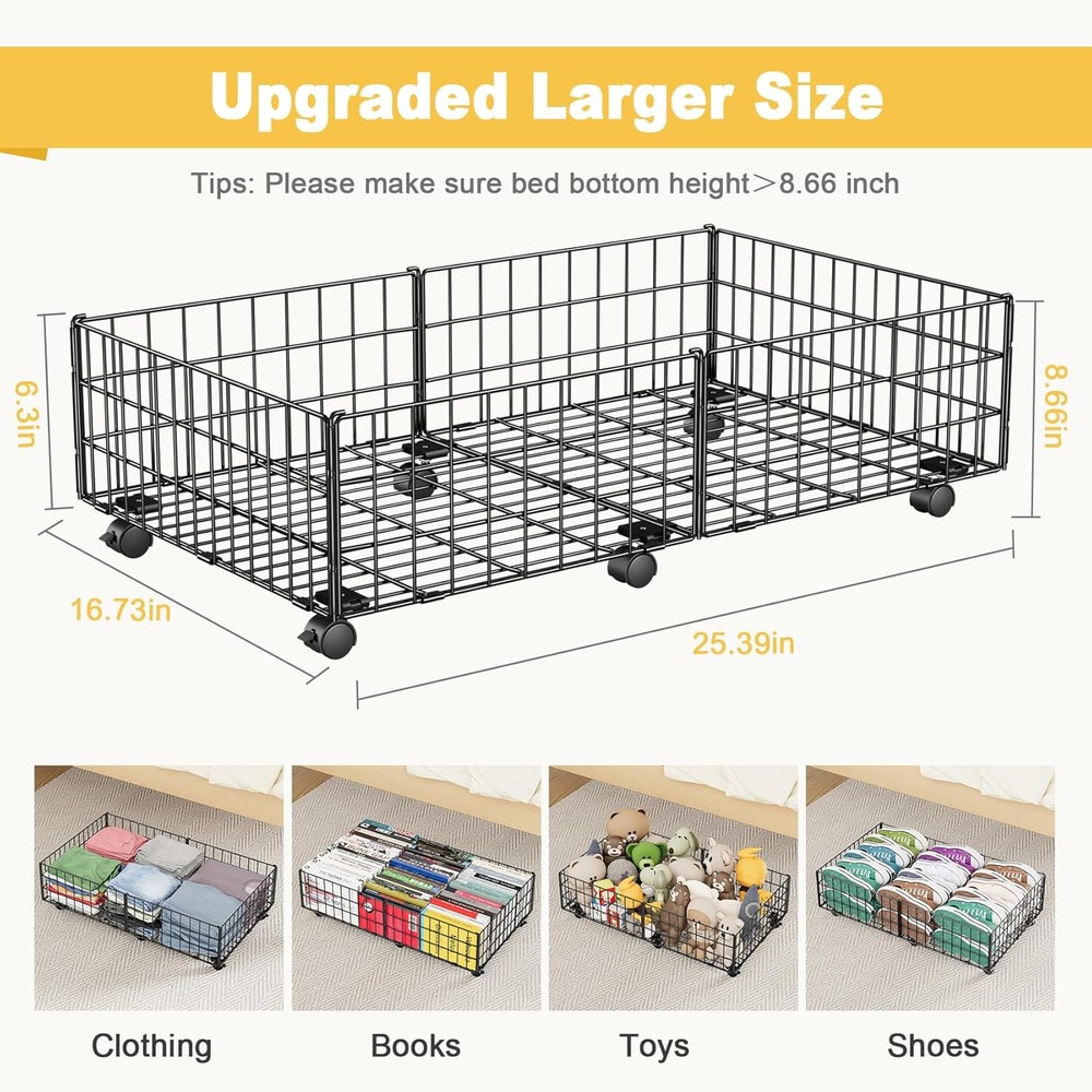 Mr IRONSTONE Large Under Bed Storage Containers with 6 Wheels, Upgraded Metal Under Bed Shoe Storage Holds Up to 80LBS, Rolling Under Bed Drawers Organizer for Clothes Toys Books Blanket, 2 Pack Product Details Unit Count: 2.0 Count Capacity: 80 Pounds Manufacturer: Mr IRONSTONE Part Number: SN03-053 Item Weight: 10.96 pounds Product Dimensions: 25.39 x 16.73 x 8.66 inches Item model number: SN03-053 Finish: Coated Pattern: Solid Shape: Rectangular Item Package Quantity: 1 Number Of Pieces: 1 Mounting Type: Floor Standing Special Features: Sturdy Batteries Included?: No Batteries Required?: No Material: Iron, Polypropylene (PP), Metal Product Dimensions: 25.4"L x 16.7"W x 8.7"H Item Weight: 4.98 Kilograms Brand: Mr IRONSTONE Finish Type: Coated 【Heavy Duty Metal Material】Compared with traditional textile storage box,Mr IRONSTONE under bed storage with wheels made of high quality metal frame is thicker than other storage cart, which makes the whole underbed storage more sturdy and offers a larger load-bearing capacity (up to 80lbs). And the surface is coated with high-quality materials, not easy to rust. 【Upgraded Design with 6 Rolling Wheels】Under the bed storage equipped with 6 x 360°rotated wheels can easily slide smoothly on the floor or carpet when in use. 2 of the wheels can be locked, when you need it to stay still, you just need to press the locking mechanism lightly. Elevated wheel design protect your stored items from dust and moisture. 【Larger Size & Capacity】Under bed shoe storage organizer dimensions: 25.4"(L) x 16.7"(W) x 8.7"(H), 8.7" height with wheels is designed for most underbed space, more space saving, making your tiny space a new look! The package includes 2 underbed storage with wheels, perfect for bedroom, living room, sofa, desk and other places to use. 【Tool-Free & Easy Assembly】We have simplified the under bed storage containers installation steps, and no tools are required. Just expand the frame and use the pins connect it together, and then install the 6 wheels into the frame. 【Clear Visual Design】The underbed drawers containers is composed of a firm visual metal grid. Unique structure of the under bed storage bins allows quickly identity the inside contents even under the bed, easily access to what you need.The whole under bed storage cart can be used to store shoes, clothes, toys, books, blanket, etc.