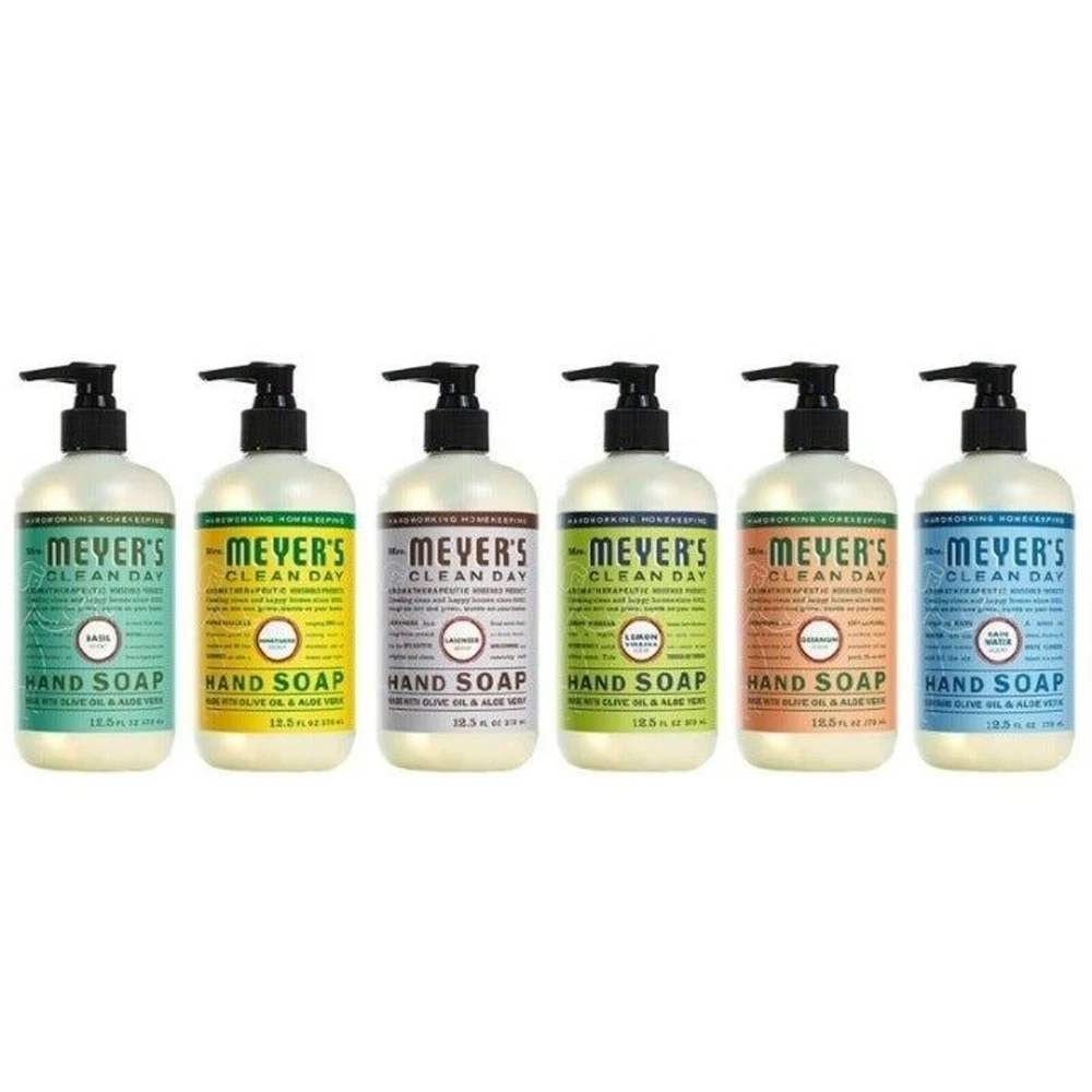 Mrs. Meyers Clean Day Liquid Hand Soap Variety Pack Lot of 6 Scents Hardworking, non-drying soap for busy hands Hand soap made with essential oils, aloe vera, olive oil, and other thoughtfully chosen ingredients Cruelty-free formula is not tested on animal.s