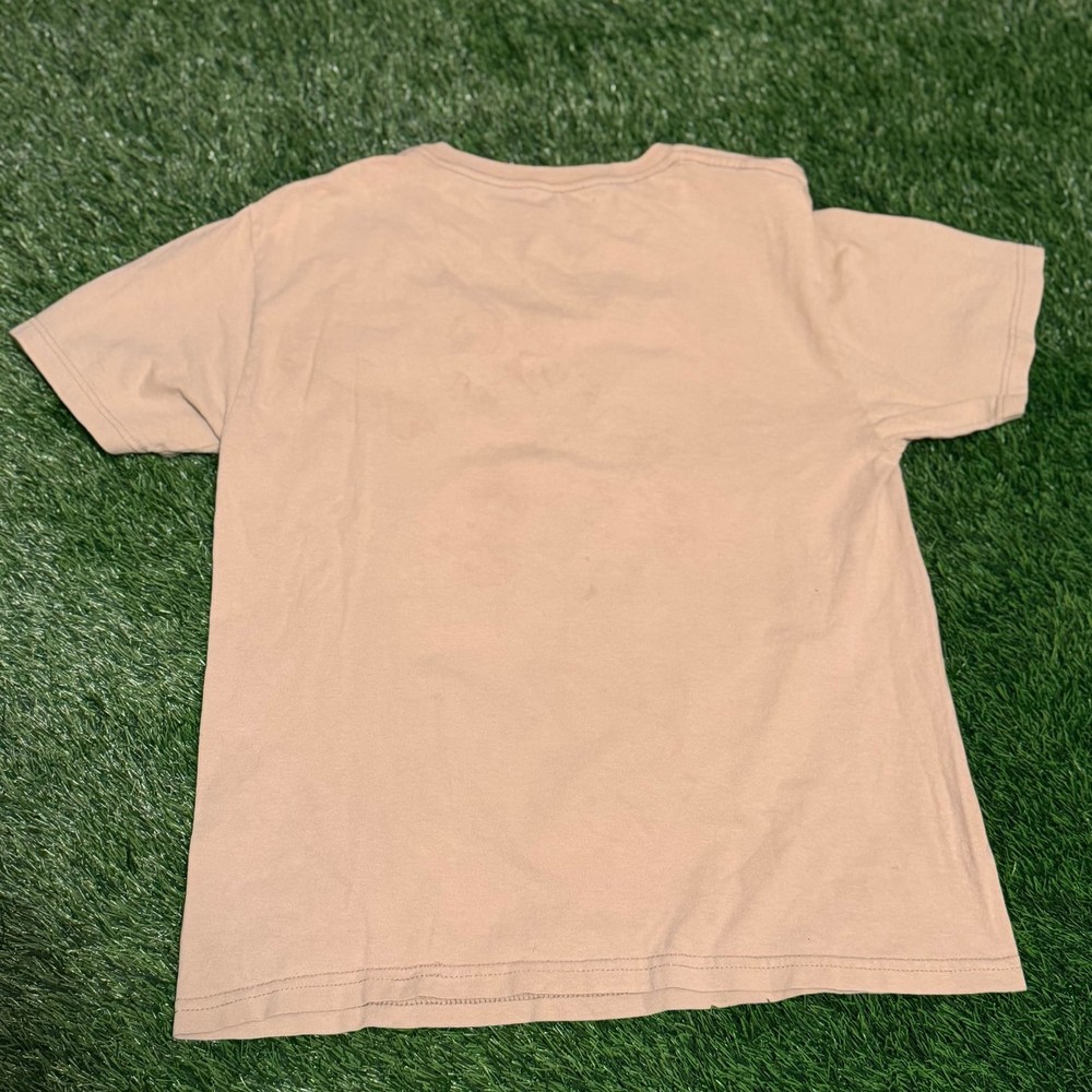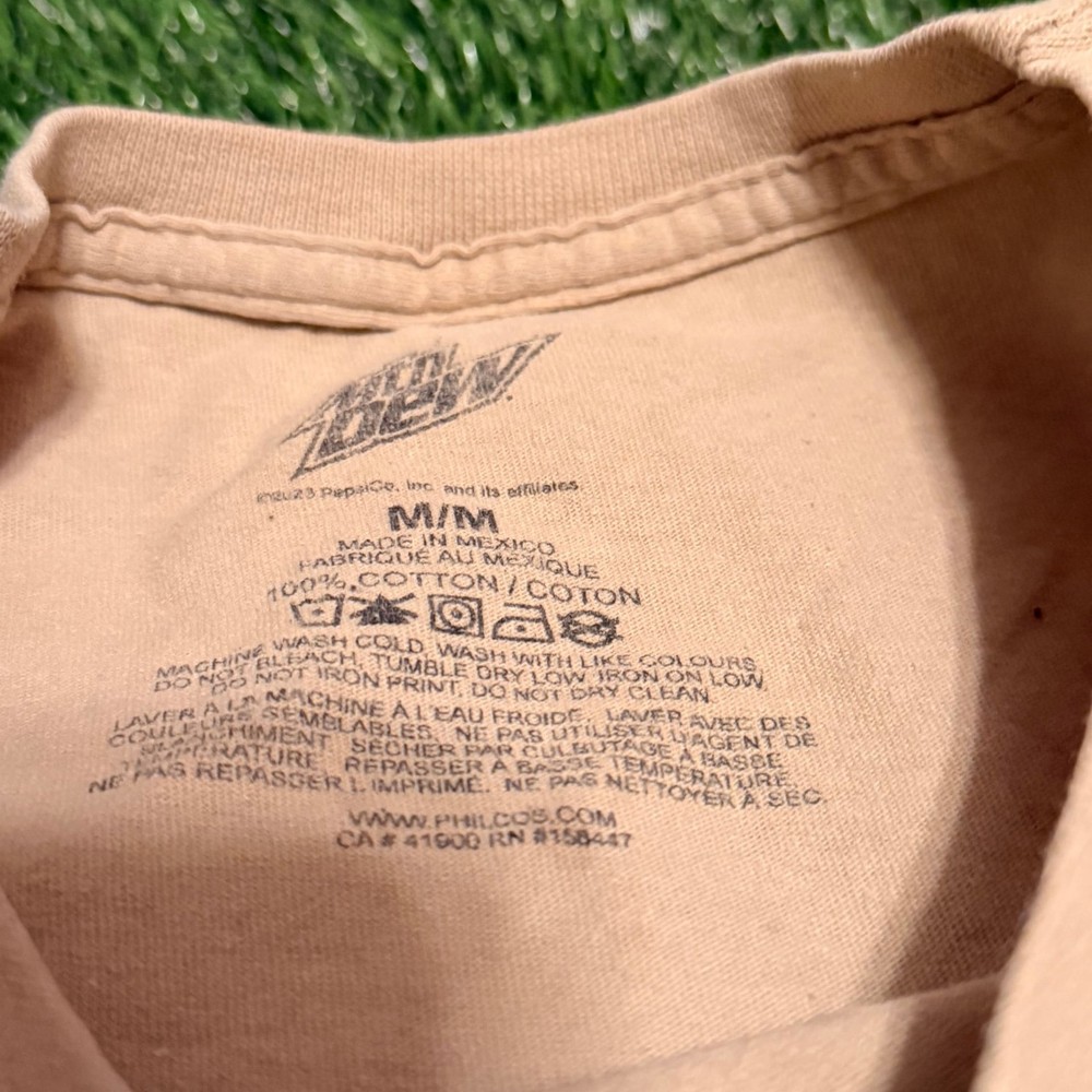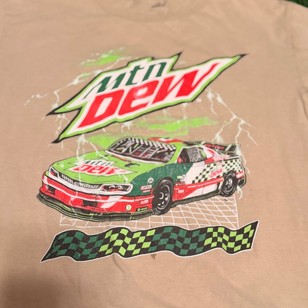 Mtn Dew Racecar Graphic T-Shirt by Tee Luv, Men's Size Medium — Tan/Khaki 100% Cotton. This streetwear-inspired tee features a bold Mountain Dew logo alongside a colorful racecar graphic and checkered flag detail. Perfect for fans of vintage racing aesthetic and soda brand collectibles. Features a comfortable crew neck and soft cotton construction. Made in Mexico. Good pre-owned condition. The fabric and graphics show minor signs of wear consistent with normal use, but no major holes or tears were noted. Please see photos for a close-up of the graphic detail.