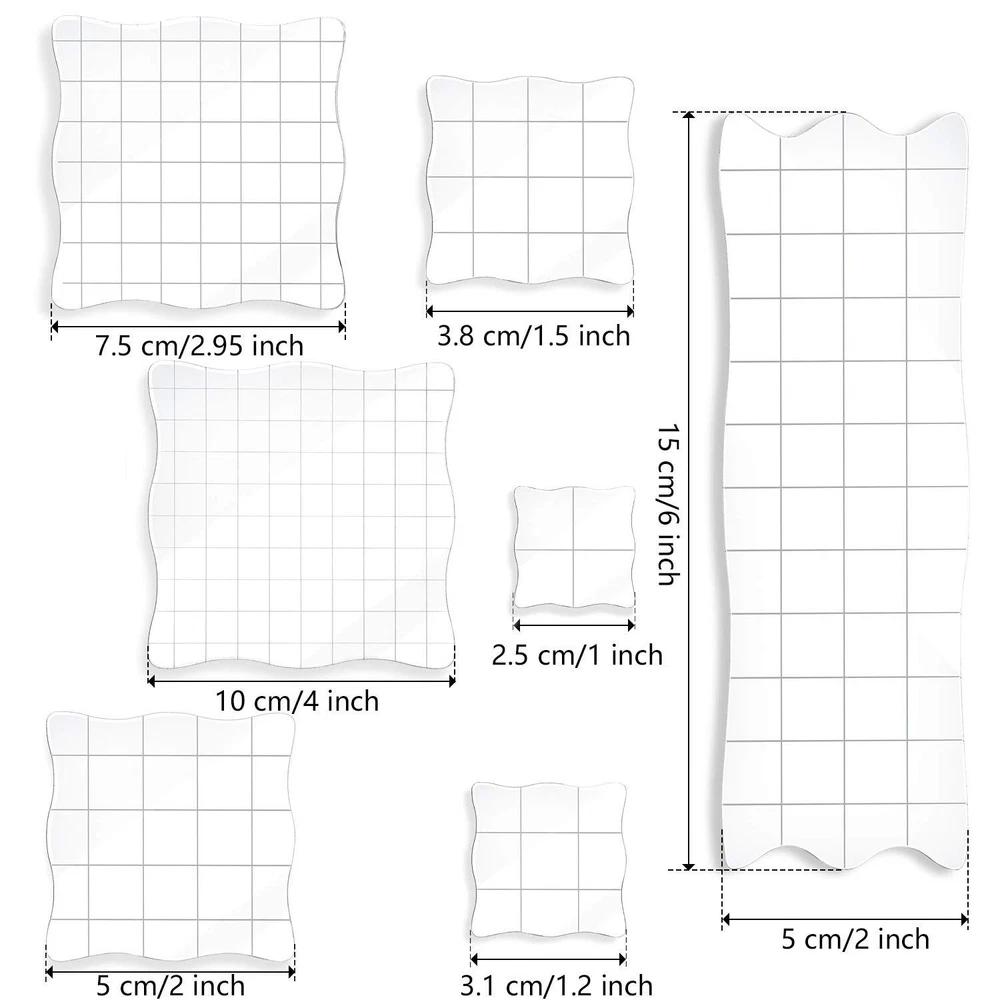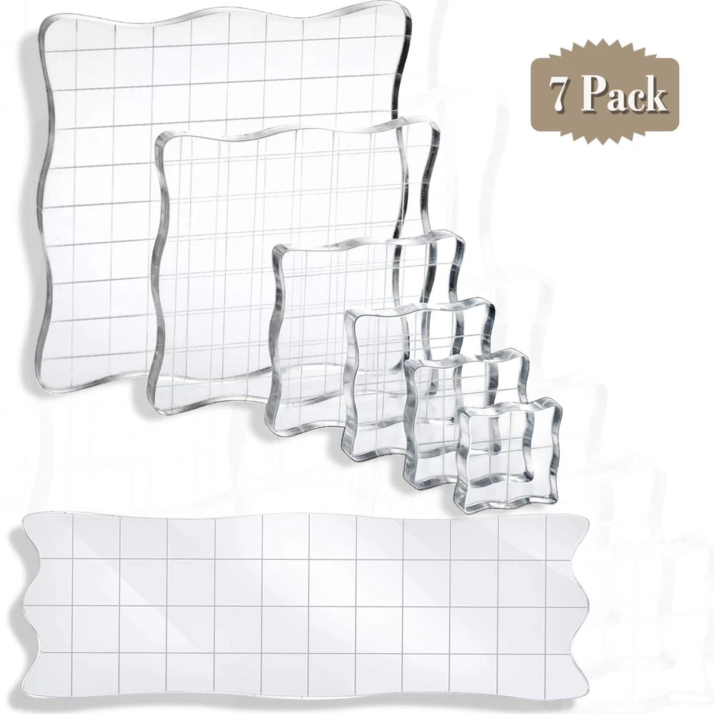 7 Pieces stamp blocks acrylic clear stamping blocks tools with grid and grip, decorative stamp blocks for scrapbooking crafts making, diy crafts ornaments Features: Stamp blocks are made of acrylic that is strong, solid and sturdy, not easy to break, safe and comfortable to use. The acrylic stamp block is suitable for stamping projects such as stamping on cards, notebooks, journals, invitations, clipboards. Acrylic blocks have a layer of protective film on the surface, so you need to tear it off before you use it. Multi-function acrylic stamp blocks with grid: Clear acrylic blocks are suitable for card making, invitations, album, gift tags and DIY any other amazing craft projects. The stamps are reusable and self stamp in the acrylic blocks, so you can use them to DIY scrapbook conveniently. You can also present the stamp blocks set as a gift to craft lovers. Usage method: 1. Please remove the protective film from the surface first. 2. Simply peel off the stamp from transparent sheet. 3. Apply the stamp to the block. 4. Apply ink to the stamp. 5. Place the image onto desired surface and press down firmly. Specifications: Size: 5.9 x 1.97 inches/ 15x 5 cm, 3.9 inches/ 10 cm, 2.95 inches/ 7.5 cm, 2 inches/ 5 cm, 1.2 inches/ 3.1 cm, 1.5 inches/ 3.8 cm, 1 inches/ 2.5 cm Thickness: 0.31 inches/ 0.8 cm Grid size: 1 x 1 cm Material: acrylic Package includes: 7 x Acrylic blocks warm notice: Before purchase, please check the details of the product and whether the thickness of the size is applicable There is a protective film on one side of the product. Please tear it off before use If you are in trouble with using, please contact customer service. We will give you a satisfactory answer Package content: you will get 7 pieces of acrylic stamp blocks in different sizes that are 2.5 x 2.5 cm, 3.1 x 3.1 cm, 3.8 x 3.8 cm, 5 x 5 cm, 7.5 x 7.5 cm, 10 x 10 cm, 15 x 5 cm; Each one is 0.31 inches/ 0.8 cm in thickness meeting your needs for applying different stamps Beautiful Lace Design: one side of the acrylic blocks for stamping is lace design, the edges are round, smooth and comfortable, which is cute and interesting, and the other side is clear and visible grid design, which can help locate the stamp image Reliable materials: the clear blocks are made of transparent acrylic material that is durable, not easy to break, easy to clean, and can be applied for a long time Comfortable and Safe: the curving edge of the lace of the acrylic block is round, smooth, comfortable and close to the finger, which is suitable for your daily use; You don't have to worry about scratching your hand; Please remove the protective film from the surface first; Simply peel off the stamp from transparent sheet; Apply the stamp to the block; Apply ink to the stamp; Place the image onto desired surface and press down firmly Wide applications: the clear acrylic blocks are suitable for stamping craft projects such as card making, invitations, diary, album, notebook, journal, gift tags and DIY any other amazing craft projects; The stamps are reusable and self stamp in the acrylic blocks, you can use them to DIY scrapbook conveniently