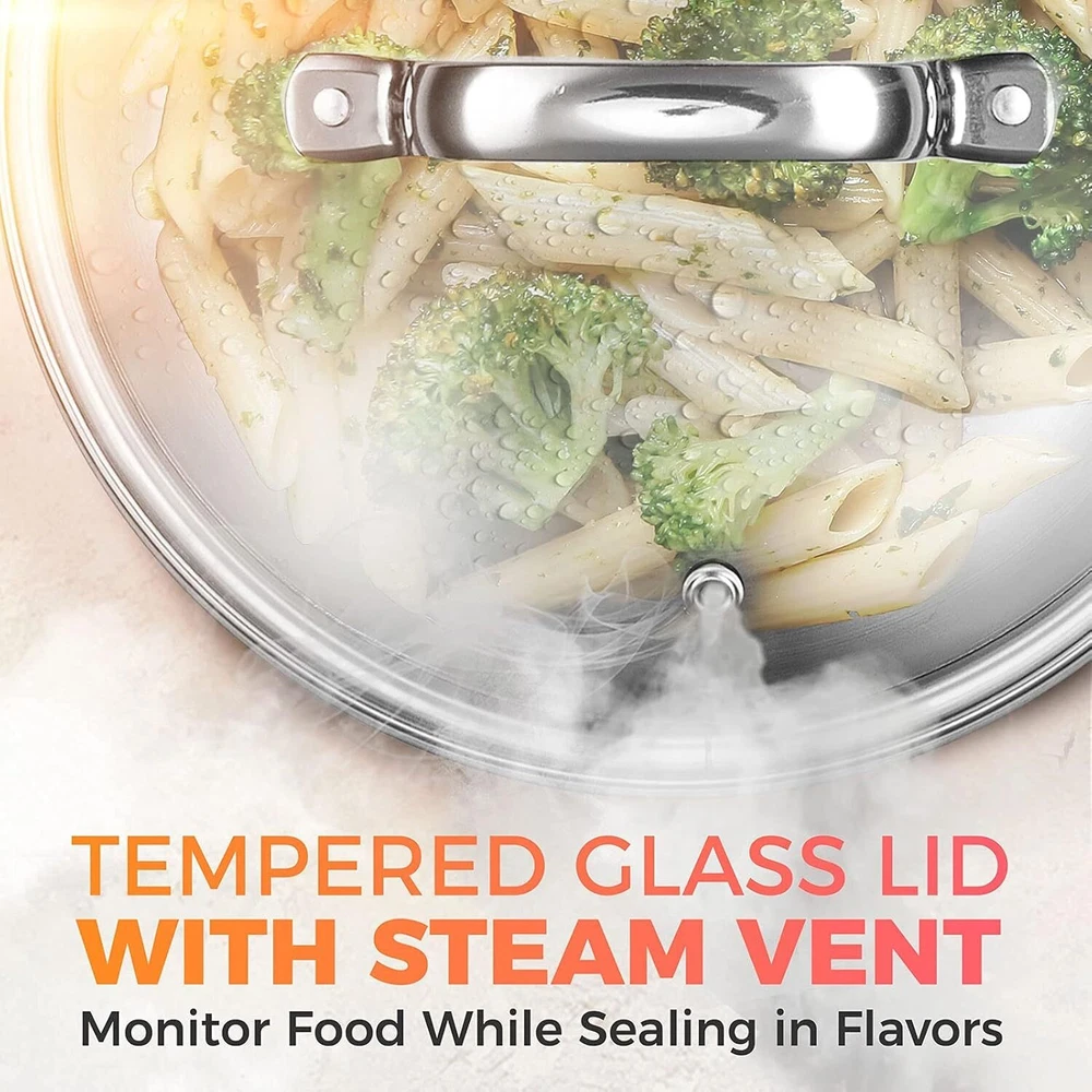 Contemporary Essentials - This contemporary 17 Piece kitchen cookware set ensures you have everything you need to create inspiring meals every day! With a brushed satin stainless steel design and sleek ergonomic handles, the practical cookware will suit any kitchen décor while providing professional cooking performance for every meal, large or small. Strong And Durable -The pots and pans feature a 3-ply premium quality stainless steel base with a thick aluminum core for fast and even heat distribution and maximum durability. The non-toxic stainless steel cookware will not discolor, react with food, or alter flavors, keeping your meals safe and healthy. The even heating reduces hot spots that can easily burn foods and cooks foods faster to save you both time and energy! Versatility - This cookware set is a complete kitchen in a box! Simmer, sauté, fry, boil or braise to your heart's content! Includes 1, 2 and 3qt saucepans, 8”, 10” and 12” skillets, large 3.5qt sauté pan, 4.5qt Dutch oven, versatile 8qt stock pot as well as a multi-tiered steamer insert that fits all saucepans and interchangeable lids. Each pan is suitable for oven and stovetop cooking, including induction. Seal In Flavors - Utilize the professional-grade tempered glass lids to help retain heat and seal in moisture and nutrients for healthier, more flavorful meals. The covers with steam vents fit perfectly within the smoothly tapered rims, designed to eliminate drips and spills while pouring. Double riveted comfort grip handles provide extra strength and stay cooler for longer to help maneuver on the stove top. Superior Quality With Mueller - We are here to offer you only the best quality products designed to make your life easier. If you need any help, please feel free to contact us. Our unparalleled 24/7 live telephone customer support is ready and waiting to assist with anything you need!
