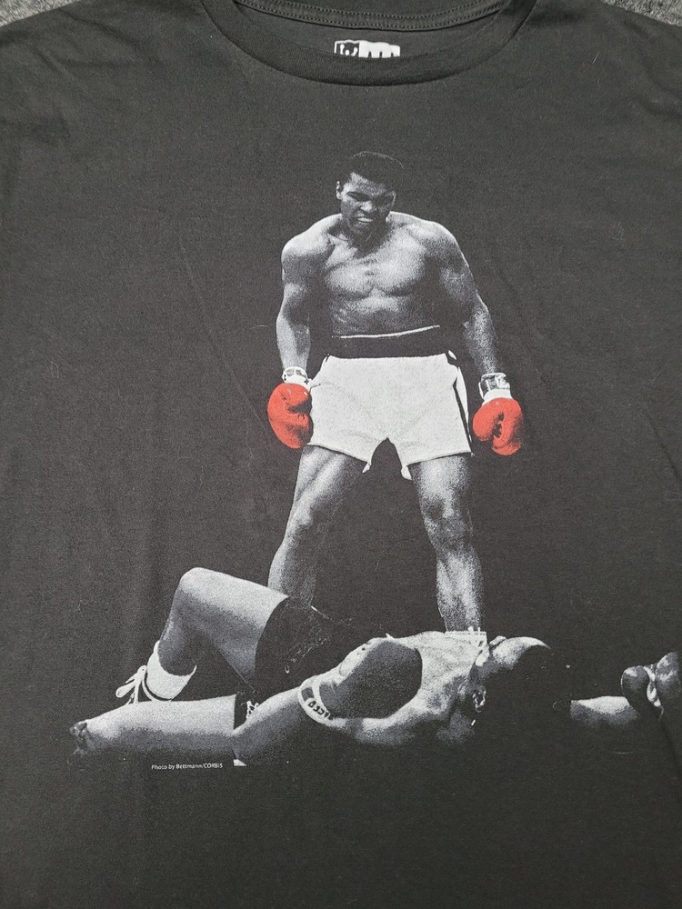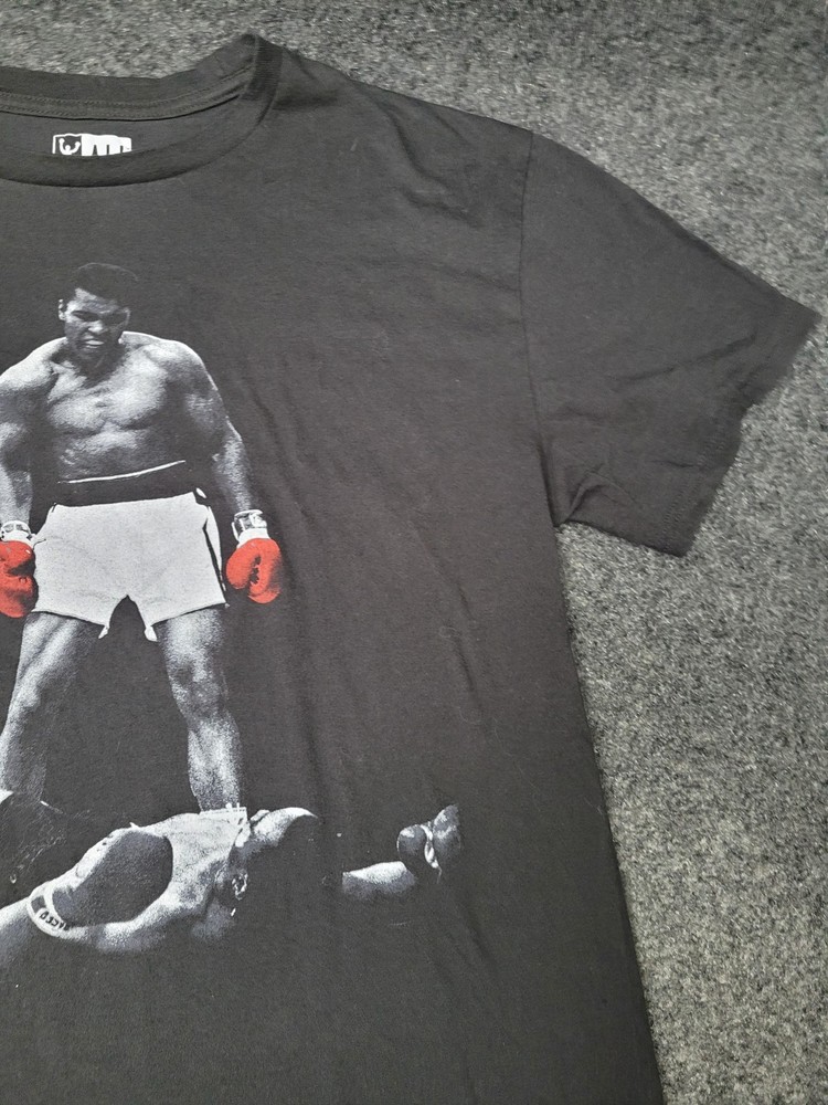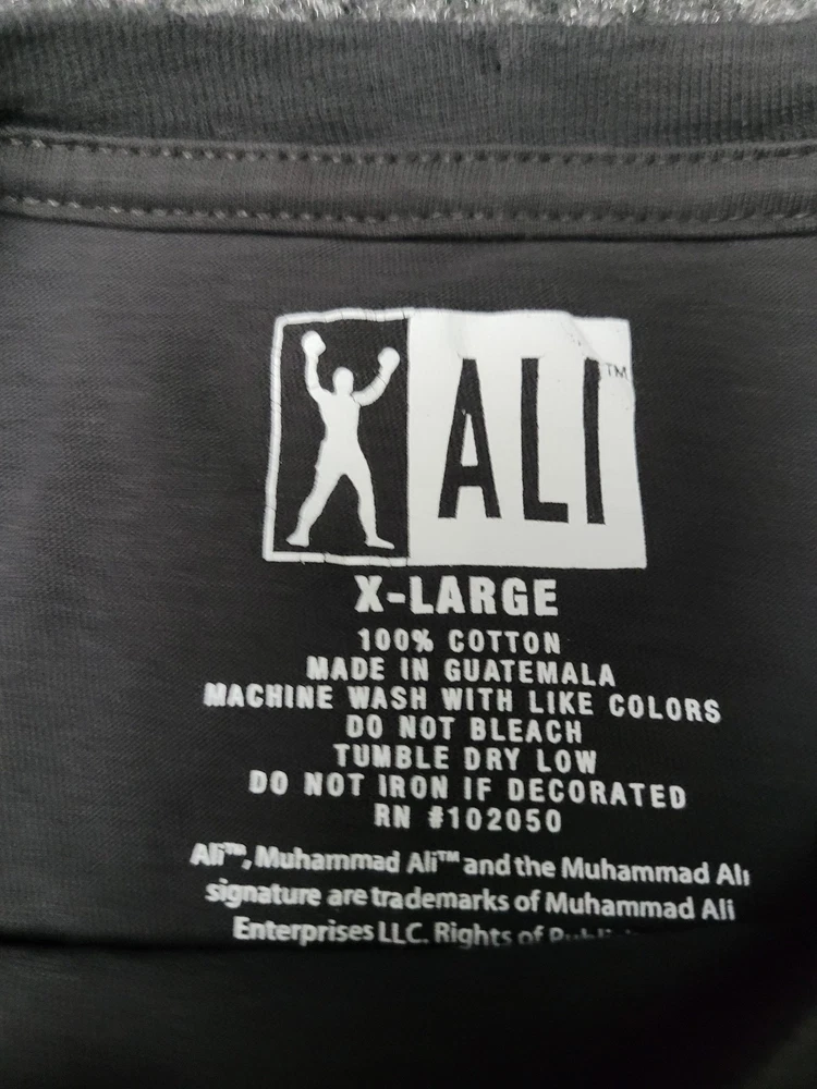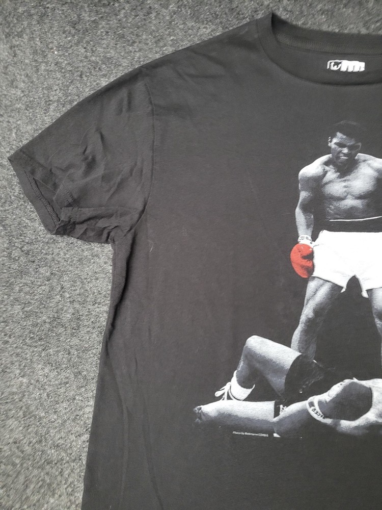 This listing is for a Muhammad Ali Shirt Mens XL Black Boxing Knockout Photo Graphic Tee T-Shirt Pre-owned Ali T-shirt with light overall wear and wash softness to the cotton fabric. Small faint lightened spots at mid back as shown; fabric otherwise clean and intact with no holes, snags, or stains. Front graphic print and printed neck label are intact and legible. Refer to pictures for condition. Message me if you have any questions.