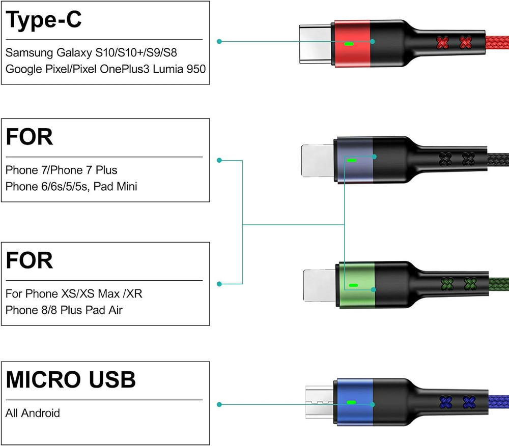 4 in 1 Charging Cables: One cable = four charging cables. State-of-the-art 4-in-1 design with 3 different USB ports. Including Dual iP, Micro USB and Type-C support to charger most of the usb c mobile phones available on market. Please Note it is just for charging not for sync date. usams Unique Design: Special indicator light design, best cable for charging at night. 4 feet/120cm Simple, lightweight, portable and convenient to carry this durable multiple cord with anywhere, perfect for home and office or travel. Durability: Material of Nylon braided and Aluminium Alloy, connector tested 10000+ times, never in worse connection. The high-quality aluminum housing makes the cable more durable and resistant to heat and corrosion. Ensure a longer service life. What You Get: 2pack black 4-in-1 cell phone charger cable. Suitable for many Occasions, with the 4FT length, the multi USB data line is most suitable for families, travel or work, business trips and other occasions. You don't need to carry more charging data cables, a mini 4-in-1 cable can satisfy all your charging devices. Product Description 2Pack usams original 4 in 1 Charger Cable -One cable for all devices! USAMS Multi Device Charging Cable with 4 Plugs - for Mini-USB + Type C + Micro USB is a perfect choice, especially if you or your family owns several phones with different ports. With just one cable, you can charge 4 devices at the same time. Save space and time! Special indicator light design, best cable for charging at night. With LED INDICATOR glowing when charging! Output: 5V/2A Length: 120cm (4ft) Material: Nylon Braided + Aluminium Alloy Packing Including: 2pack YOUSAMS 4 in 1 usb to usb c multi charger cable. Compatible with phone 14/14Pro / phone 13/13Pro Max / phone 12/12Pro/ 12 Pro Max/ phone 11/11Pro/ phone X /XXS /XS Max/XR/ 8/8 plus phone 7/7 plus/6s/ 6 plus, pad Air/ Air 2, Pad Pro, Pad mini Pod touch. Micro USB: For Most Android and Windows phones, tablets and many other devices including HTC / G4/G3/G2, LG V10, LG Optimus, LG Flex 2; for HTC One M8/M9/E8,One A9,One Remix,One/S/V/X/X+,HTC Desire 626/626S / GPS device. Moto G6 Play, Moto Turbo. For Wireless keyboards/Digital Cameras/Camcorders/Bluetooth Speakers/MP3 Players/Hard drives/Portable Charger/Windows notebooks/GPS devices Type-C port: For Samsung Galaxy S10 S10e S10+ Plus 5G S9 S9+ S8 Plus S9 Plus, Note 8 Note 9 Note10 Note10+ Plus 5G, A10e, Pixel 2 XL etc. New Book 2015, Book Pro 2016, ChromeBook Pixel 2015, Google Nexus 6P/5X, Huawei P9, Lumia 950, Lumia 950 XL and more. Please note: 1. Only Black IP port support charging and data transmission, but other ip, Micro and USB C port only support charging. (Before your purchase please kindly check your purchase store from "usams original"). 2. The maximum total output current of iP is 2.4A, Type-C is 3.0A and Micro-USB is 2.4A (For total, not for each end ) 3. We recommend using a faster charger /usb power adapter when charging Pad/phone or multiple devices. 4. These cables don't support quick charge, only provide normal charging speed. The actual charging speed is determined by the highest output that the wall charger can provide, you can charge multiple devices at the same time with a above 20W wall charger, particularly suitable for family or guests. Specification of Related Products Add to Cart Add to Cart Add to Cart Add to Cart Add to Cart Add to Cart Add to Cart Customer Reviews 4.3 out of 5 stars 146 4.4 out of 5 stars 1,099 4.2 out of 5 stars 1,260 4.0 out of 5 stars 444 4.3 out of 5 stars 146 4.3 out of 5 stars 109 4.5 out of 5 stars 15,660 Price $19.99 $ 19 . 99 $14.99 $ 14 . 99 $14.99 $ 14 . 99 $18.45 $ 18 . 45 $22.99 $ 22 . 99 $23.99 $ 23 . 99 $11.19 $ 11 . 19 Color Selection Black Purple Black, Green, multi-corlor Black White, Black Black Purple Black multi-corlor Length 4ft, 6.6ft 4ft, 6.6ft 4ft, 6.6ft 4ft, 6.6ft 4ft, 6.6ft 4ft, 6.6ft 1ft,4ft,10ft Quantity 1pack 1pack 1pack 1pack 1pack 1pack 2pack Samsung Fast Charging ✔ ✔ ✔ ✔ ✔ ✔ ✘ connector type Micro USB, USB Type C Micro USB, USB Type C USB, USB Type C Micro USB, USB Type C Micro USB, USB Type C Micro USB, USB Type C Micro USB, USB Type C compatible devices Tablet, Laptop, Smartphone Tablet, Laptop, Smartphone Tablet, Laptop, Smartphone Tablet, Laptop, Smartphone Tablet, Laptop, Smartphone Tablet, Laptop, Smartphone Smartphone