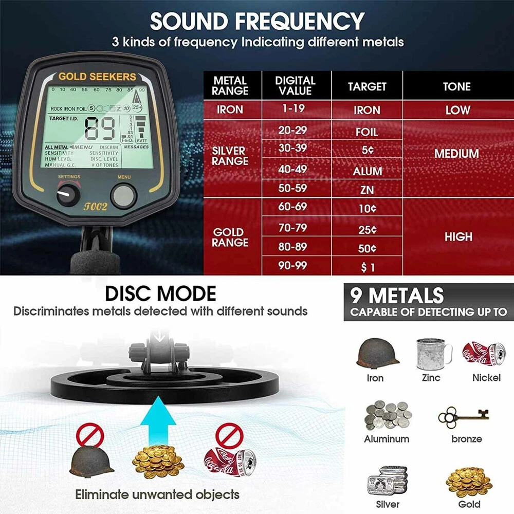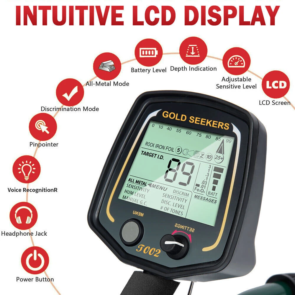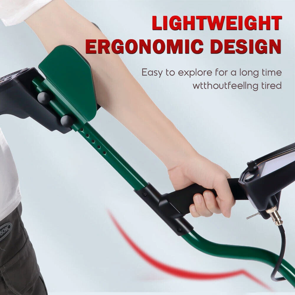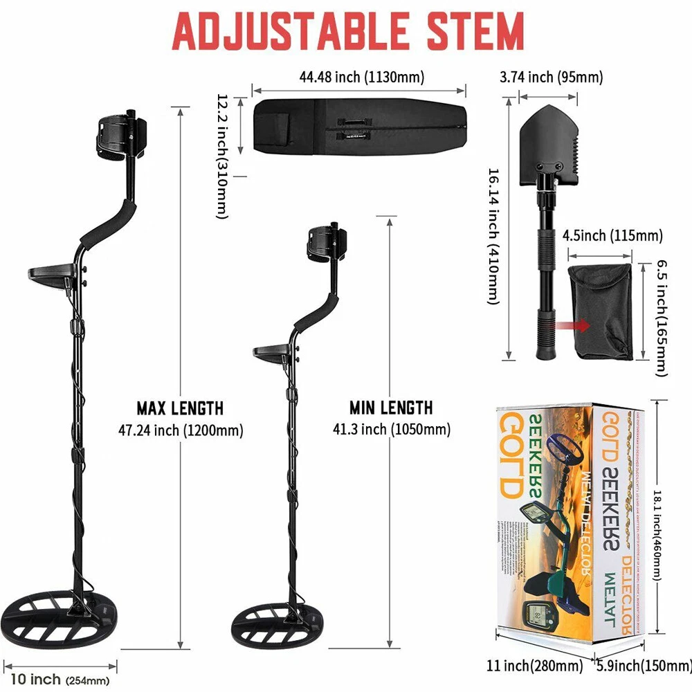 Description: This top rated T-BI02 Aluminum Alloy Metal Detectors Kit are made of 11 INCH Big Waterproof Search Coil and Best Quality /LCD Display which is exceptionally clear, accurate, durable, double quoted and scratch resistant. It's a new high-performance multi-purpose professional grade metal detector. It utilizes the latest advances in electronic technology, and its functional design represents the leading edge of the metal detector engineering art. Feature: -The Very Best Detecting Experience: Large LCD Screen with Target Identification Display. Big EASY-TO-READ LCD Display, Straightforward Menu-Driven User Interface, Operating State always visible, Target ID, Depth Display, Battery Condition, Message Center, Mode Settings. Invisible Display Can Help You Doing Well in Practical. -11'' Big Searching Coil: Best Ergonomics in the Industry Intuitive User Interface Menu-Driven User Interface Trigger Actuated Target Pinpointing Double Filter Discrimination Modes for Searching in Trashy Areas Trigger Actuated Instant Ground Cancellation Super Sensitive - Detect Coins to 15 Inches and more Ground Mineralization Bar Graph Readout Waterproof 11-Inch Open Frame Bi-Axial Search Coil Great for Highly Mineralized Soils Operating Frequency of 13 kHz Specification: -Material: ABS+aluminum -Power supplys mode: 4 * 1.5V alkaline battery (Included) -Working voltage: 1.5V -Frequency: 13kHz, crystal control -Operating temperature: -10~50℃ -Operating humidity: 0~90% (non condensing) -Basic sensitivity: U.S coin (12~15inch) -Detect septh: Max. 1.5m Stretch length: 42-52in -Search coil size: 290 * 185mm / 11.42 * 7.28in -Package size: 560 * 220 * 80mm / 22.0 * 8.7 * 3.1in -Lightweight: 1800g / 4.0lb. With Batteries Package included: -One Metal Detector Main Unit -Two Connecting Rod -One 11 inch Big Waterproof Search Coil -One Shovel to Do the Digging Job -One Headphone for you to Find the Metal 'Secretly' -Four Batteries -One Black Bag for Packing the whole kit in Daily Use -Comprehensive Operating Manual & Guide to Metal Detecting -One Colorful Packing Box (Good to send this to your friend, your dad, your children as gift) Q&A: Q: why can't we reach the depth of the instrument sometimes? A: the detection depth of all metal detection instruments is closely related to the area, shape and weight of the metal to be detected. Generally speaking, the larger the area, the more the quantity, the greater the corresponding detection depth; On the contrary, the smaller the area is, the less the quantity is, and the smaller the corresponding depth is. The depth marked by the instrument is as deep as it can be in good condition according to the industrial standard of the product. The detection depth will be different under different soil conditions. For example, the signal strength of the detected metal will be weakened in the case of wet soil or high density, so as to reduce the detection depth of the instrument. In addition, when the power is low and the transmitting power is insufficient, the detection depth will be attenuated. In this case, please replace the battery in time. Q: how to get good detection results? A: the detection effect will be made when the soil is dry or the metal is buried in a long time. The farther the metal is buried, the deeper the detection depth is. Because the metal buried in the ground for a long time will gradually oxidize, resulting in the diffusion of metal rust around, reacting with the surrounding soil, producing a strong magnetic field, increasing the area of the metal and increasing the intensity of the signal. The longer the time, the greater the signal strength and the deeper the detection depth! Q: what should be paid attention to in the maintenance of the instrument? A: don't detect in rainy days, because the instrument itself has no waterproof function. If the circuit board is flooded, it may cause short circuit or other faults. Remove the battery when not in use, because if the battery is placed in the instrument for a long time, it may corrode the circuit board due to liquid leakage. Keep in a dry place when not in use for a long time. Q: how deep can underground metal detectors probe? A: the detection depth of the underground metal detector is related to the metal material and shape of the object to be detected and the soil quality of the detection site. The detection depth of the same detector in different regions is completely different. Because the underground metal detector is designed according to the geological characteristics, the detection depth of the underground metal detector can not be detected in the air (that is, suspended), Only when the metal detector and the earth have a magnetic induction balance, can the detection effect be better. Hanging in the air can not achieve the magnetic induction balance! For example, if a silver coin can be detected at a height of 20 cm, if the silver coin is buried underground, the detection depth will be greatly increased, and the longer it is buried, the easier it will be detected, because the metal will gradually oxidize when it is buried underground for a long time, causing metal rust to diffuse around, react with the surrounding soil, and generate a strong magnetic field, Increase the area of the metal, but also increase the strength of the signal.