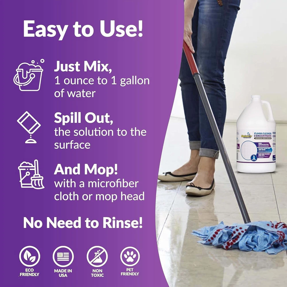 MULTI-SURFACE CLEANING POWER – Ideal for home and commercial use, this cleaner works on a wide range of surfaces. Whether you're maintaining flooring tile, refreshing granite countertops, or polishing vinyl, Sheiners’ formula simplifies every task for home clean results. POWERFUL DEGREASER AND STAIN REMOVER – This professional degreaser cleaner eliminates tough grease, grime, and stains. It’s also an ideal stain remover for bathroom surfaces and a reliable option for spot cleaner carpet needs. CONCENTRATED AND COST-EFFICIENT – Maximize value with this highly concentrated solution. Just one gallon of this floor cleaner concentrate makes up to 128 gallons of cleaning solution, prime choice for regular cleaning tasks and bulk cleaningg supplies orders. SAFE AND NON-TOXIC FORMULATION – Our non-toxic, ph neutral floor cleaner is suitable for maintaining a natural home fragrance environment. It's formulated without harmful and strong ingredients, ensuring a safe for all living spaces. With every use, offering peace of mind while keeping your spaces clean and fresh. EASY-TO-USE CLEANING SOLUTION – Designed for convenience, this cleaner pairs well with kitchen mops for tile floors, wax mops for floors, and other tools. Use it with a floor spray mop cleaner for hassle-free application and a refreshing lavender scent. Product description
