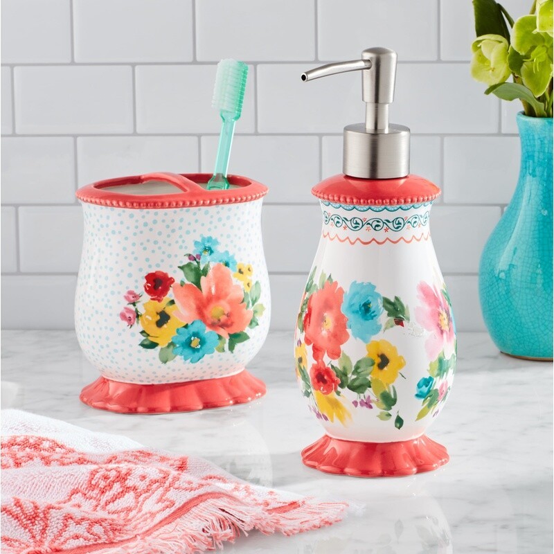 You may also like Modern Round Bath Accessory Kit 3-Piece Set Towel Bar Ring Holder Satin Nickel 44.35 USD Free shipping Ceramic Stoneware Bath Accessory Set Soap Pump Tumbler Organizer Tray 3-Piece US 17.29 USD 18.2 USD Free shipping 5% off Add a touch of floral charm to your bathroom décor with Multi-Color Breezy Blossom Ceramic 2-Piece Bath Accessories Set. This set includes a soap dispenser that can hold up to 15 oz of your favorite liquid soap, hand sanitizer, or lotion along with a matching oval-shaped toothbrush holder thoughtfully proportioned to store toothbrushes and toothpaste. Meet Ree: Ree Drummond is a NY Times Best Selling Author, TV personality, social media phenom, and the woman behind the popular Pioneer Woman lifestyle blog that started it all. She’s also a lover of butter, basset hounds, Ethel Merman, her hunky, cowboy husband Ladd, and their four kids. Her casual country style and delicious recipes have made her a go-to for all things cooking and entertaining 2-piece multi-color bath accessories set includes a soap dispenser and toothbrush holderMade of durable stoneware featuring a classy floral design Brushed nickel finish pump-head Refillable dispenser has a wide opening for easy refillsMade of durable stoneware featuring a classy floral design Soap dispenser measures 3. 1" Dia x 8. 0" H, holds 12 oz Toothbrush holder measures 4. 3" W x 3. 3" D x 4. 7" H Hand wash only Made of durable stoneware featuring a classy floral design Brushed nickel finish pump-head The refillable dispenser has a wide opening for easy refills Hand wash only Soap dispenser measures 3. 1" Dia x 8. 0" H, holds 15 oz Toothbrush holder measures 4. 3" W x 3. 3" D x 4. 7" H You may also like Heavy-Duty Metal Outdoor Storage Shed W/ Locking Door Air Vent Tool Organization 190.82 USD 200.86 USD Free shipping 5% off Hexagonal Steel Fire Pit Outdoor Wood Burning Fireplace Spark Screen Fire Poker 117.77 USD 123.97 USD Free shipping 5% off Modern Swivel Ottoman Faux Leather Chrome Base Accent Piece Indoor Furniture New 142.52 USD 150.02 USD Free shipping 5% off Upholstered Dining Side Chairs Set of 2 Cherry Finish Tufted Accent Gray New 162.56 USD 171.12 USD Free shipping 5% off Modern Accent Chair Set of 2 Boucle Armchair High Back Wingback Living Room New 215.87 USD 227.23 USD Free shipping 5% off Industrial Wood Metal Rectangle Coffee Table W/ Storage Sturdy Legs Indoor Use 125.16 USD 131.75 USD Free shipping 5% off White Metal Decorative Stand Lace Edge Display Tray Jewelry Candle Plant Holder 65.15 USD 68.58 USD Free shipping 5% off Sturdy Solid Wood King Canopy Bed Frame Platform Bed W/ Under Bed Storage New 188.01 USD 197.9 USD Free shipping 5% off Set of 3 Indoor Outdoor Metal Plant Stands Rustic Nesting Flower Holders New 80.09 USD 84.3 USD Free shipping 5% off 4-Level Standard Bookshelf Espresso Wood Storage Rack Living Room Display New 141.34 USD 148.78 USD Free shipping 5% off Graystone End Table W/ Shelf Faux Birch/Slate Bedroom Livingroom Office Decor US 56.2375 USD Free shipping Task Chair Office Desk Swivel & Adjustable Height Curved Mesh Back Lightweight 46.35 USD Free shipping