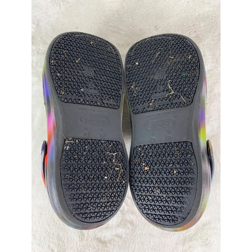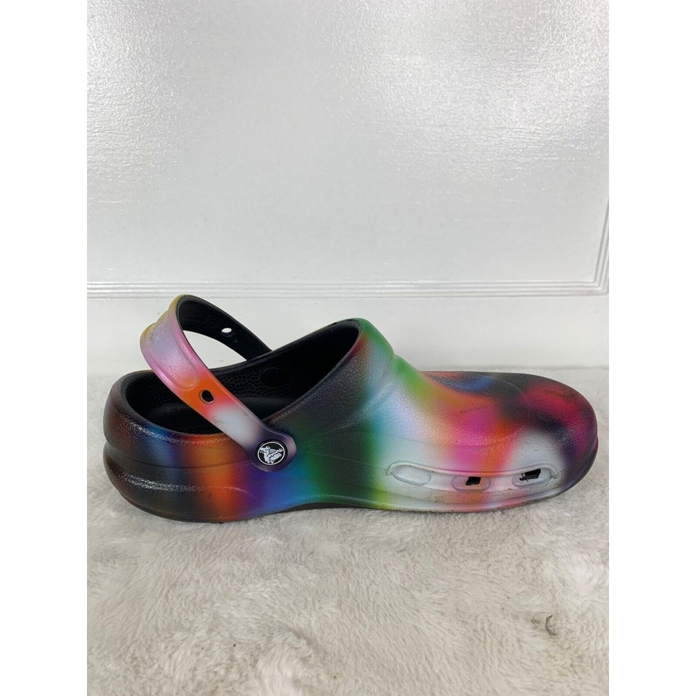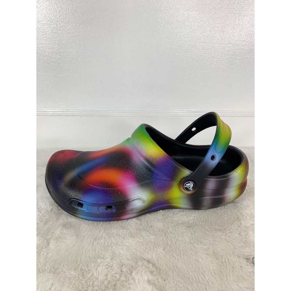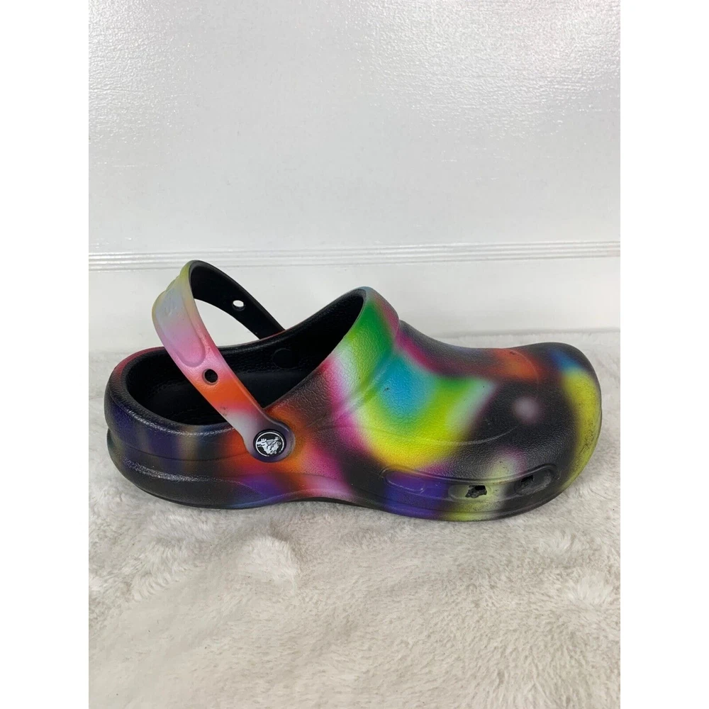 These Crocs clogs feature a striking multicolor graffiti design, offering a playful yet functional choice for casual footwear. Made for men in size 9, they provide comfort with their lightweight structure and ergonomic design. Their vibrant colors add a unique flair to any outfit. • Adjustable heel strap • Ventilation ports • Slip-resistant sole • Easy to clean