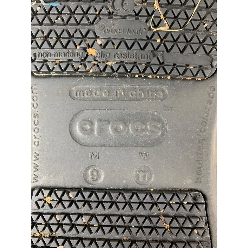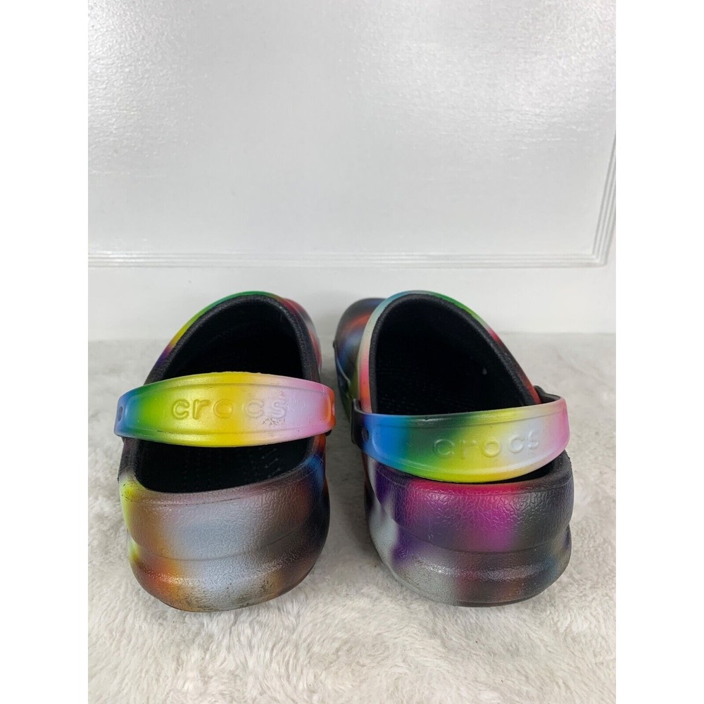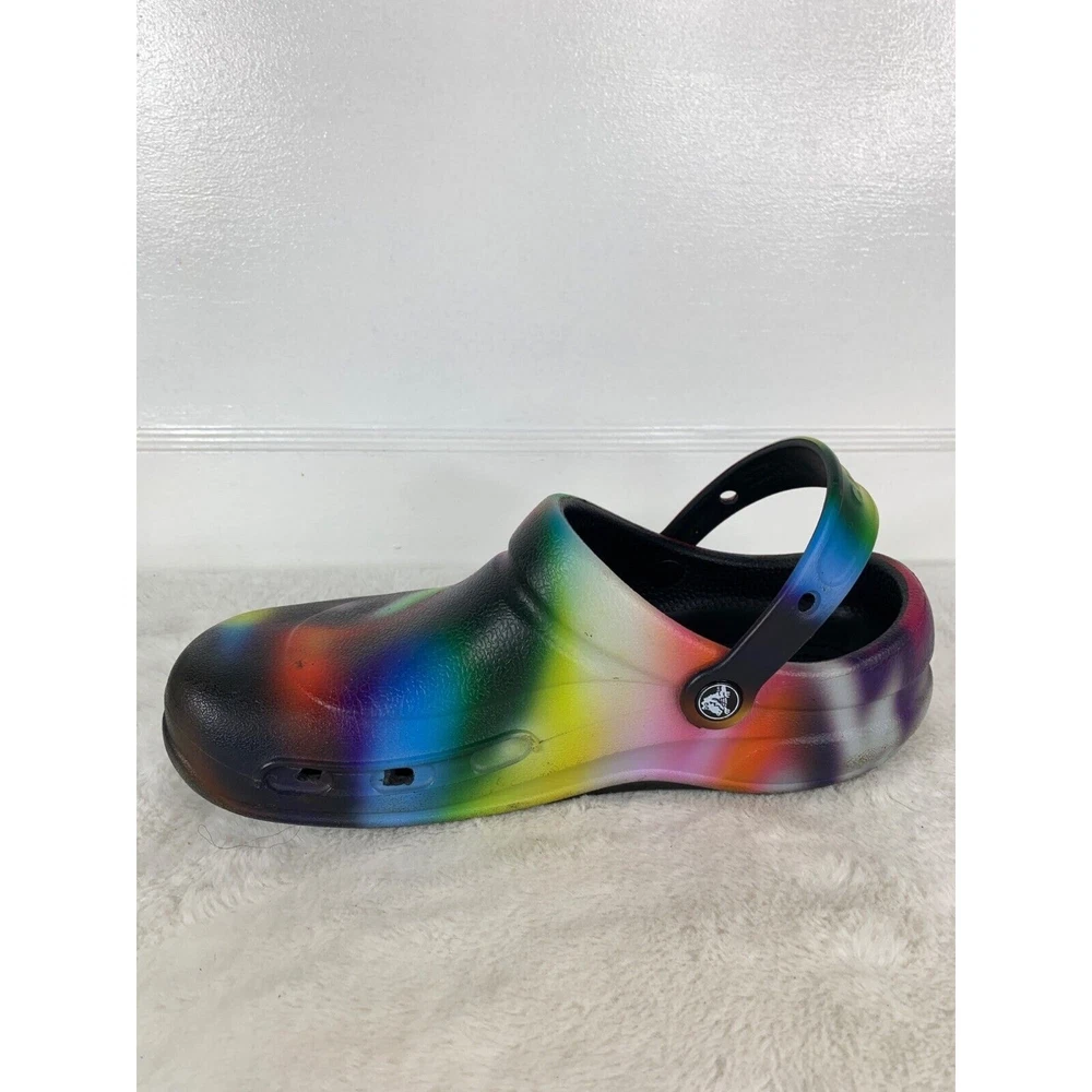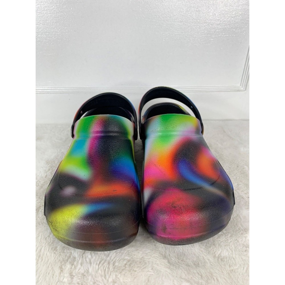 These Crocs clogs feature a striking multicolor graffiti design, offering a playful yet functional choice for casual footwear. Made for men in size 9, they provide comfort with their lightweight structure and ergonomic design. Their vibrant colors add a unique flair to any outfit. • Adjustable heel strap • Ventilation ports • Slip-resistant sole • Easy to clean