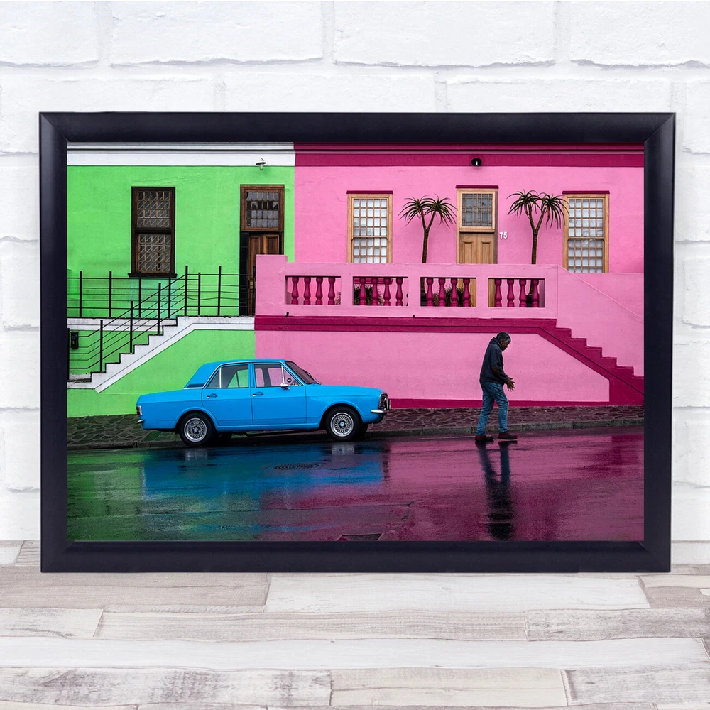 Multicolour houses Street Car Parked Pink Green Blue Wall Art Print