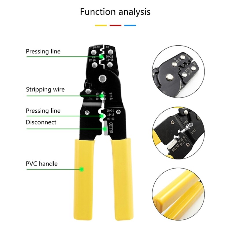 Features: High quality carbon steel material, suitable for multiple cable wire. Light weight, compact, and easy to operate. Good crimping effect, time-saving and effort-saving. handle portable suitable for various purposes. Multi-functionl:cut wire, strip wire, clamp, crimp the terminal with plier Specifications: Length:approx 18.5cm/7.28in Material:High Carbon Steel+PVC/TPR Weight:230g Color: Yellow Handle Insulating Terminals: AWG10-14/16-18/20-22 Non-Insulated Terminals:AWG14-18/20-22/22-26/ 26-28 Stripping AWG 22 16 12/ MM:0.6 1.3 2.0 Package Includes: 1 x Wire note: Due to the problems of lighting effects and angles, there will tolerances in the product, please understand. Please allow 0-1cm error due to the manual measurment.