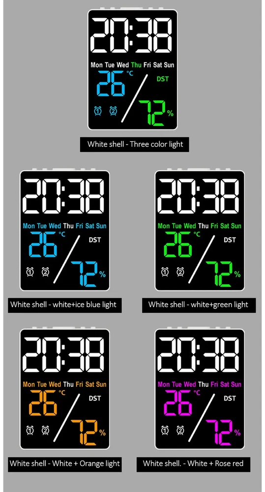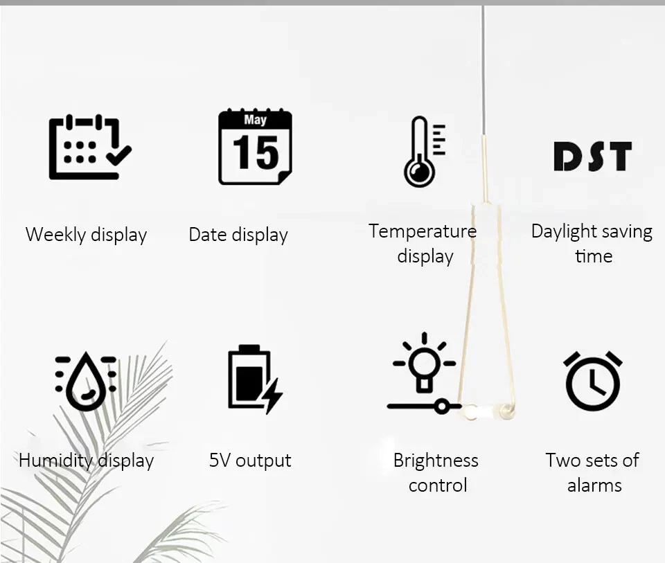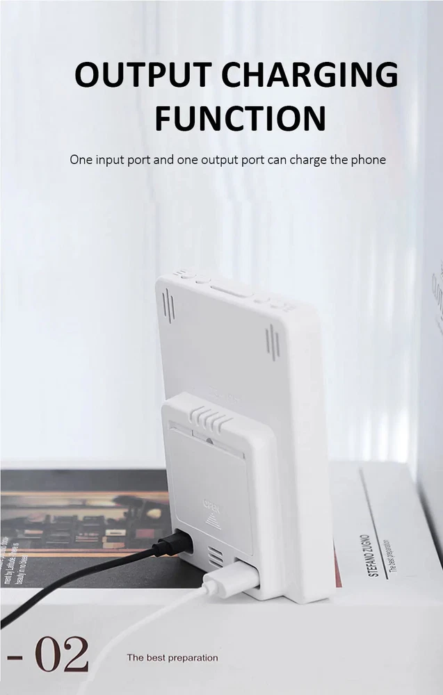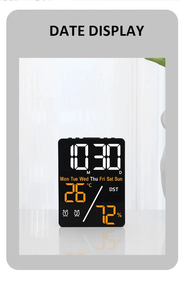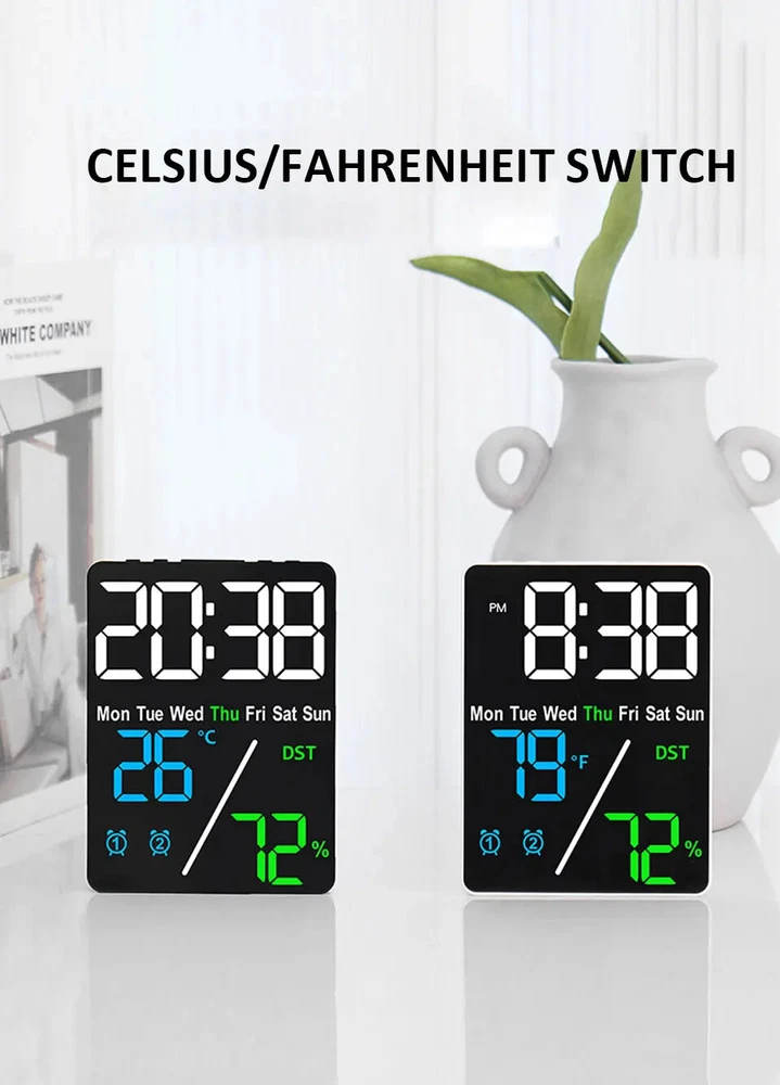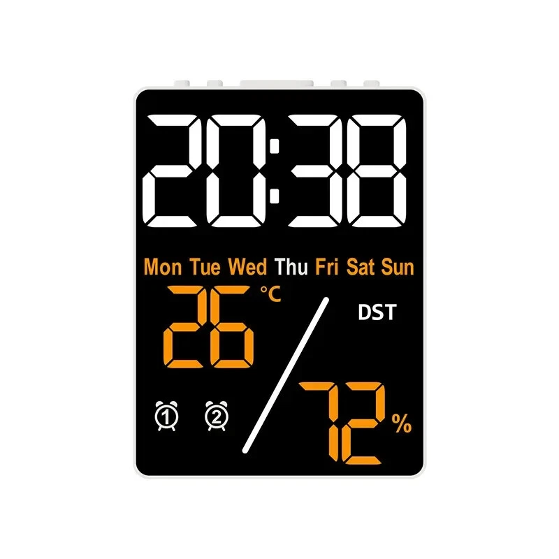 Multifunctional Large Screen Digital Alarm Clock Humidity Display Brightness Adjustment Charging Desktop Clock Home Office Decor Features: Dual Alarm Clocks: You can set two alarm clocks in different time periods (such as weekdays and weekends), which can help you plan your time reasonably. 3 Levels of Brightness Adjustment: This alarm clock has 3 levels of brightness adjustment, and also adopts a high sensitivity photosensitive sensor, which can automatically sense the ambient light and adjust the brightness of the display. The stronger the ambient light, the brighter the backlight, and the weaker the ambient light, the dimmer the backlight. Perfect Gift: It is not only a clock, but also a good decoration for your bedroom. The stylish appearance and multiple functions make it perfect as a gift. Dual Power Mode and USB Ports: This product can be powered via the supplied USB cable or by installing AAA batteries (not included). When powered by the USB cable, there are two USB ports on the back, one for put and one for output. Note: AAA battery mode can not output charging. Specifications: Item Name: Digital Alarm Clock Material: Plastic Output: 5V 1A Color: as the picture Display Screen: LED Applicable Places: Home, Room, Outdoor, Office, Meeting Room, Bedroom, Places Where an Alarm Clock is Needed Size: 9cm x 2.5cm x 12cm(Approx.) Package Includes: 1 x Digital Alarm Clock 1 x USB Cable (Battery not included in package) Note: Due to different lighting and screen settings, the item color may be slightly different from the picture. Due to different manual measurements, please allow a 1-2cm difference in size. 1. Use carbon batteries; can not use alkaline batteries, overcharge is too strong to burn off the power supply (broken words, display incomplete) will shorten the life of the electronic clock 2. Adapter (plug) with 5V 1A, can not use fast charging, can not use the charging treasure, can not be used in the computer host, can not use the bull socket, will cause voltage instability, resulting in time is not allowed, the current is too strong will burn off the power supply (broken words, display incomplete) will shorten the life of the electronic clock!