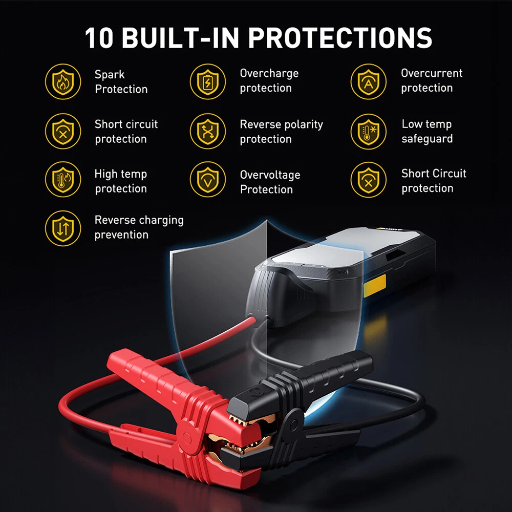 J101 Emergency Starting Power Supply Specifications: J101 Peak Current: 2,000A Battery Capacity: 7,200 mAh Suitable for: Li-ion battery emergency starting power supply (for 12V vehicles) for max 7L petrol vehicles + max 6.5L diesel vehicles with multi-mode oversized panel light (tent light) and smart clip. Functions. Multi-functional Emergency Start Power Supply: It can be used as a rechargeable battery or for lighting, and has the function of magnetic suction and hook. High-performance Emergency Start: *Peak current can reach 2,000A. *It is able to start most of 12V vehicles immediately (applicable to Max 7L Petrol Cars + Max 6.5L Diesel Cars). Multi-functional Emergency Power Start Supply Starting Portable Charging 12V M J101 Emergency Starting Power Supply Specifications: J101 Peak Current: 2,000A Battery Capacity: 7,200 mAh Suitable for: Li-ion battery emergency starting power supply (for 12V vehicles) for max 7L petrol vehicles + max 6.5L diesel vehicles with multi-mode oversized panel light (tent light) and smart clip. Functions. Multi-functional Emergency Start Power Supply: It can be used as a rechargeable battery or for lighting, and has the function of magnetic suction and hook. High-performance Emergency Start: *Peak current can reach 2,000A. *It is able to start most of 12V vehicles immediately (applicable to Max 7L Petrol Cars + Max 6.5L Diesel Cars). *With a single charge capable of starting 20 to 30 times and superb battery life, it is capable of cyclic charging and discharging 1,000+ times. Features: [Latest QDSP Technology] *The starting ability is increased by 3 to 5 times for the same starter battery capacity. The current of our jump junction box equipped with the latest QDSP technology is 3 to 5 times higher than the old jump starter. *Enhanced low-temperature starting capability. The starting temperature is reduced by 50% by disruptive innovations to the battery/module structure, which leads to temperature equilibrium for your safety. [Powerful Aluminum-rich Lithium Technology] High power, superior safety and low-temperature resistance, etc. [Breakthrough Security Technology] *Unique design allows you to start your car easily and quickly even in extreme environments (-20?? to 60??). *Built-in 9 safety protection technologies for your safety (overcharge, over-current, short circuit, reverse polarity, low temperature, high temperature, over-voltage, overload, reverse charging). [Extra Large Panel Light & Portable Power Supply] *Wide range of usage scenarios. The 700 lumens (5W) large panel of the emergency starting power supply includes Three Modes ( high brightness always on white light/medium brightness always on white light/flashing white light/ red light SOS), and features a hook and a strong magnet suction function. *Extra long lighting time to meet your outdoor and nighttime lighting needs (the highest brightness of J101 can be Continuously Illuminated 4 Hours). *Served as a portable mobile power source to charge your digital products (such as cell phones, computers and watches, etc.). [Excellent Heat Dissipation & Easy to Operate ] Small and exquisite with an excellent heat dissipation system; LED large panel light makes it simple to operate for non-professionals. [Products Include ] 1 X J101 Start-up power supply 1 X Smart-Clip 1 X USB-Type A to USB-Type C charging cable 1 X Storage bag 1 X User manual and 24-month warranty card If you have any after-sale questions about the quick starter, please feel free to contact us. ??NOTES?? 1. If you don't use our product for a long time, please charge it every three months. 2. If there is any problem with the product, please contact us in time to deal with it. ABOUT US Multi-functional Emergency Power Start Supply Starting Portable Charging 12V M J101 Emergency Starting Power Supply Specifications: J101 Peak Current: 2,000A Battery Capacity: 7,200 mAh Suitable for: Li-ion battery emergency starting power supply (for 12V vehicles) for max 7L petrol vehicles + max 6.5L diesel vehicles with multi-mode oversized panel light (tent light) and smart clip. Functions. Multi-functional Emergency Start Power Supply: It can be used as a rechargeable battery or for lighting, and has the function of magnetic suction and hook. High-performance Emergency Start: *Peak current can reach 2,000A. *It is able to start most of 12V vehicles immediately (applicable to Max 7L Petrol Cars + Max 6.5L Diesel Cars). *With a single charge capable of starting 20 to 30 times and superb battery life, it is capable of cyclic charging and discharging 1,000+ times. Features: [Latest QDSP Technology] *The starting ability is increased by 3 to 5 times for the same starter battery capacity. The current of our jump junction box equipped with the latest QDSP technology is 3 to 5 times higher than the old jump starter. *Enhanced low-temperature starting capability. The starting temperature is reduced by 50% by disruptive innovations to the battery/module structure, which leads to temperature equilibrium for your safety. [Powerful Aluminum-rich Lithium Technology] High power, superior safety and low-temperature resistance, etc. [Breakthrough Security Technology] *Unique design allows you to start your car easily and quickly even in extreme environments (-20?? to 60??). *Built-in 9 safety protection technologies for your safety (overcharge, over-current, short circuit, reverse polarity, low temperature, high temperature, over-voltage, overload, reverse charging). [Extra Large Panel Light & Portable Power Supply] *Wide range of usage scenarios. The 700 lumens (5W) large panel of the emergency starting power supply includes Three Modes ( high brightness always on white light/medium brightness always on white light/flashing white light/ red light SOS), and features a hook and a strong magnet suction function. *Extra long lighting time to meet your outdoor and nighttime lighting needs (the highest brightness of J101 can be Continuously Illuminated 4 Hours). *Served a