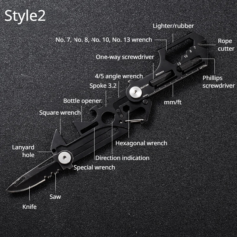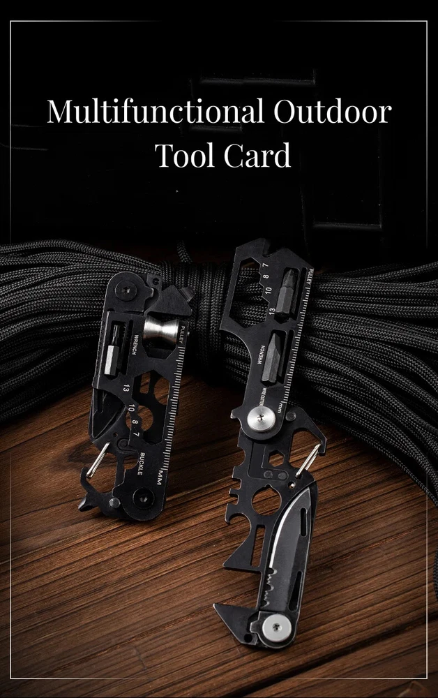 Product Description Name: Multifunctional Outdoor Tool Card Main Materials:Stainless Steel Product Weight:Approx. 87g/ 3.07oz Style: Outdoor、Tourism、Hiking、Camp Type: Camping Equipment、Camping Supplies Package List:1*Multifunctional Outdoor Tool Card Product Size Note : Since the product is an irregular object, this size is for reference only. Product Features Style 1 ①Knife ②Saw ③Special wrench ④No.4, No.5 wrench ⑤Cross wrench⑥mm/ft ⑦Pulley ⑧No.4、No.5 plum wrench ⑨Lighter/rubber ⑩No.7, No.8, No.10, No.13 wrench ⑪No.7 wrench ⑫Direction indication ⑬Spokes 3.2 ⑭Spokes 3.4 ⑮Square wrench ⑯One-way wrench ⑰Spike lifter ⑱Lanyard hole Style 2 ①Knife ②Saw ③Special wrench ④Direction indication ⑤Hexagonal wrench ⑥mm/ft ⑦Phillips screwdriver ⑧Rope cutter ⑨Lighter/rubber ⑩No. 7, No. 8, No. 10, No. 13 wrench ⑪One-way screwdriver ⑫4/5 angle wrench ⑬Spoke 3.2 ⑭Bottle opener ⑮Square wrench ⑯Lanyard hole