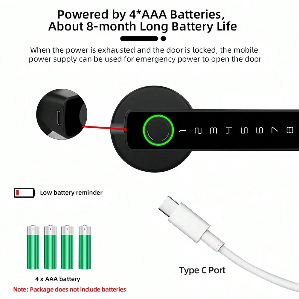 Unlocking method: APP Bluetooth unlocking, fingerprint unlocking, password unlocking, card unlocking, key unlocking 1:Color: Black/Silver 2:Battery used: AAAx4 (battery not included in product) 3:The product cannot be connected to WiFi directly, and needs to add a Tuya gateway (the gateway is not included and needs to be purchased separately) Power Supply: Battery Powered(Others Battery) Material: Iron Batteries Included: No
