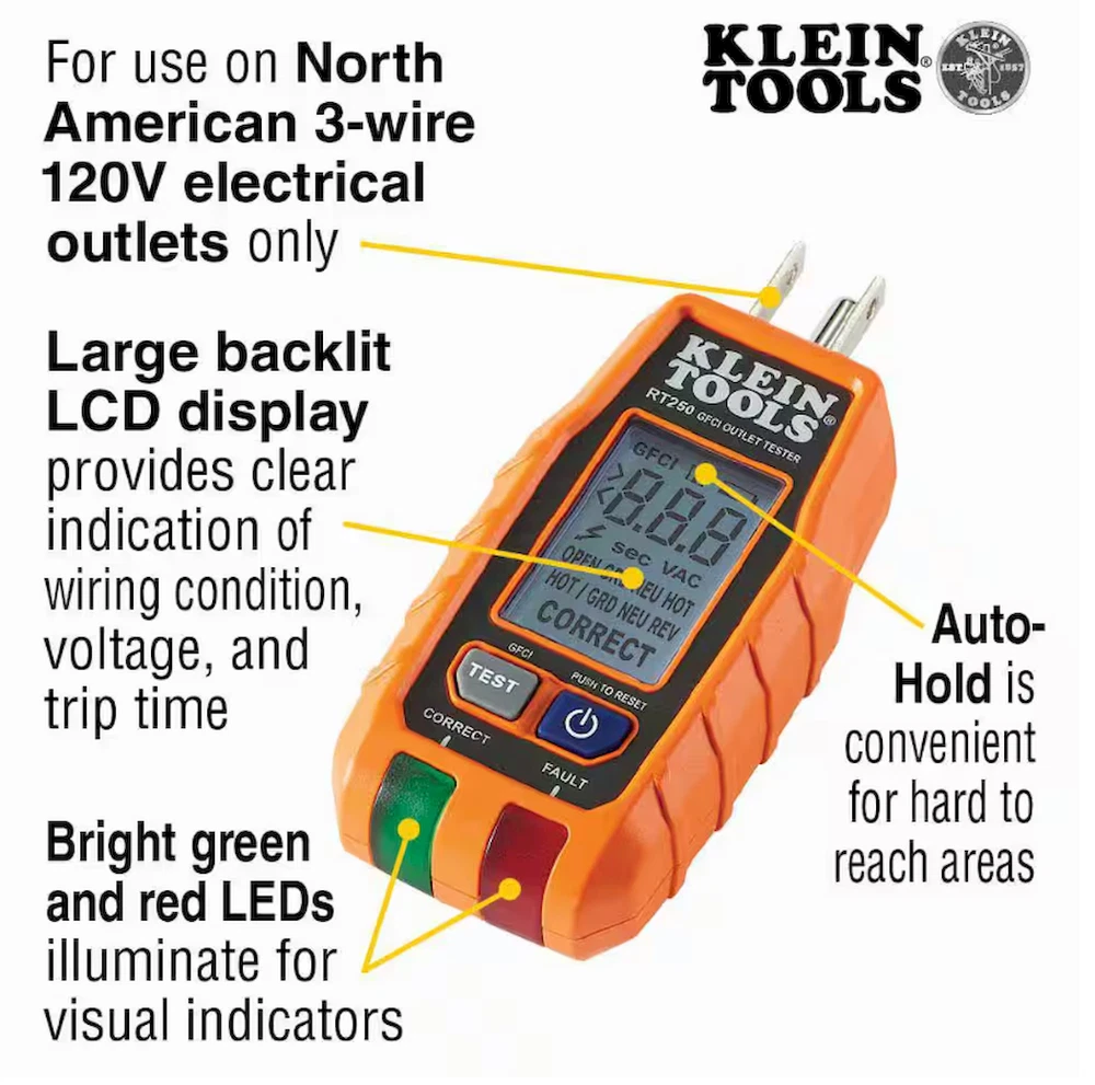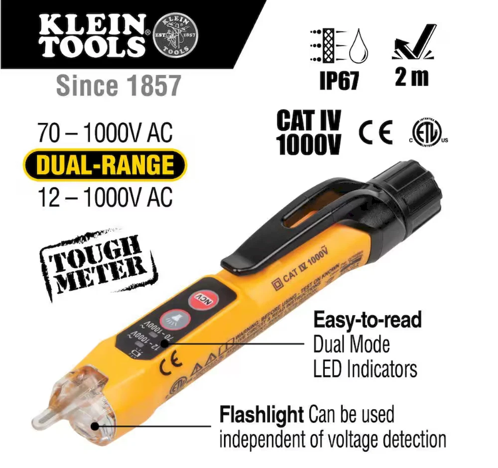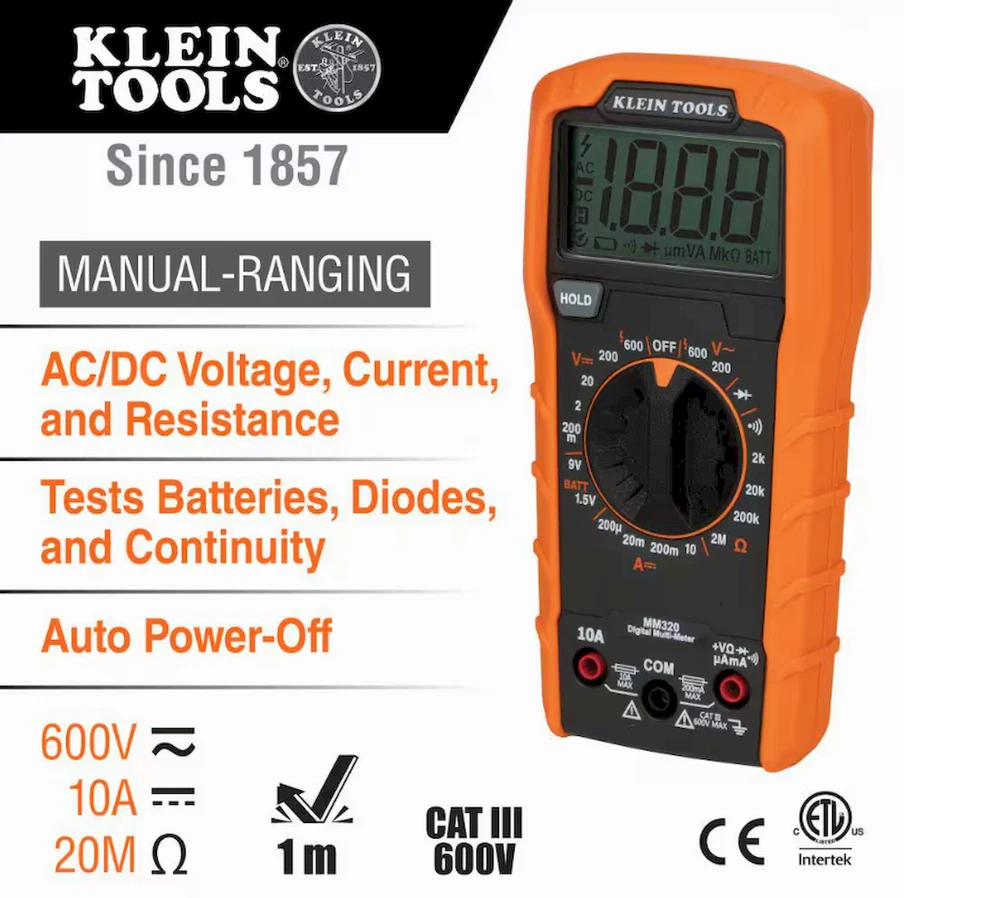 About This Product Klein Tools Premium Electrical Test Kit includes a Manual-Ranging Digital Multimeter (Cat. No. MM320) with right-angle test leads, Dual Range Non-Contact Voltage Tester with Flashlight, 12 to1000 VAC (Cat. No. NCVT3P), and a GFCI Receptacle Tester with LCD (Cat. No. RT250). This convenient kit features products for a variety of applications with safety and reliability in mind. Comes with all required batteries. Highlights Electrical Kit with Premium Testers solve various electrical applications; Manual-Ranging Digital Multimeter, Dual Range Non-Contact Voltage Tester with Flashlight, and GFCI Receptacle Tester with LCD Digital Multimeter MM320 measures up to 600V AC/DC voltage, 10A DC current and 2MOhms resistance; also tests batteries, diodes, and continuity Voltage Tester NCVT3P has dual-range capabilities to detect from 12 to 1000 VAC or 70 to 1000 VAC for a broad variety of low-voltage or standard voltage applications Bright flashlight illuminates work area and may be used independent of voltage detection function GFCI Receptacle Tester RT250 features a large backlit LCD readout of voltage, and clear indication of wiring conditions, including patent pending detection of Open Neutral / Open Ground wiring faults LCD readout on receptacle tester shows the time required to trip a GFCI device; for use on 3-wire, North American 120V electrical outlets only Digital Multimeter MM320 includes right-angle test leads and all required batteries MM320 is CAT III safety rated for 600V Details Electrical Tools Features Audible Alert, Battery Powered, Dual Voltage Indication, Grounded Receptacle, Handheld, Interchangeable Leads, Noncontact Detection, Visual Alert Hand Tool Type Electrical Tool Set Number of Pieces 3 Returnable 90-Day Tools Included Electrical Tester Tools Product Type Hand Tool Warranty / Certifications Manufacturer Warranty Please refer to the attached warranty document in the Product Overview section above under Info & Guides.