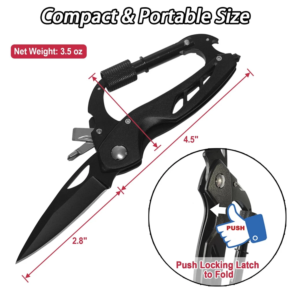 Carabiner with Knife, Multitool Carabiner Pocket Knife, Folding Sharp Knives, Sturdy Handy Tool, Belt Cutter, Bottle Opener, Window Breaker, Screwdriver, for Safety in Car, Camping, Hiking 7-IN-1: Carabiner multitool compacts 7 functions in 1, essential for outdoor and everyday tasks. Includes folding knife with sharp blade, bottle opener, glass breaker, screwdrivers, keychain clip. Carabiner pocket knife is extremely handy and gets lots of usage, for safety in the car, Camping, Hiking and outdoors adventures. RELIABLE: Multitool carabiner with knife is made of aluminum alloy and high-quality stainless steel. Carabiner multi tools is foldable, sturdy and safety, which is one of your handy reliable essential. Knife multitool carabiner meets demands of outdoor tasks and emergencies, like hanging hammock or cutting belt. SMART SIZE: Carabiner with handy tools comes in a smart size 4.5x2.4" (unfold size 7.3x2.4"), lightweight 3.5oz. The self defense multitool can be easily hooked it onto a belt loop or attached to backpack strap, keychain and more. You can just keep it in your pocket. SAFE: Pocket knife carabiner is designed with locking latch for safe, thumb hole for easy open and close. Ergonomic design makes it comfort holding. It is not recommended to support human weight when climbing. UNIQUE GIFT: Multitool carabiner with pocket knife combines practicality and convenience. As must-have handy comfortable tools for Safety in Car, Camping, Hiking or outdoor adventures, it is a great unique gift thought. If any question, please feel free to contact us directly. 【Multitool Carabiner】Our carabiner multi-tool is compactly offering 7 functions in 1, as an essential companion for outdoor survival and everyday tasks. This survival multitool includes folding pocket knife, bottle opener, glass breaker, phillips screwdriver, slot screwdriver, carabiner keychain clip. A great tactical carabiner and survival gear that can meet various outdoor tasks camping hiking. 【Best Outdoor Gift】This multitool carabiner is combines practicality and convenience. It is a must-have survival keychain for camping, backpacking, hiking, hunting and other outdoor activities. This is a great gift for friends and family who loves outdoor activities. If any questions about the multitool, please feel free to contact us directly. We will give you a satisfactory solution. Shipping We offer FREE shipping on all orders! We ship within Three business days of payment, usually sooner. We use a selection of shipping services such as UPS, FedEx, USPS etc. We only ship to the lower 48 states, no APO/FPO addresses or PO Boxes allowed. Local pickups and combined shipping options are not provided at this time. Return You can return a product for up to 30 days from the date you purchased it. Any product you return must be in the same condition you received it and in the original packaging. Please keep the receipt. Payment We accept payment by any of the following methods: PayPal Please pay as soon as possible after winning an auction, as that will allow us to post your item to you sooner! Feedback Customer satisfaction is very important to us. If you have any problem with your order, please contact us and we will do our best to make you satisfied. Contact Us If you have any queries, please contact us via ebay. We usually respond within 24 hours on weekdays. Please visit our eBay store to check out other items for sale! Thank you for shopping at our store.
