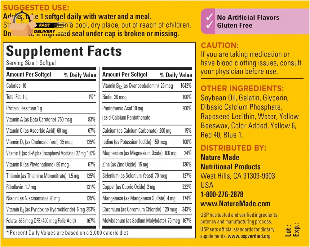 Store New Arrivals Add to Favorite View Feedback Contact Multivitamin for Her 50+ with No Iron, Womens Multivitamin for Daily Nutritiona Description Item model number 4046 Primary Supplement Type Multivitamin Is Discontinued By Manufacturer No Product Dimensions 2.44 x 2.44 x 4.38 inches; 5.7 ounces Country of Origin USA Diet Type Gluten Free Flavor Unflavored Item Form Softgel Size 60 Count (Pack of 1) Nutritional support supplement: contains one 60 count bottle of Nature Made Multivitamin For Her 50 plus with No Iron Softgels for a 60-day supply These Nature Made women's multivitamins with no Iron help support bone and muscle health, and provide immune support and energy metabolism support(1) Each womens multivitamin softgel contains 22 key nutrients for daily nutritional support for women 50 plus, including B Vitamins and Vitamin A, Vitamin C, Vitamin D and Vitamin E Adults take one Nature Made Multi for Her women's daily multivitamin with water and a meal Made in the USA with quality global ingredients, this gluten free multivitamin for women 50 plus dietary supplement contains no artificial flavors United States Pharmacopeia (USP) Verified These statements have not been evaluated by the Food and Drug Administration; this product is not intended to diagnose, treat, cure, or prevent any disease Nature Made Multivitamin For Her 50 plus with No Iron is a daily multivitamin supplement for women over 50, that helps support bone and muscle health, immune health, and energy metabolism(1). Made in the USA with quality global ingredients, this Nature Made multivitamin for women 50 plus is a nutritional supplement that has no artificial flavors and is gluten free. This Nature Made multivitamin for women over 50 contains 22 key nutrients for daily nutritional support for women 50 plus , including B Vitamins and Vitamin A, Vitamin C, Vitamin D3 and Vitamin E. These Nature Made multivitamin softgels are a great option for women who want an easy-to-take multivitamin to help fill potential nutritional gaps in their diet. Adults, take one Nature Made Multi for Her 50 plus softgel daily with water and a meal. Nature Made supplements are quality you can trust. USP has tested and verified ingredients, potency, and manufacturing process. USP sets official standards for dietary supplements. Visit the USP verified website for more information. (1)Helps convert food into cellular energy. ABOUT US We offer the best prices around on high quality products. Our E-store includes media such as books, movies, music and games while offering electronics, toys, sporting apparel, clothing, tools, general home, garden items and more. SHIPPING We are always working hard to ensure your package arrives as soon as possible. Please understand that some factors like weather, high postal traffic, and the performance of shipping companies are outside of our control. We offer free shipping to the lower 48 states and ship within 2 business days of payment, usually sooner. We do not accept P.O. Boxes. Please provide a physical address. For shipping outside of the continental USA, we only use eBay's Global Shipping Program.The item is shipped to KY and then sent to the rest of the world. International customers are responsible for all duties and taxes. Continue to check out in order to calculate costs for shipping the item to your country. Messages regarding eBay's Global Shipping Program MUST be directed at eBay EXCLUSIVELY. RETURNS We offer a 30-Day Return Policy on items which you are not completely satisfied with. You have the option for a full-refund or an exchange of the item. No returns are available on items shipped outside of the USA. PAYMENT We accept PayPal. CONTACT US This page content is yet to come Please ad us to your favorite seller and visit again later Thank You CUSTOMER SATISFACTION We try our very best to make sure every customer is completely satisfied. If there's a problem, message us! We're happy to help. WE ACCEPT Copyright © 2021 AutoDS. | All Rights Reserved