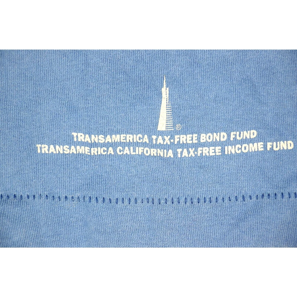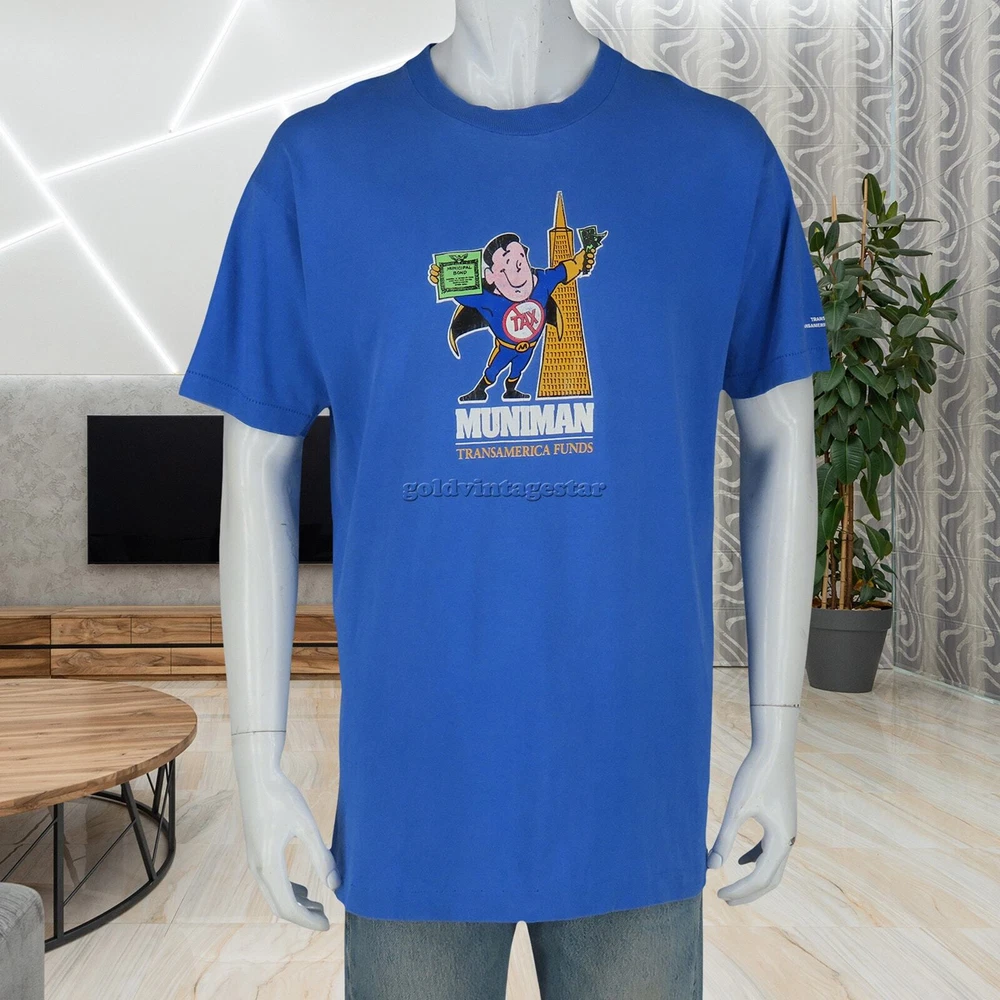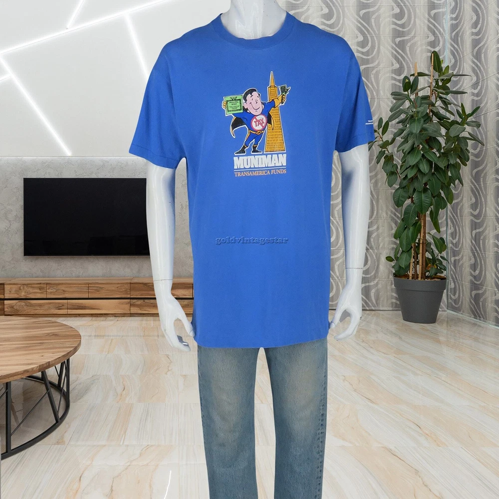 Unveil the essence of street art with our Muniman Transamerica Tee, merging vintage allure and modern casual comfort. This L-size tee captivates with its playful pop culture iconography, transforming everyday wear into wearable art. Its graphic storytelling and unique minimalist design promise a distinctive urban casual look, ready to weave narrative threads into your wardrobe. Capture these moods: urban simplicity, eclectic art, casual narratives, unique flair, everyday artistry. Material:100% cotton made in USA color: faded sky blue single stitch at sleeves and bottom hem condition: 3 pin sized holes, hole on one of the armpits, the print has cracks size on tag: XL fits like: L mannequin is 6' 2" and a size medium length (from the front on either side of the collar down to the bottom edge): 30 armpit to armpit: 22 all measurements are in inches and taken with the garment laying flat any major defect will be mentioned and/or photographed 13795