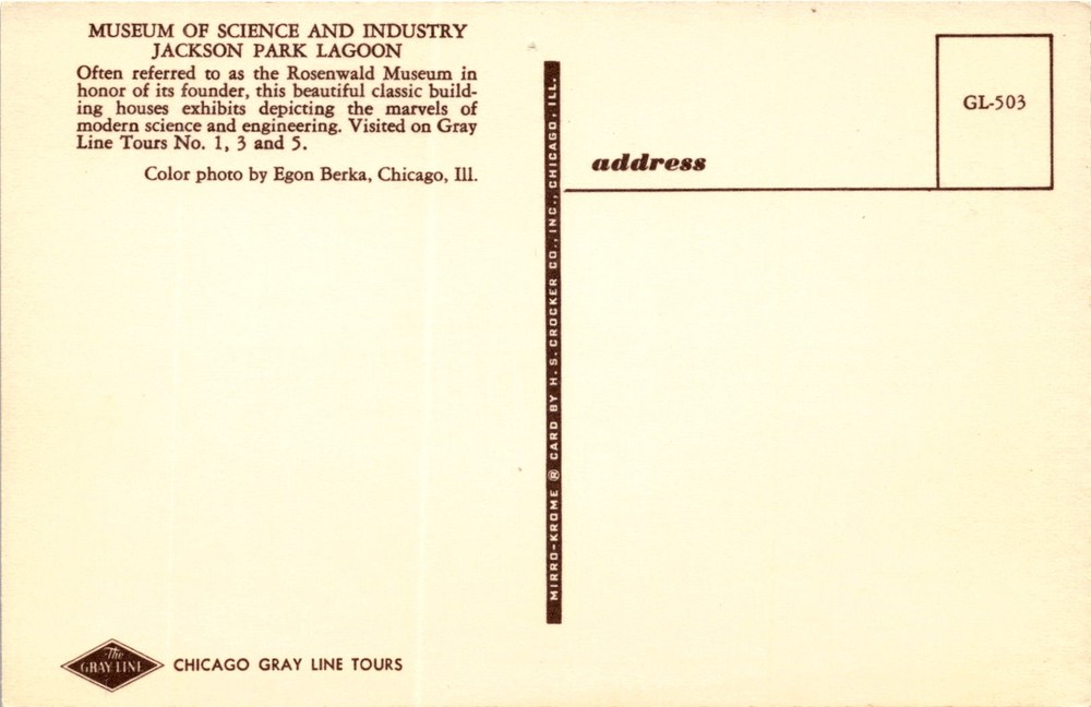 MAKE AN OFFER. THE MORE YOU BUY THE BETTER DEAL I WILL ACCEPT The postcard features a color photo of the Museum of Science and Industry located in Jackson Park Lagoon in Chicago. The museum is often referred to as the Rosenwald Museum after its founder. It is housed in a beautiful classic building and showcases exhibits highlighting the wonders of modern science and engineering. The museum is a popular destination for visitors on Gray Line Tours No.