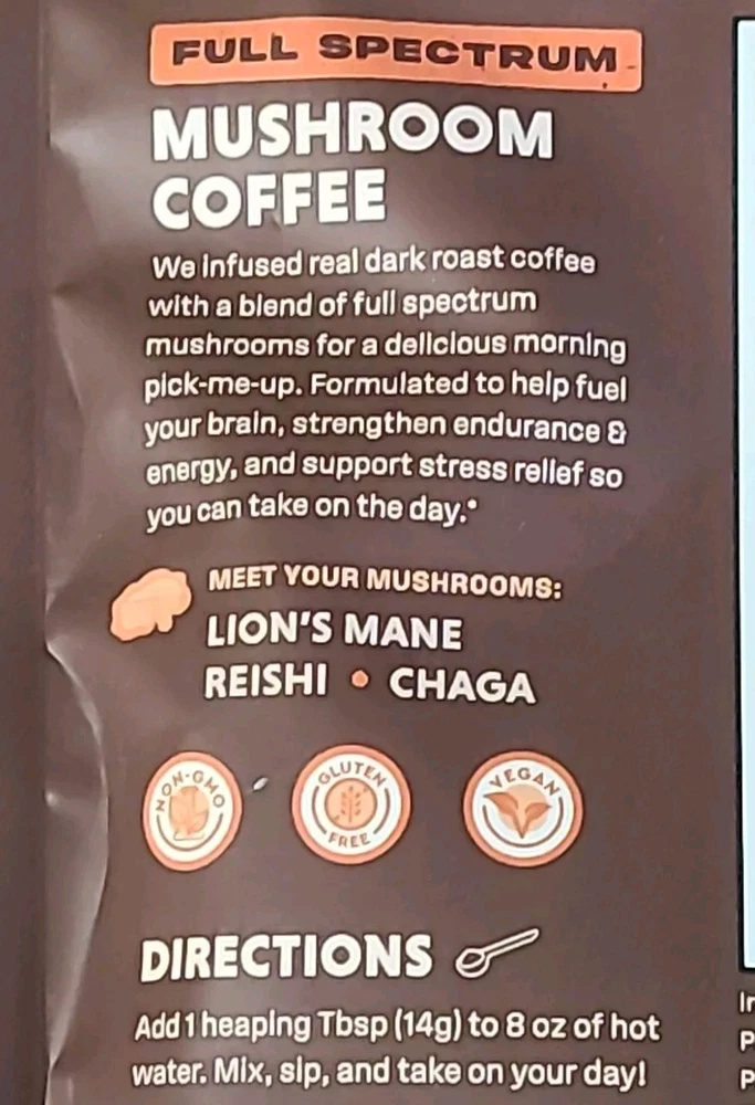 This is a 5 oz package of Ground Coffee from the brand 360 Nutrición. It is Mushroom Coffee with notes of chocolate, offering a full spectrum flavor. Each serving size is 1 cup, with 10 servings per package. The coffee has a dark roast and contains 50 calories per serving. The expiration date is 05/06/26, and it is manufactured in the United States.
