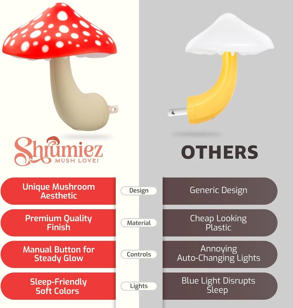 Whimsical Warmth: Light up your life with our led mushroom lamp! This quirky little buddy doesn’t just brighten your space; it brings cozy vibes and giggles, making every corner feel like a delightful hideaway. Playful Decor: Get ready for compliments with the enchanting mushroom lamp aesthetic! It’s like having a tiny piece of nature indoors, perfect for sprucing up your room and sparking joy with its fun, funky flair. Magical Sleep Sanctuary: Turn bedtime into a fairy tale with our enchanting mushroom night light! Its soft, inviting glow transforms any room into a dreamy sanctuary, helping little ones drift off to sleep with comforting warmth and a sprinkle of magic. Adorable Nighttime Companion: Meet your child's new nighttime pal: the cute plug-in night light! This charming little mushroom brings comfort and cheer, making nighttime a breeze and chasing away those pesky shadows with a smile. Enchanting Glow: Bring a sprinkle of magic into your evenings with our night light mushroom! Its whimsical light creates a dreamy ambiance, turning every night into a cozy escape where imagination can roam free and adventures await. Product Description Discover our Mushroom Collection Ideal as Magical light for bedtime Cosplay hat, rave hat Coffee & tea mug Succulent pot, flower pot Home decor Cute wall hook for coat, bags Boho decor counterpiece Material Plastic Faux fur & corduroy Ceramic Ceramic Cotton Resin Ceramic Perfect Gift Idea ✔ ✔ ✔ ✔ ✔ ✔ ✔ Cottagecore/Bohemian Aesthetic ✔ ✔ ✔ ✔ ✔ ✔ ✔ Sustainable Material ✔ ✔ ✔ ✔ ✔ ✔ ✔